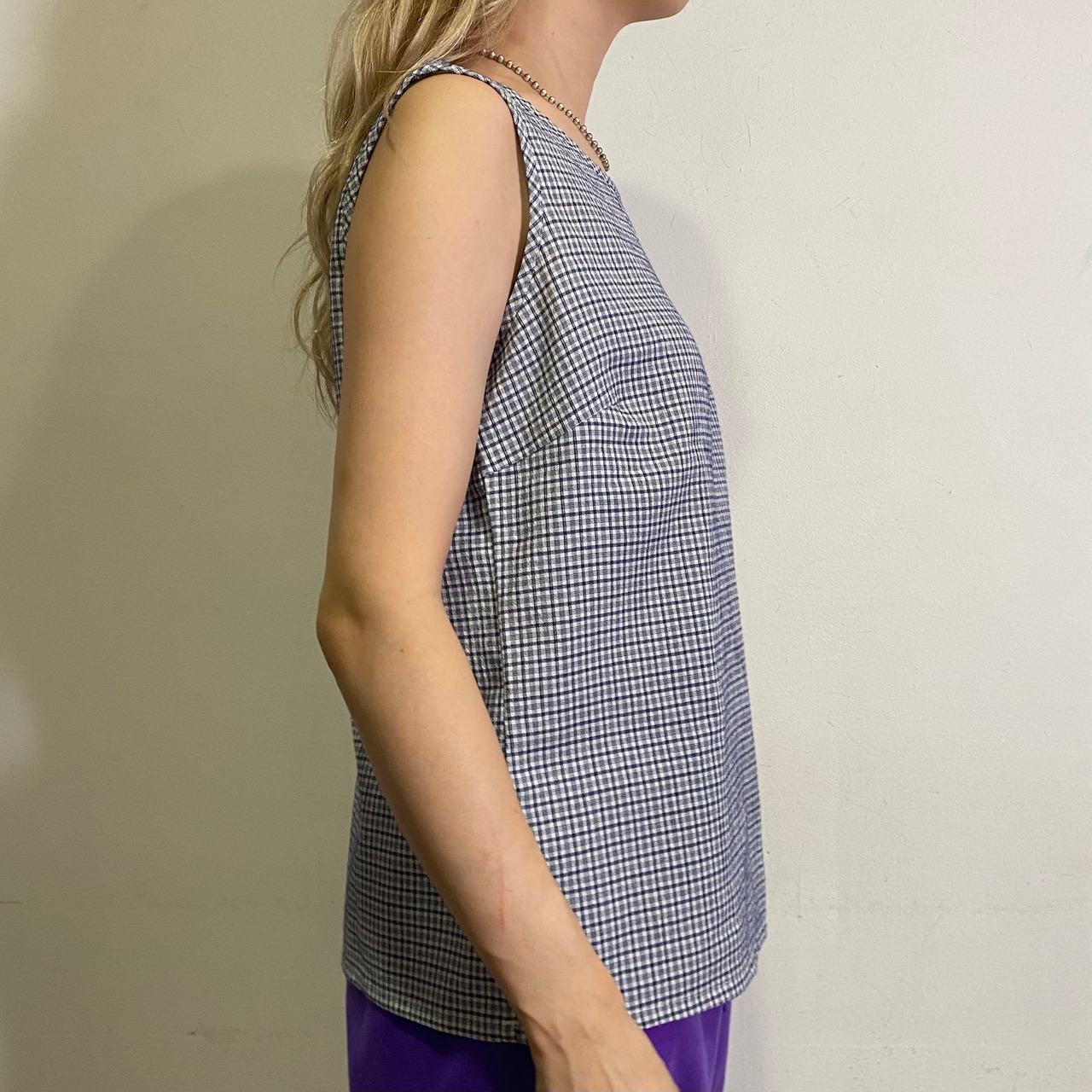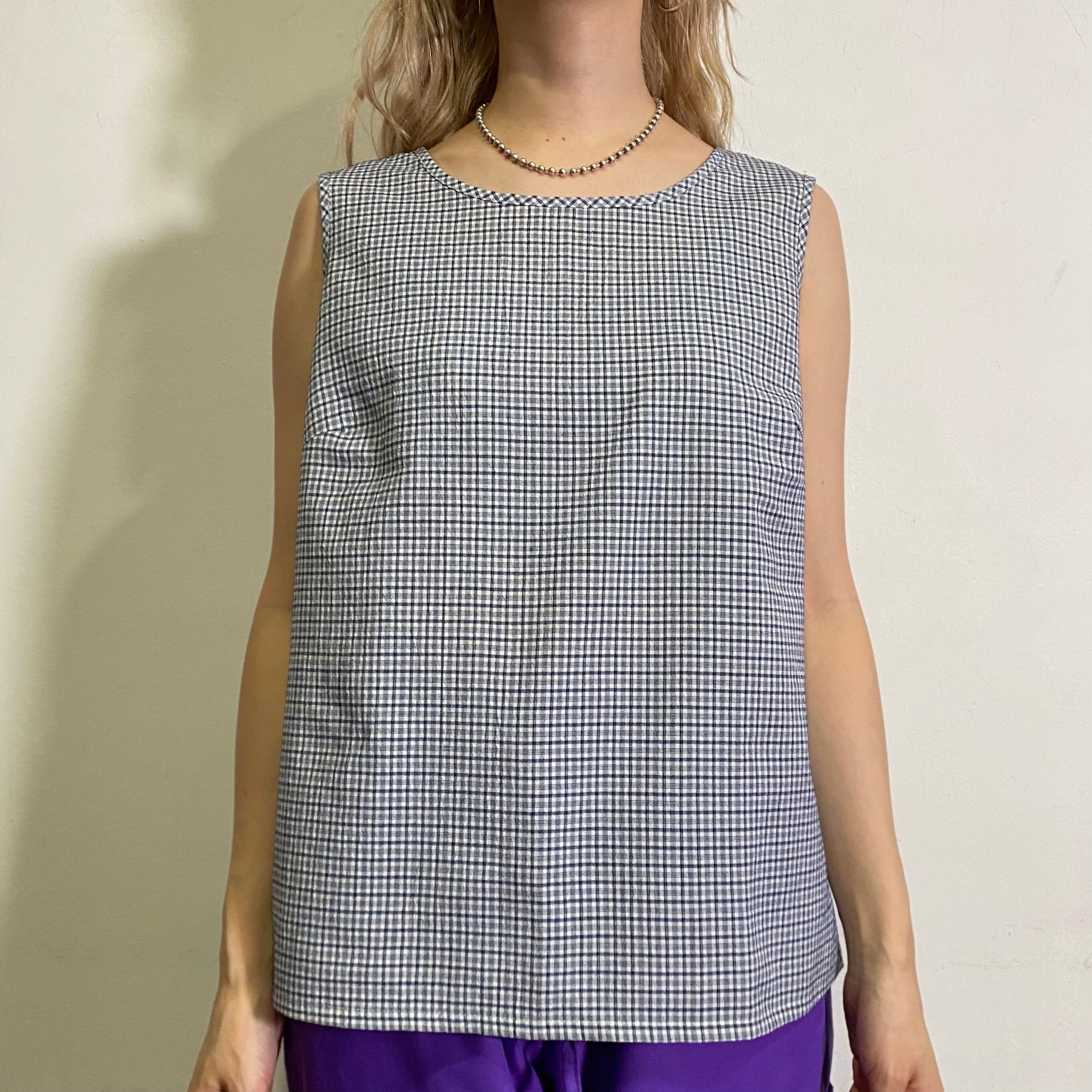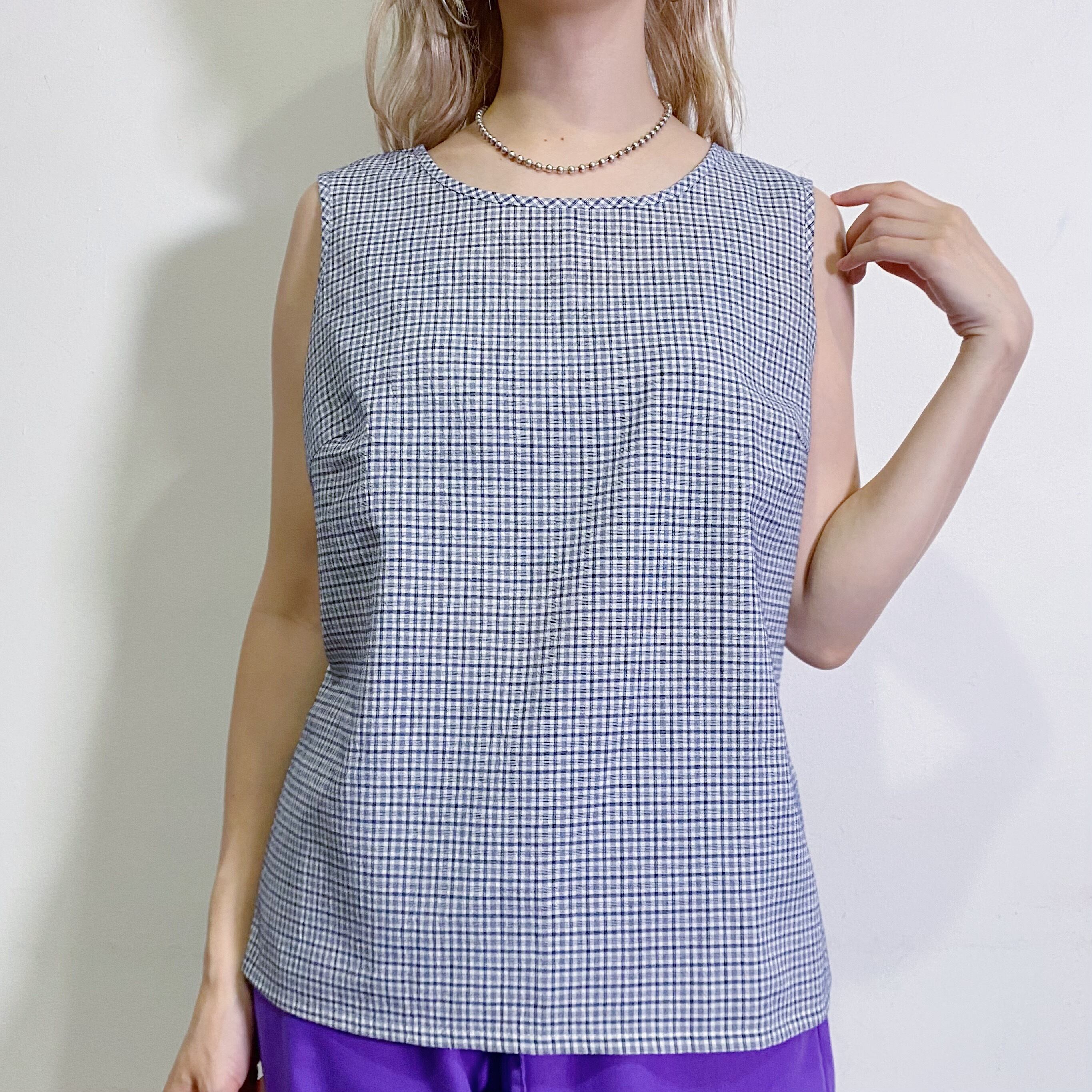 ネイビーとホワイトのチェック柄が可愛い、ノースリーブトップスです。