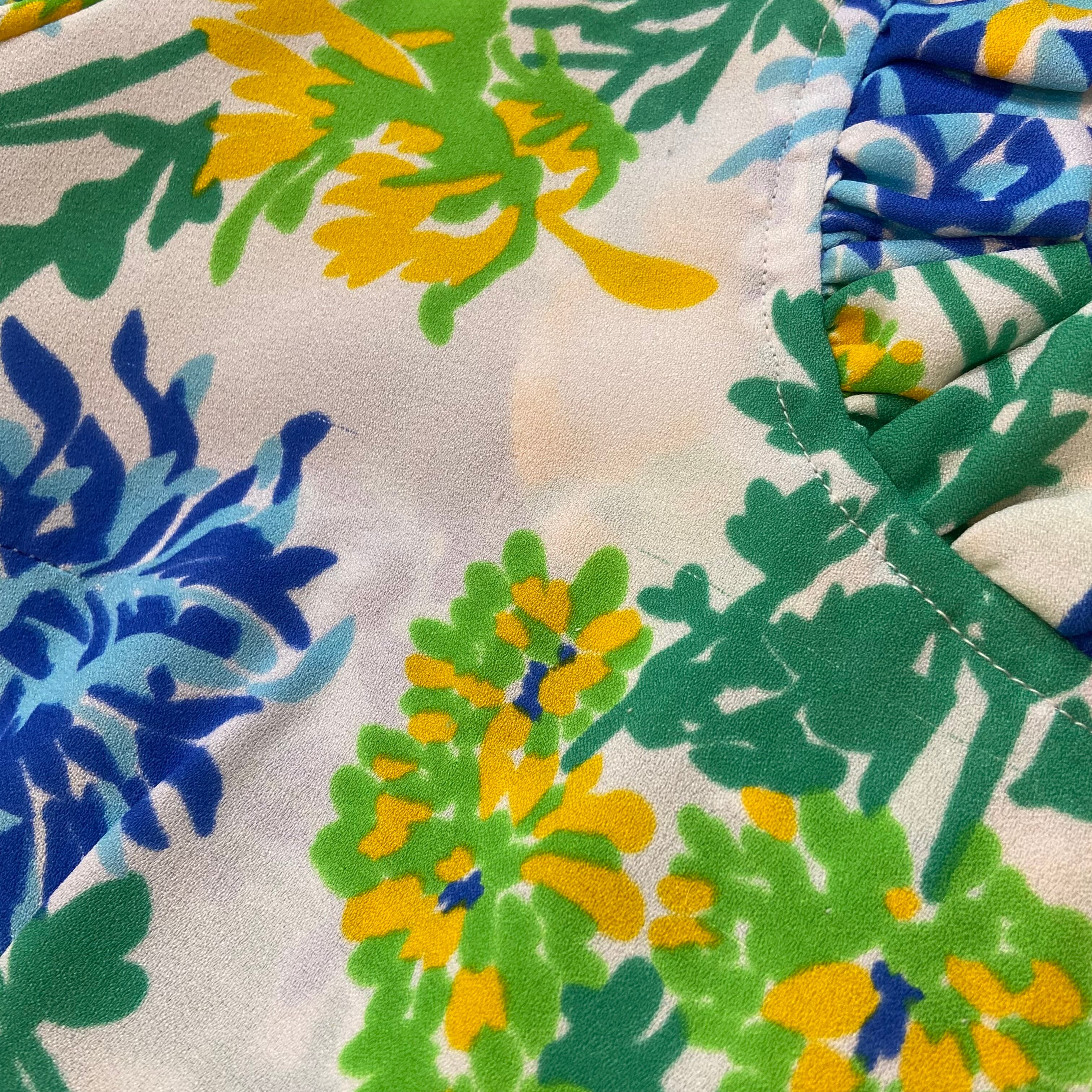 グリーンやブルー・イエローなどの花柄の色合いが素敵な、60~70年代のロングワンピースです。