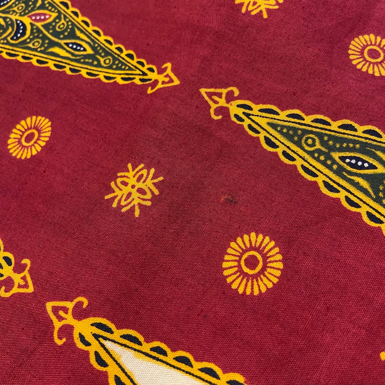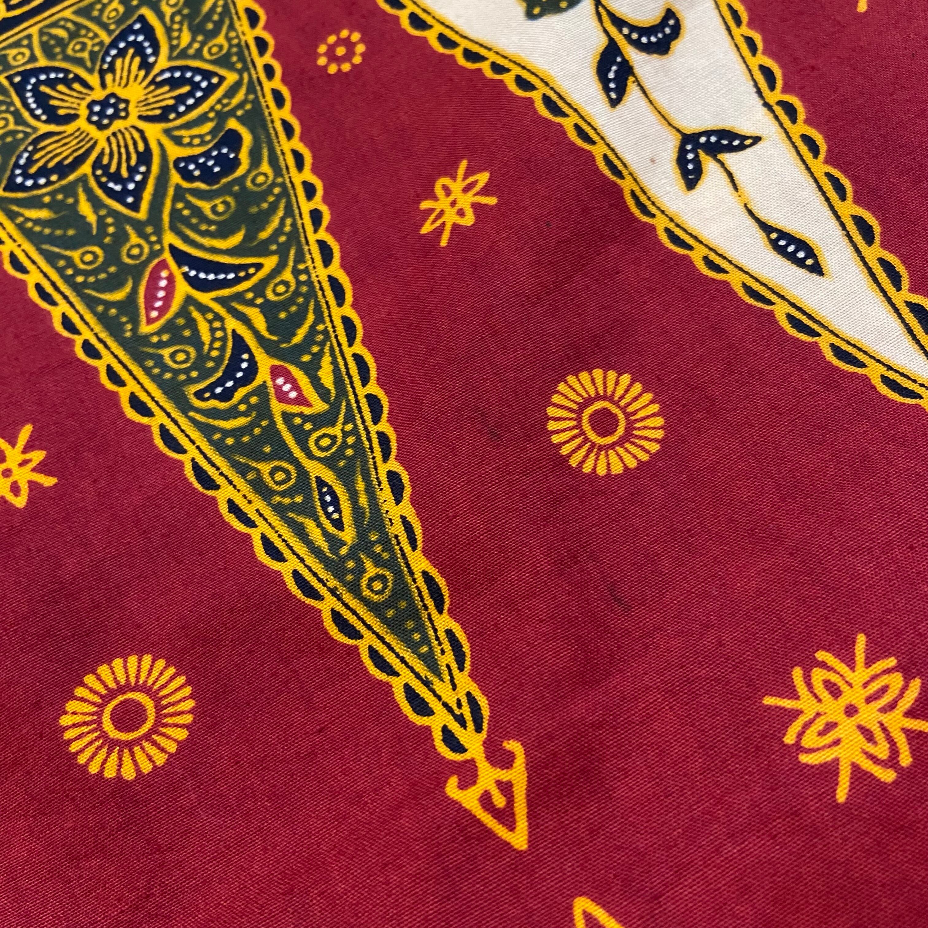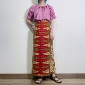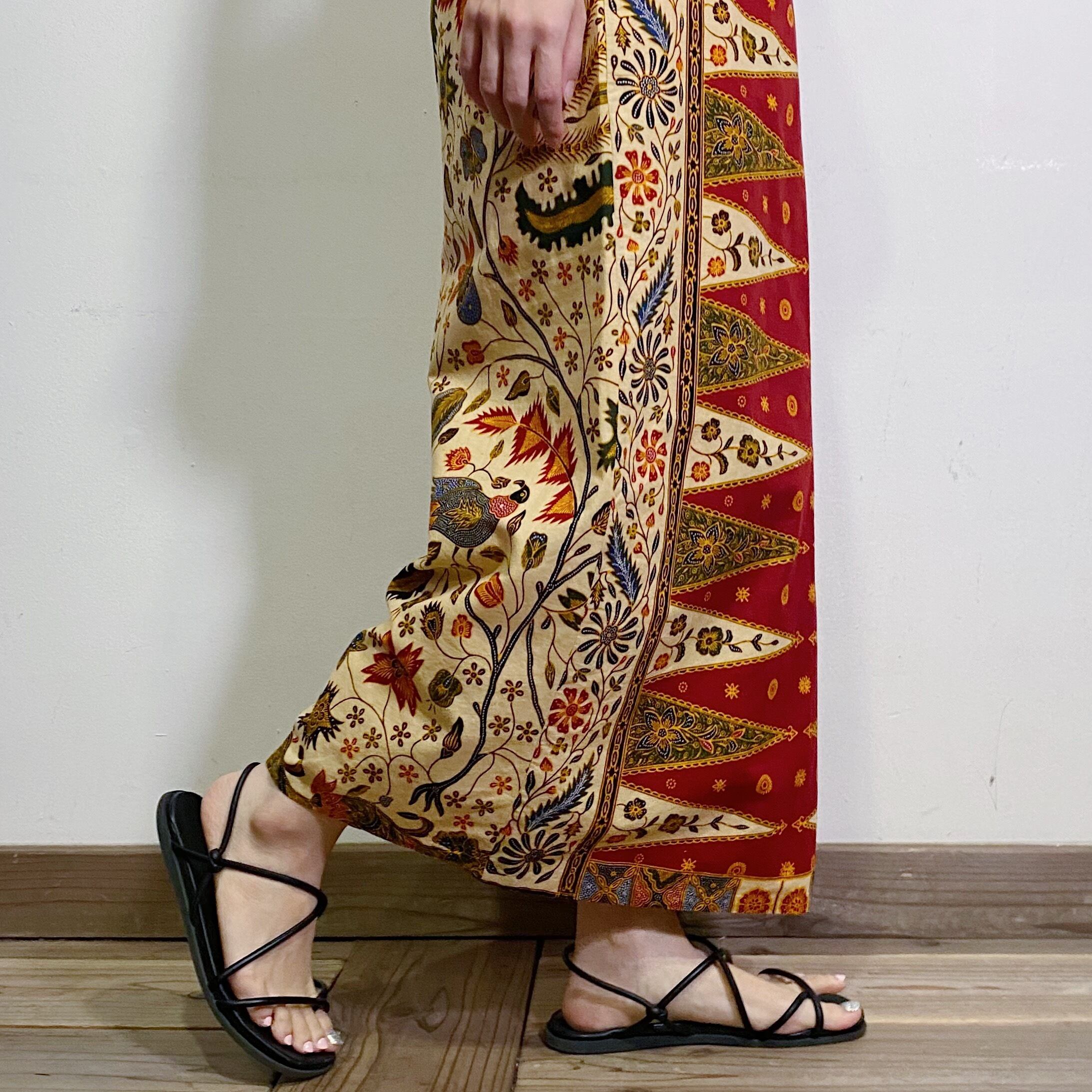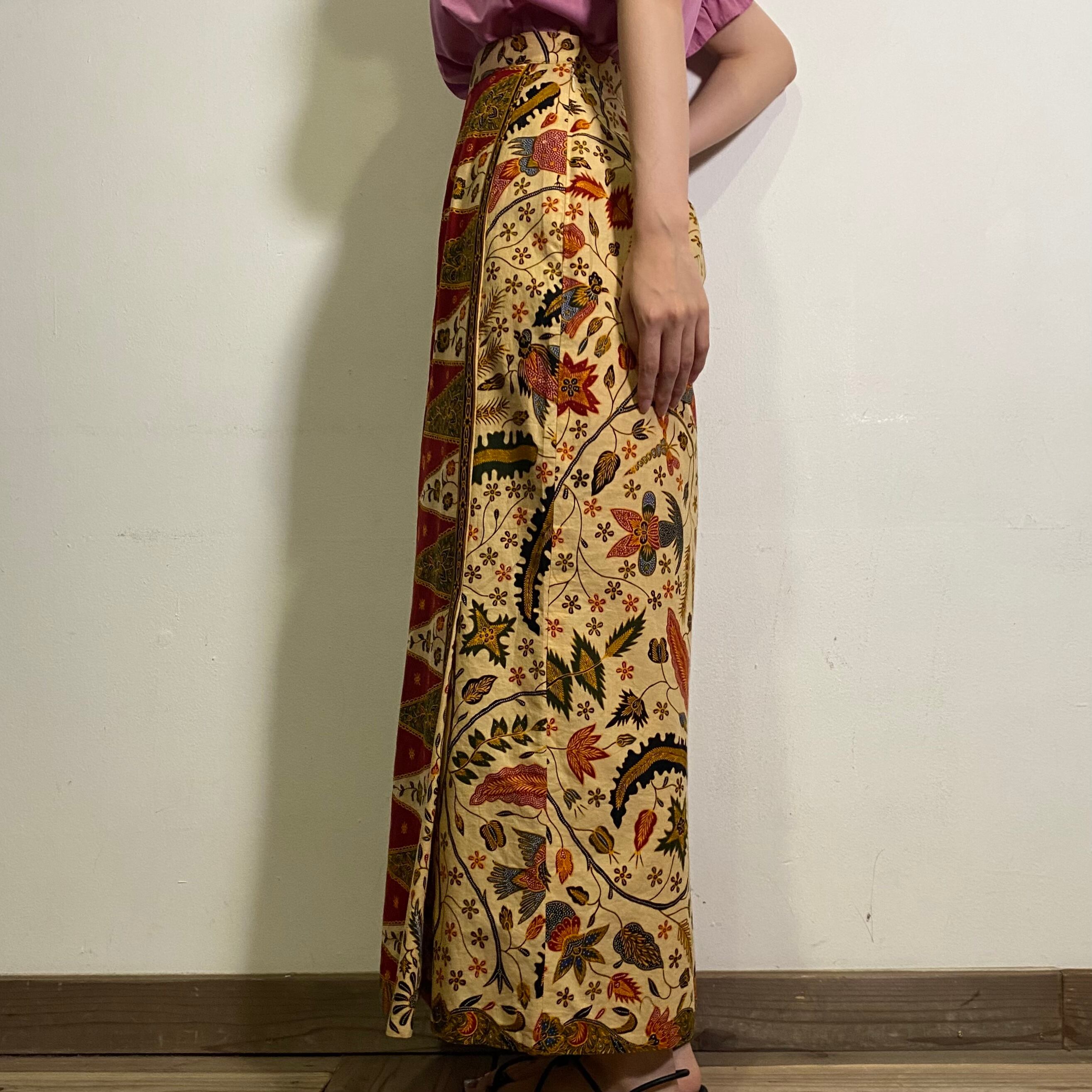 前と後ろで柄の見え方が違うデザインが素敵で、ラップ風のようなつくりになっており、裾がスリットのように二重になっているのもポイント。