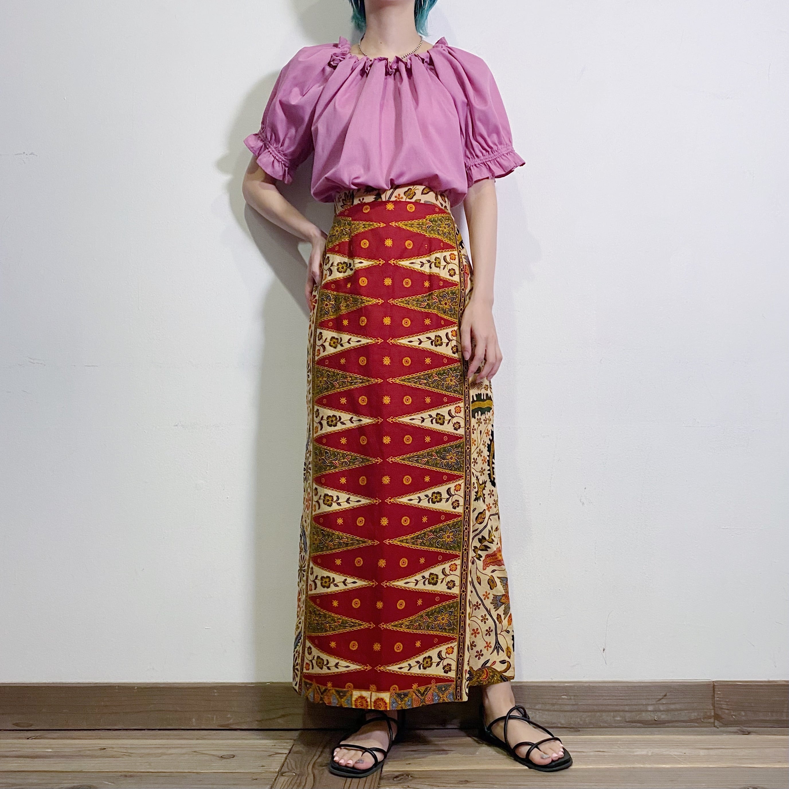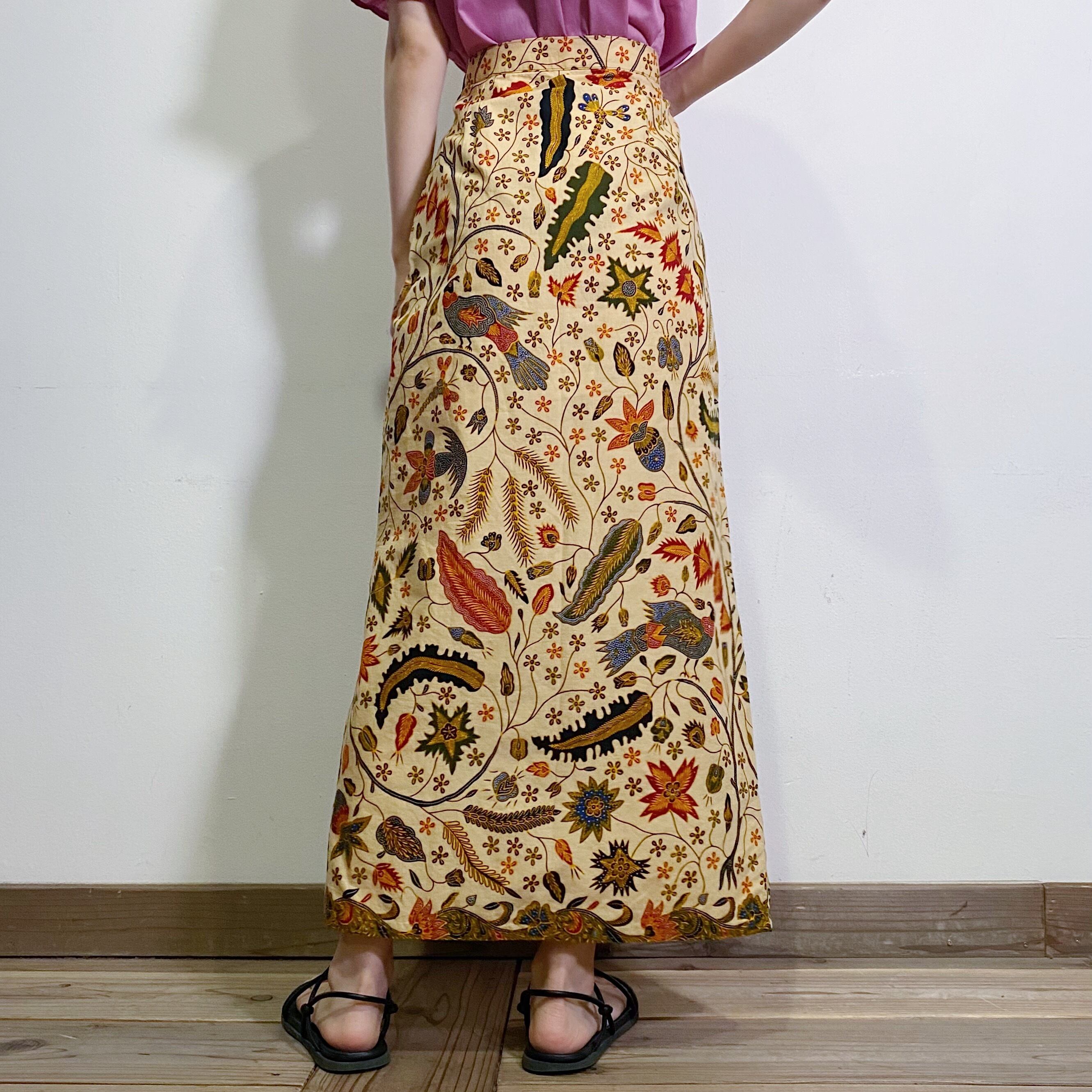 お花や鳥のエスニックな柄が可愛い、70年代のロングスカートです。