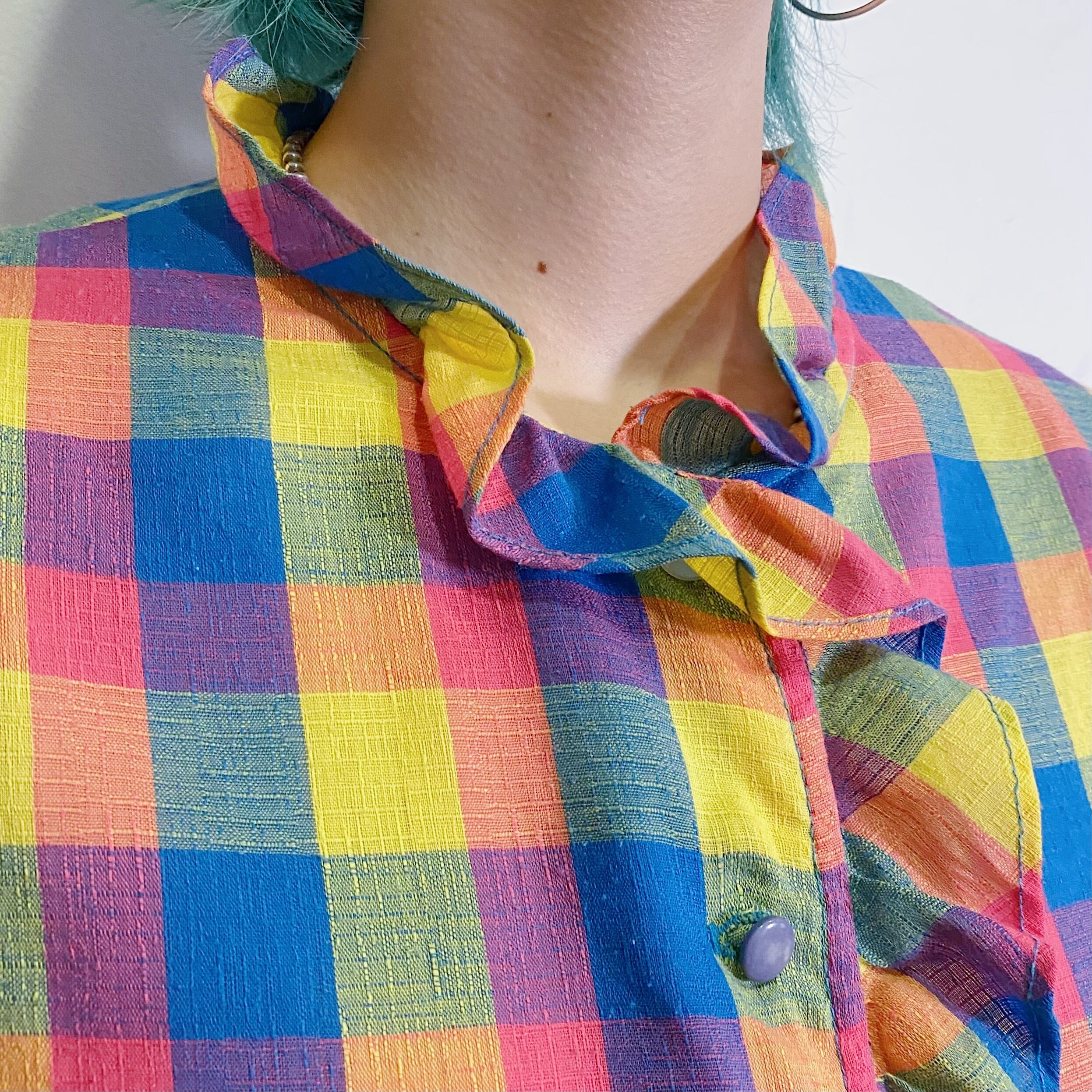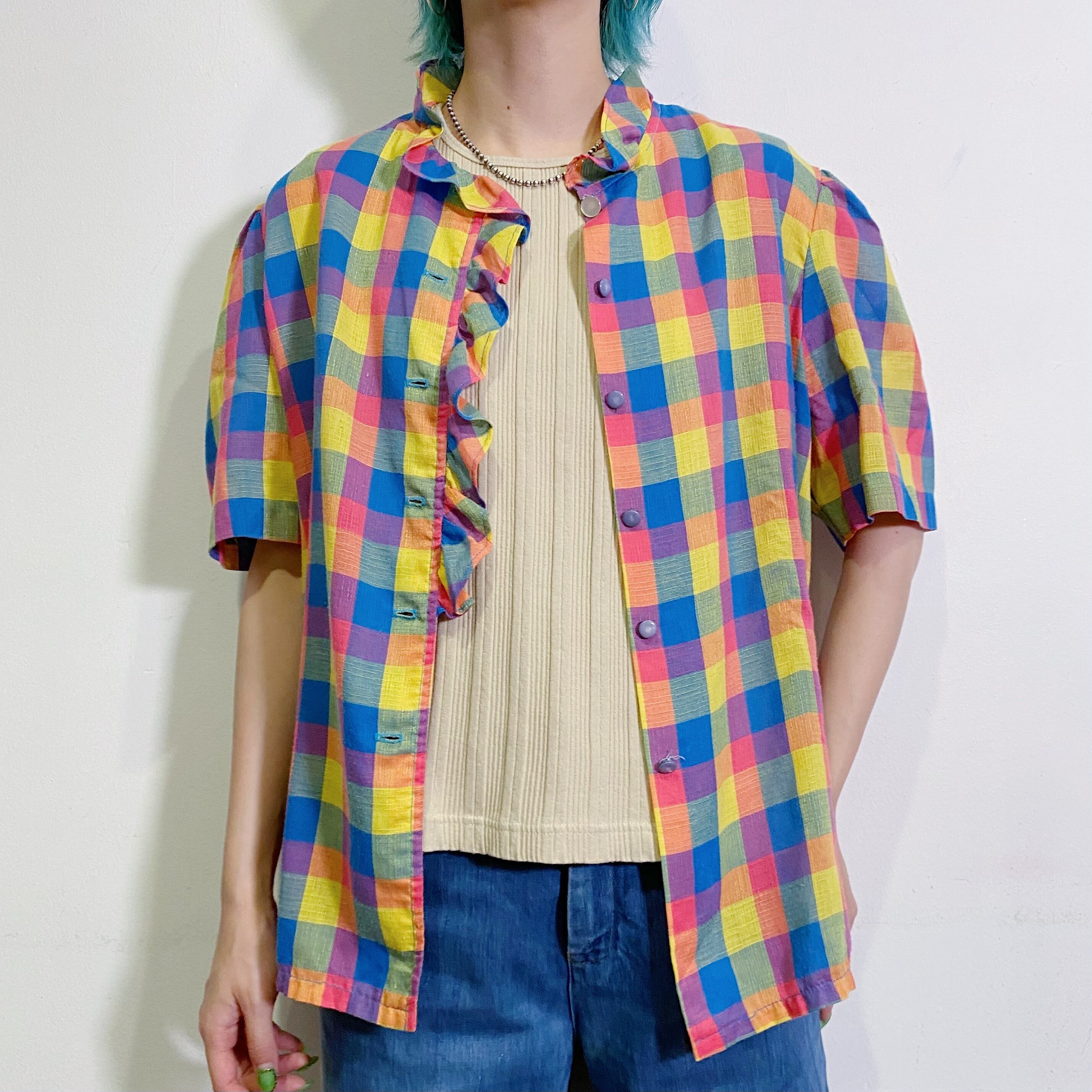 首まわりや胸元のフリルが可愛い、70年代の半袖シャツです。
