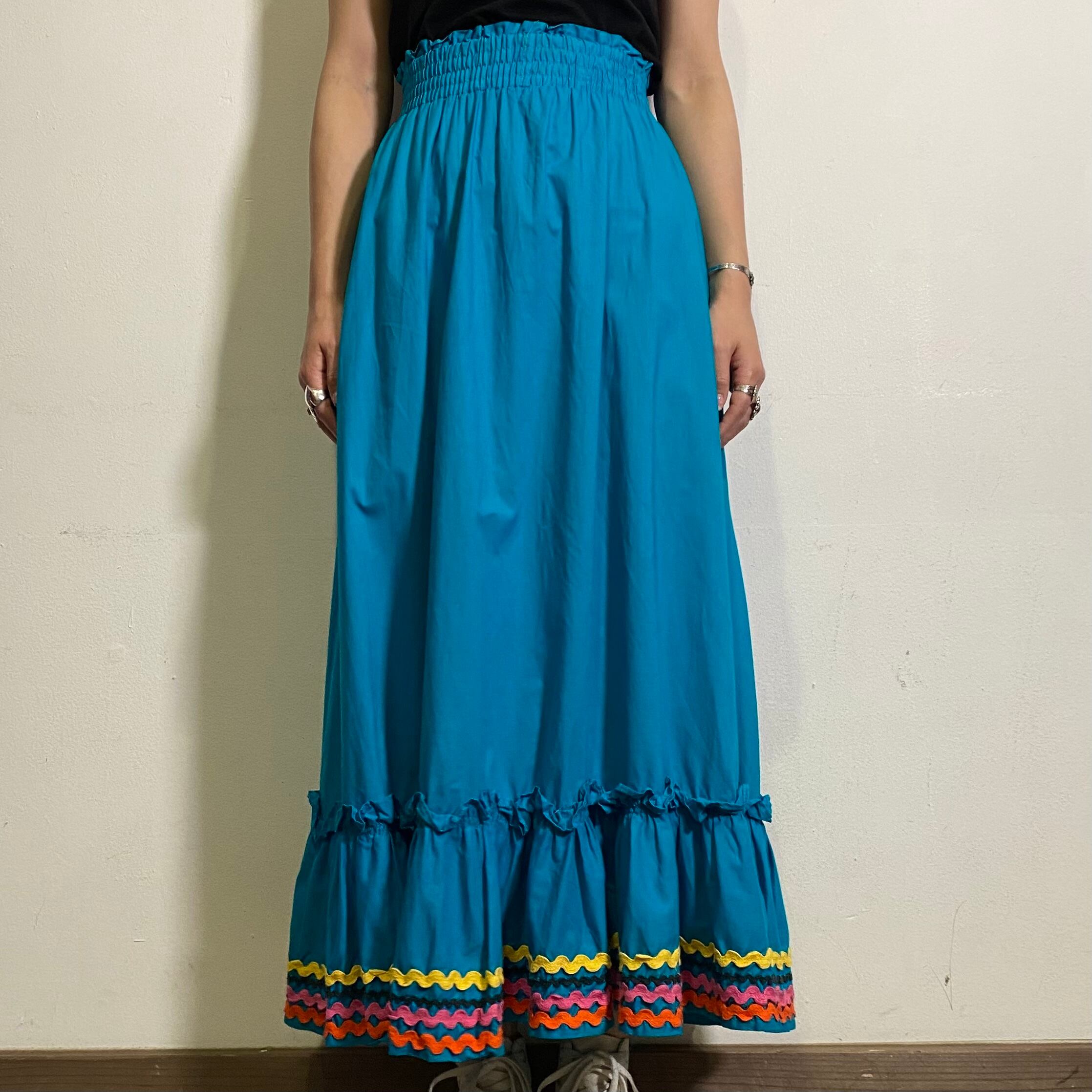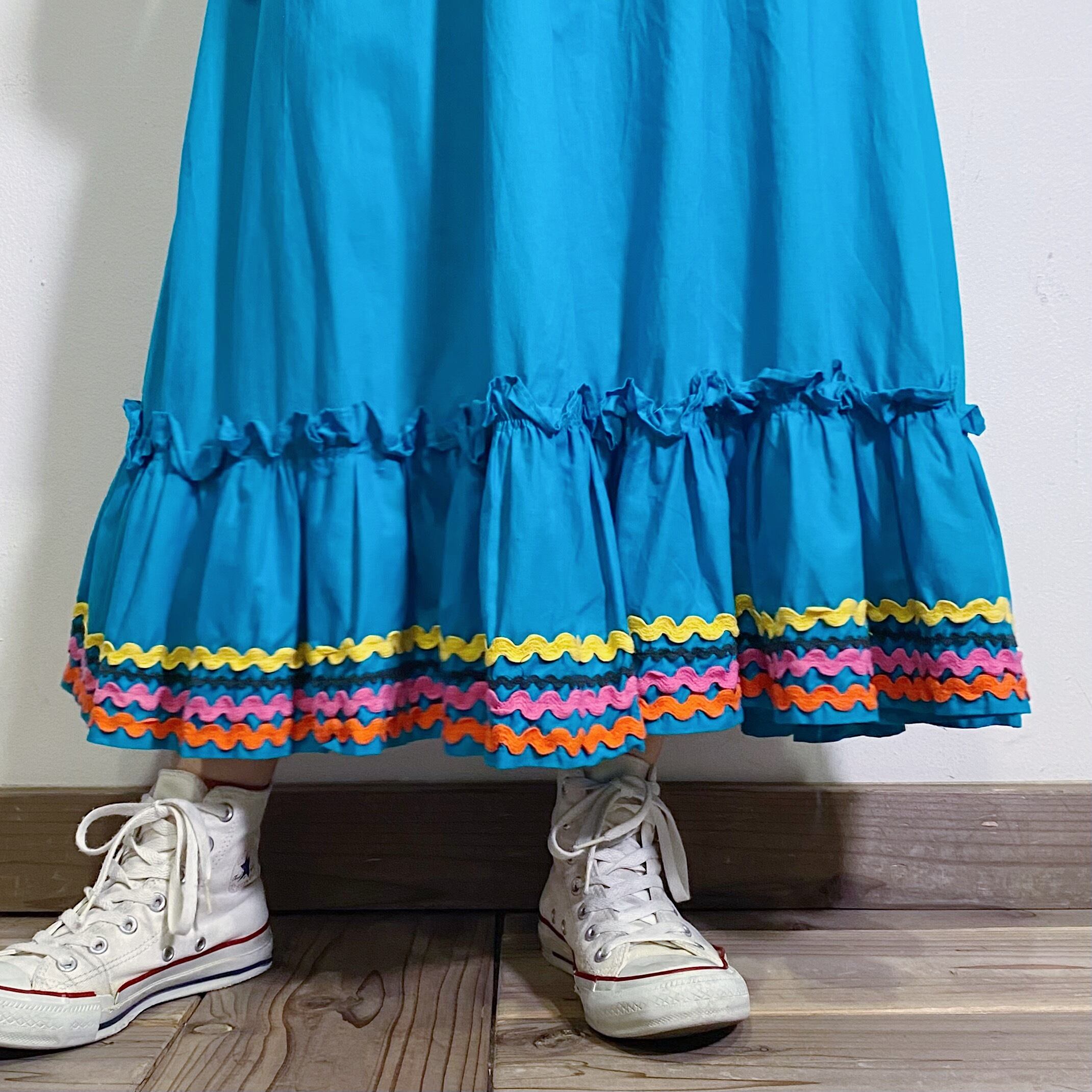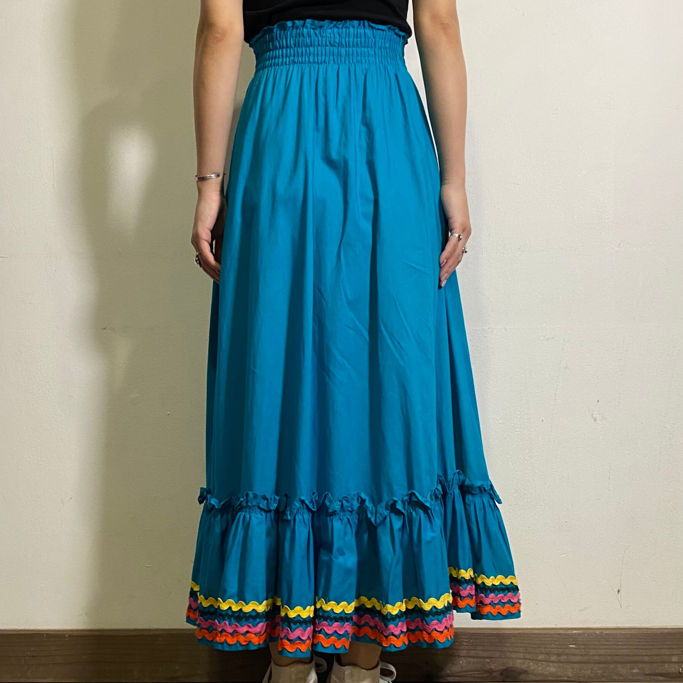鮮やかなターコイズとカラフルな山道テープが可愛い、80年代のスカートです。