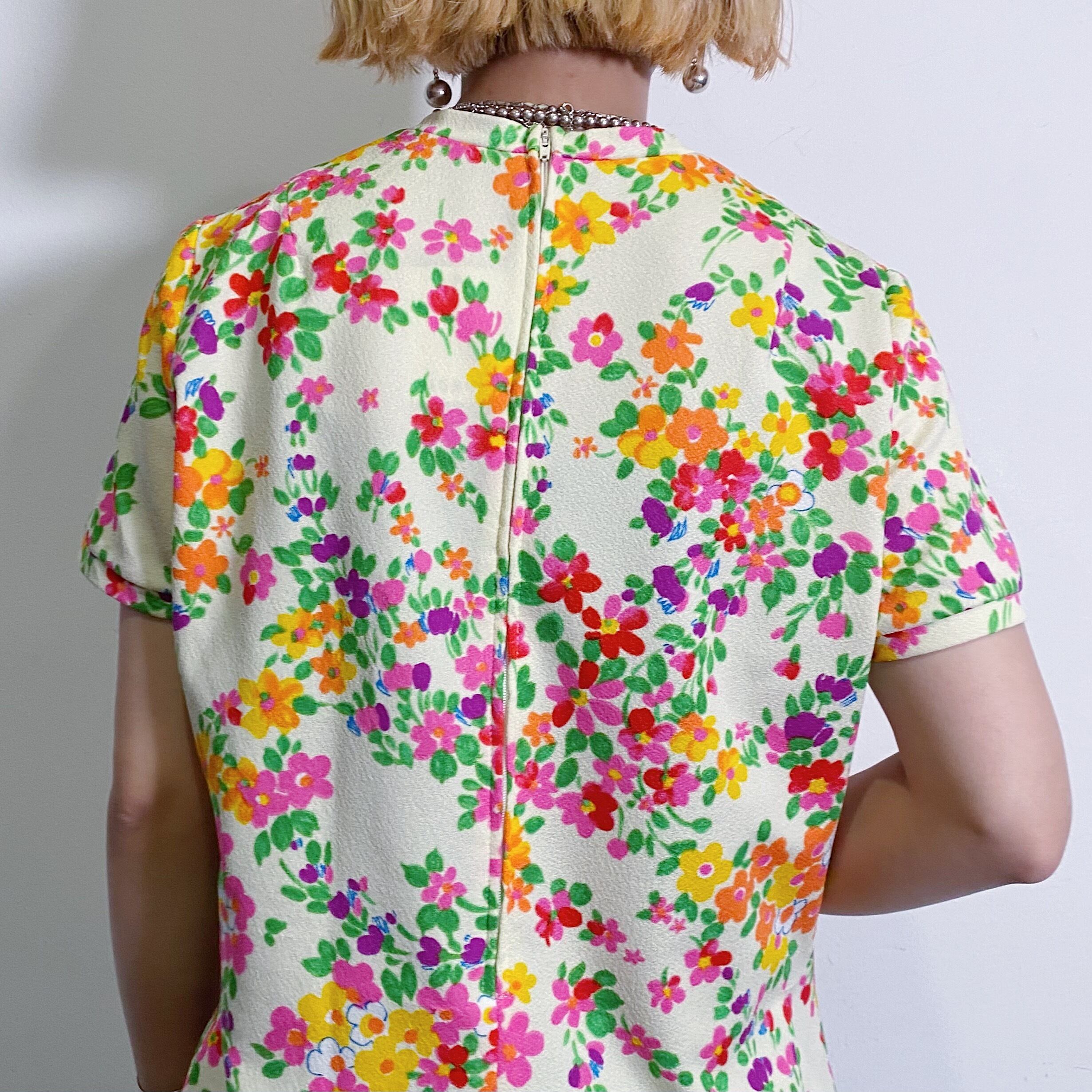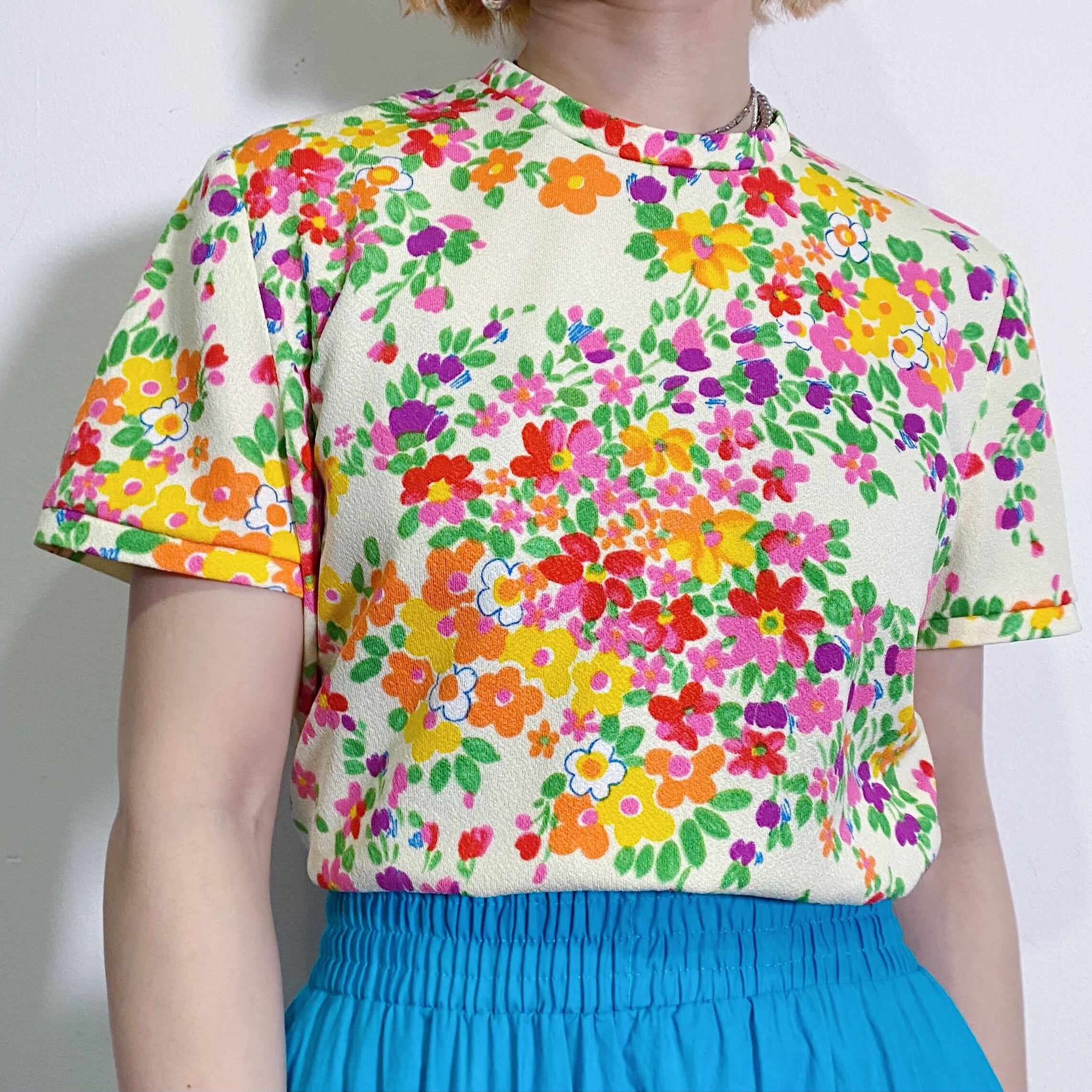淡いイエローベースにカラフルな花柄が可愛い、70年代の半袖トップスです。