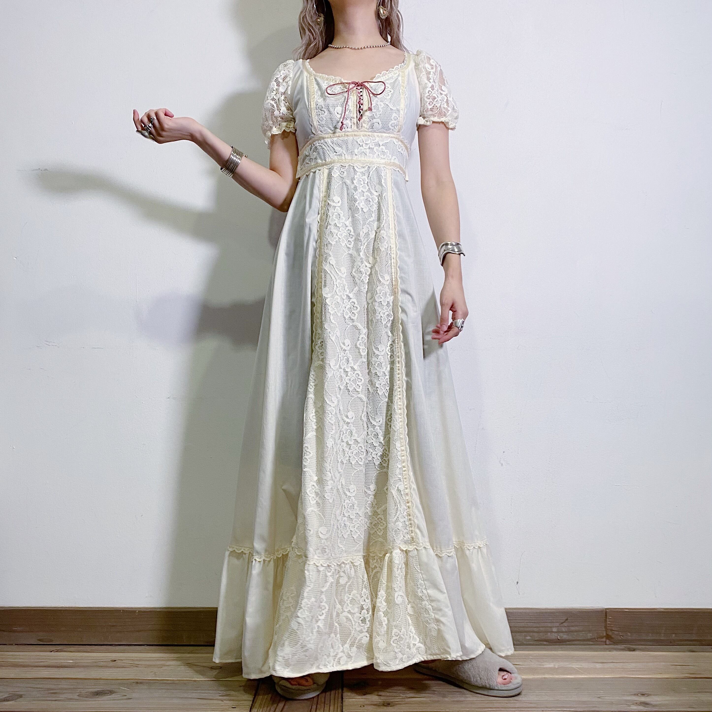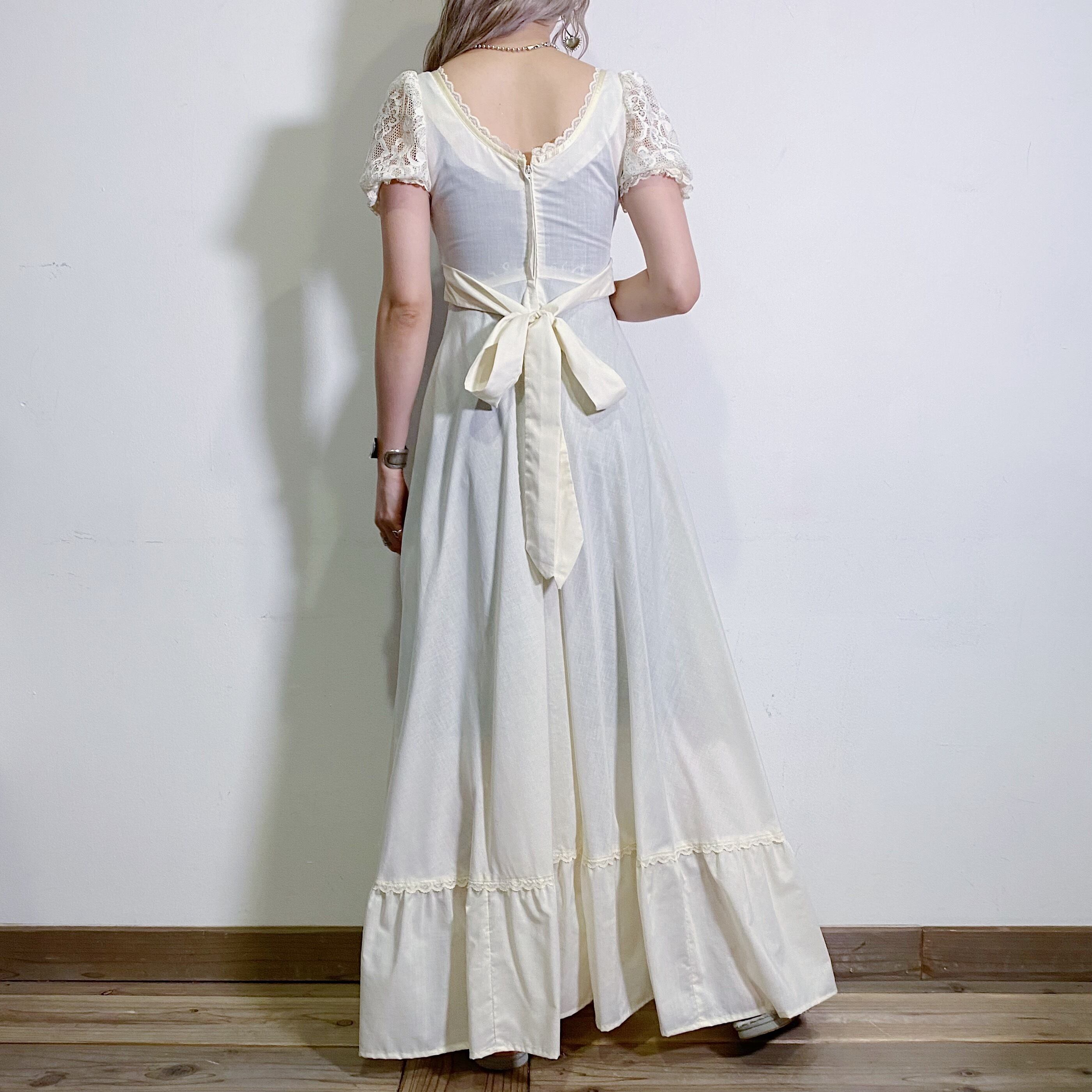 少しキナリがかった生地にたっぷりなレース使いが素敵な、70年代のロングワンピースです。