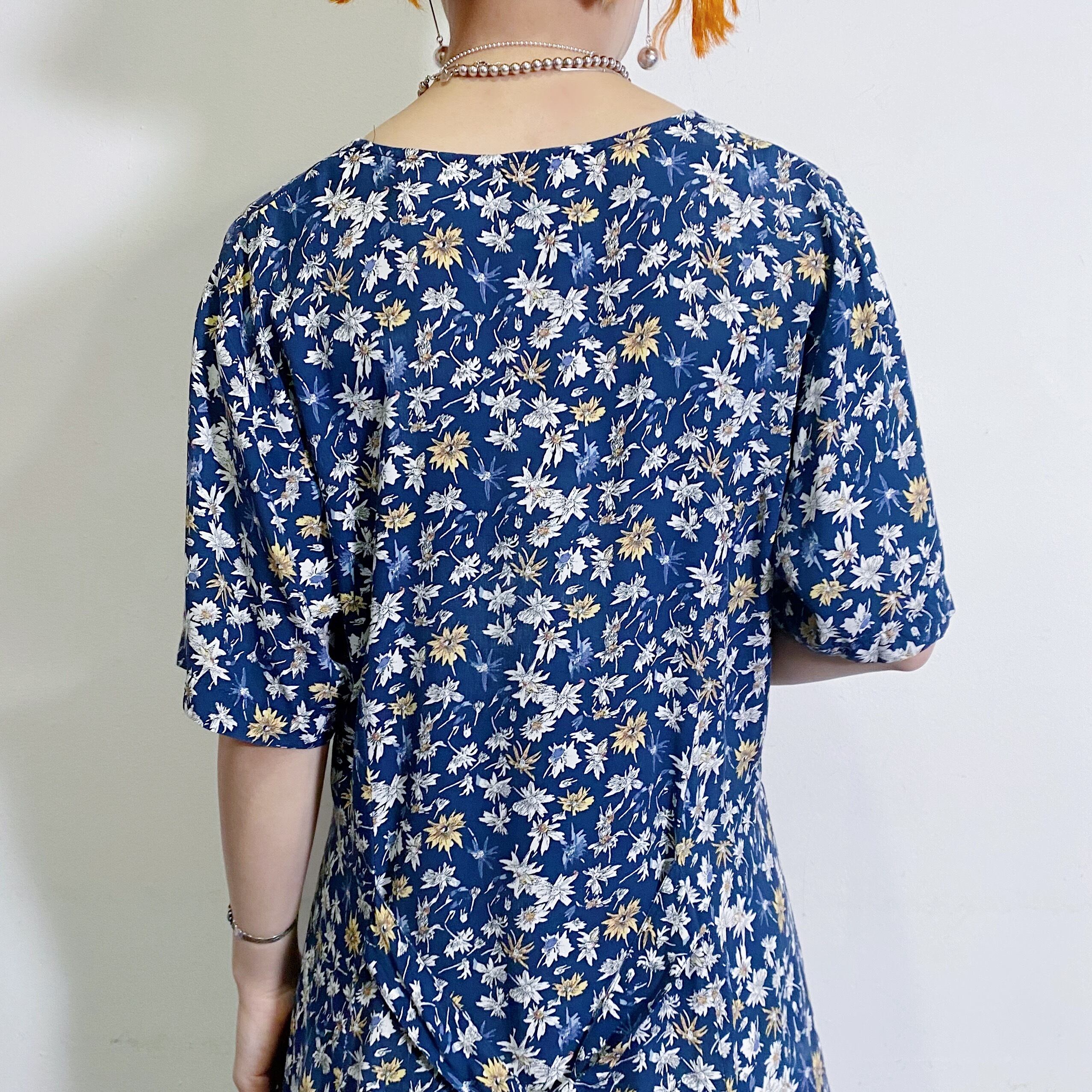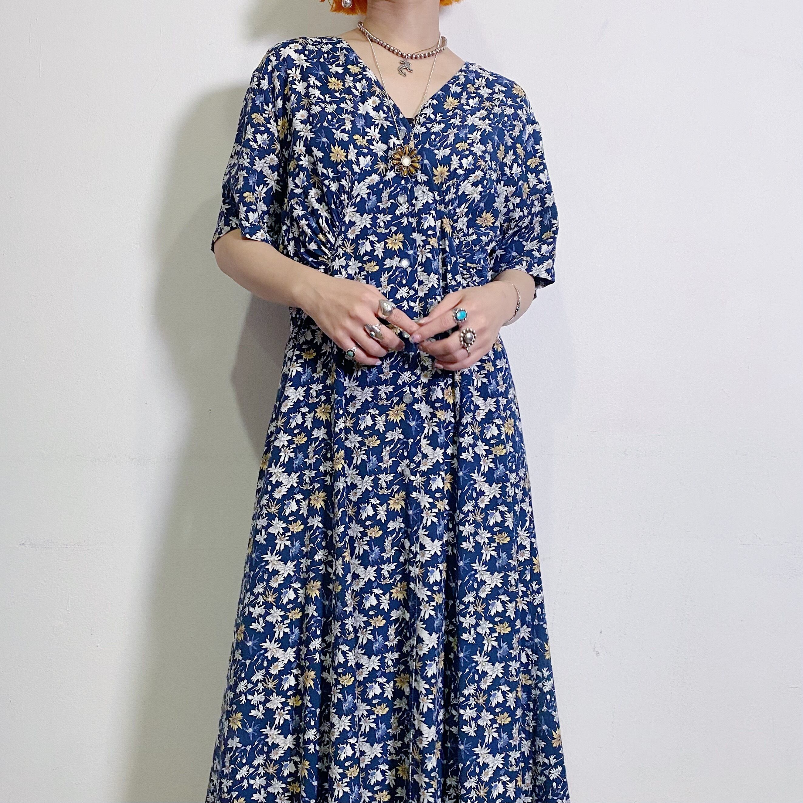 ネイビーベースにホワイトやイエローの小花柄が可愛い、90年代のロングワンピースです。