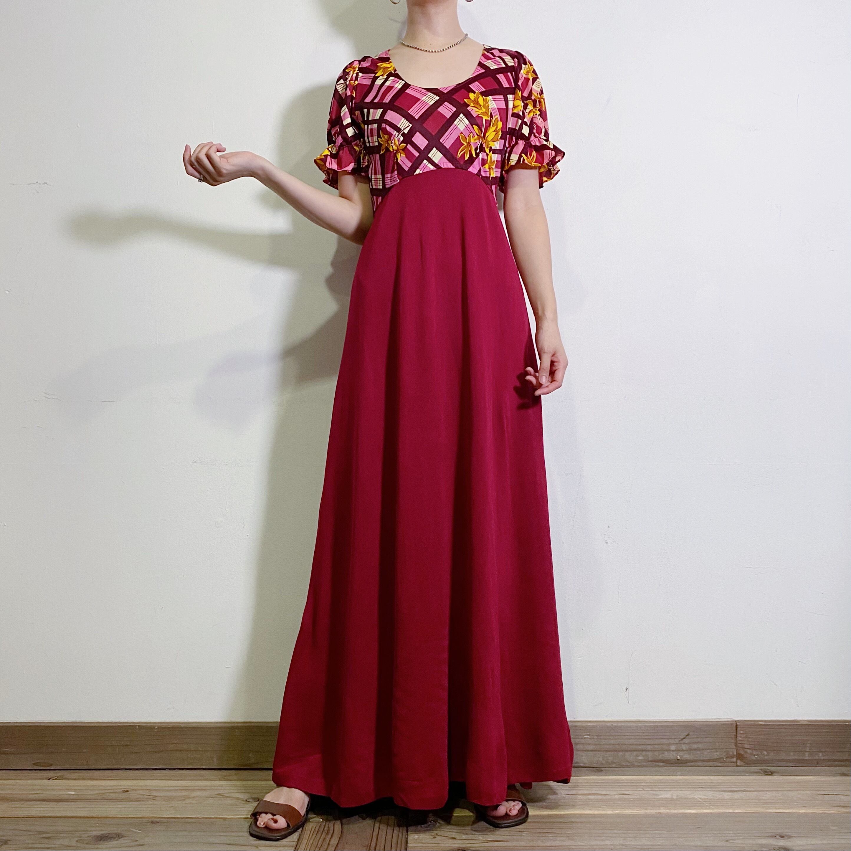 チェック柄とお花の組み合わせが可愛い、60年代のロングワンピースです。