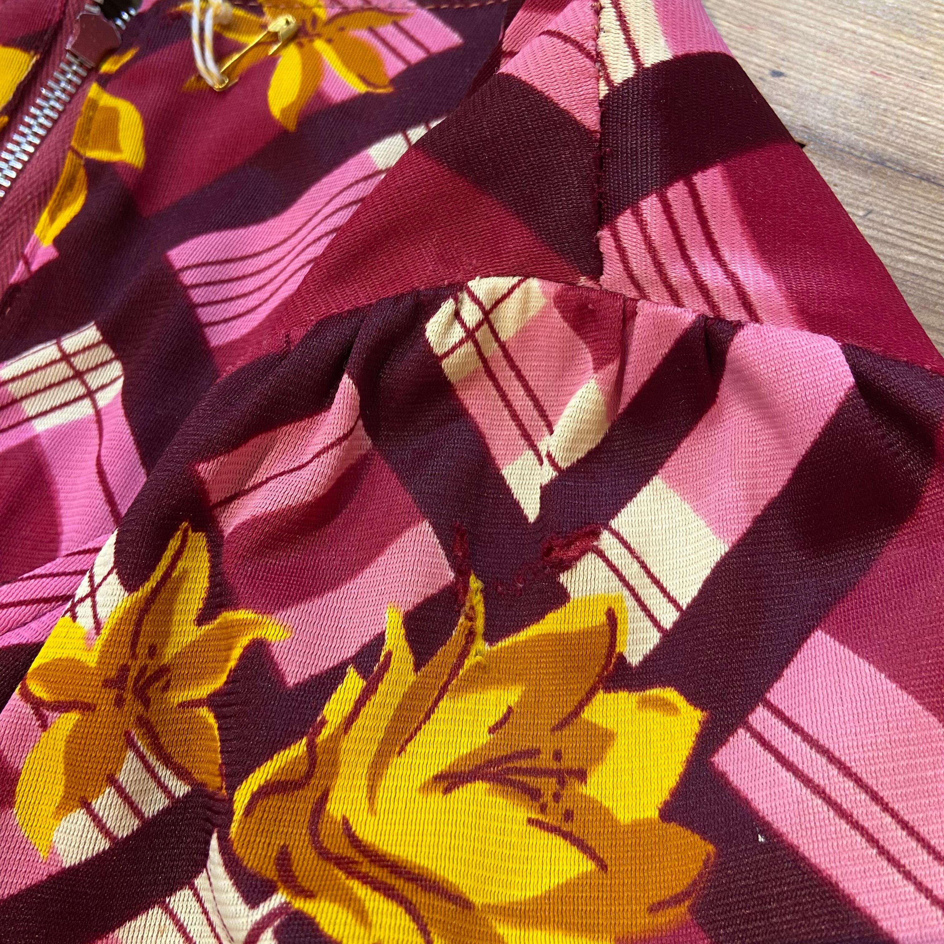 ボルドー・ピンク・イエローの色味も絶妙で、お袖のフリルもキュートな一枚。