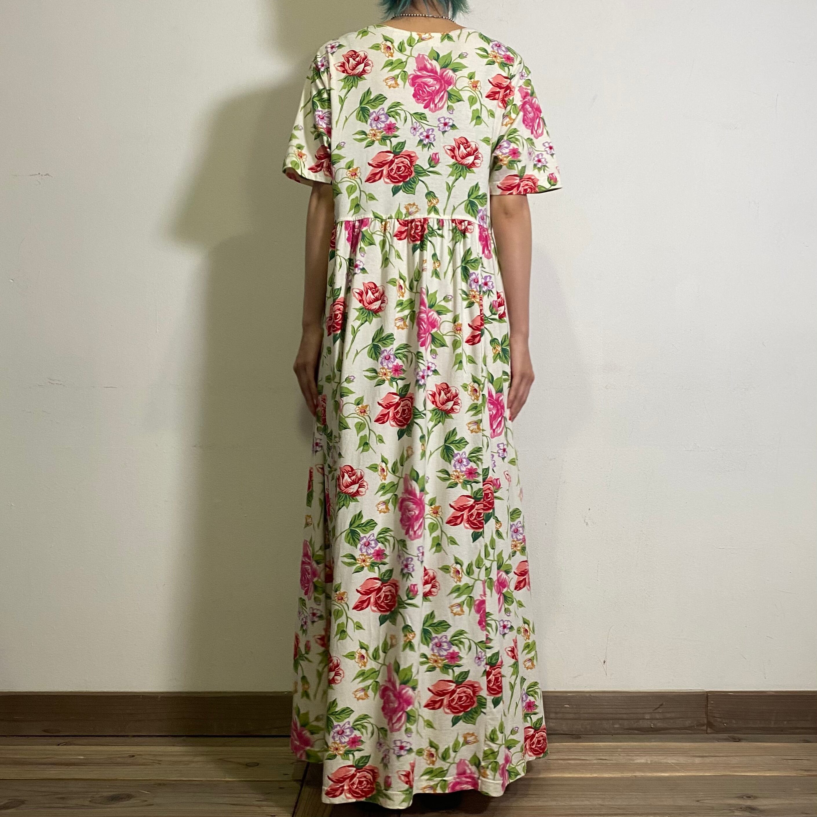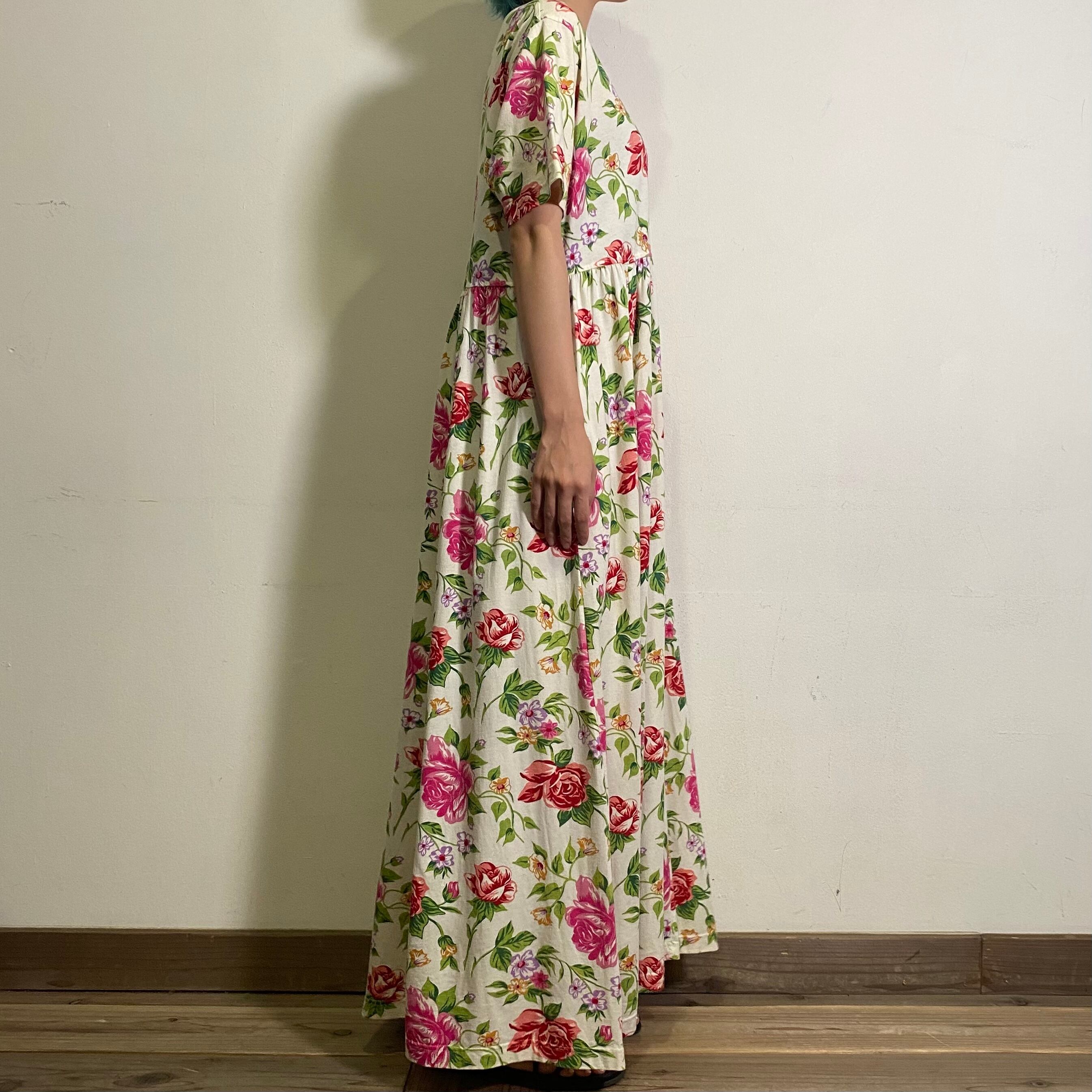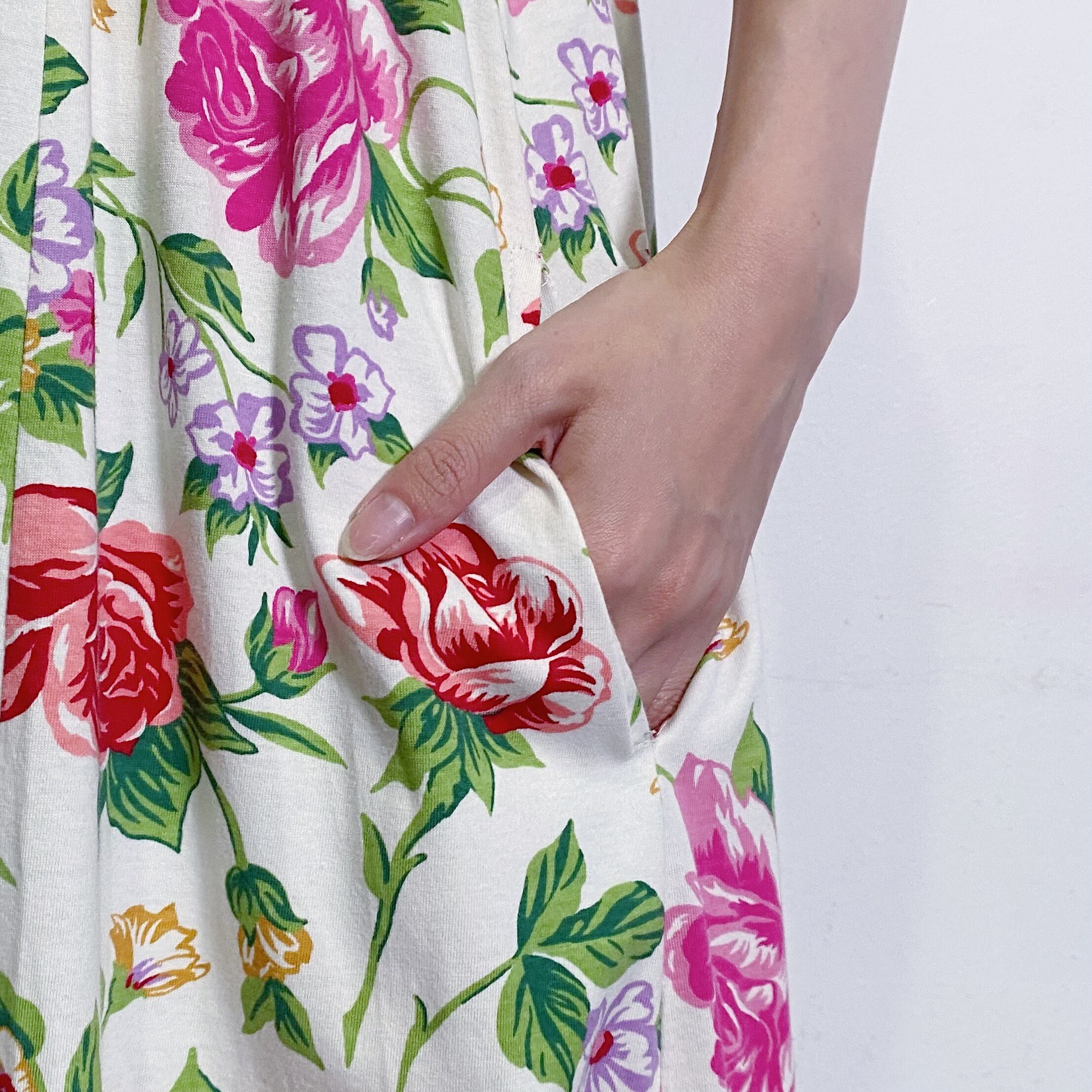 ホワイトベースにピンクや赤の花柄が可愛い、90年代のワンピースです。