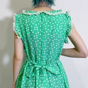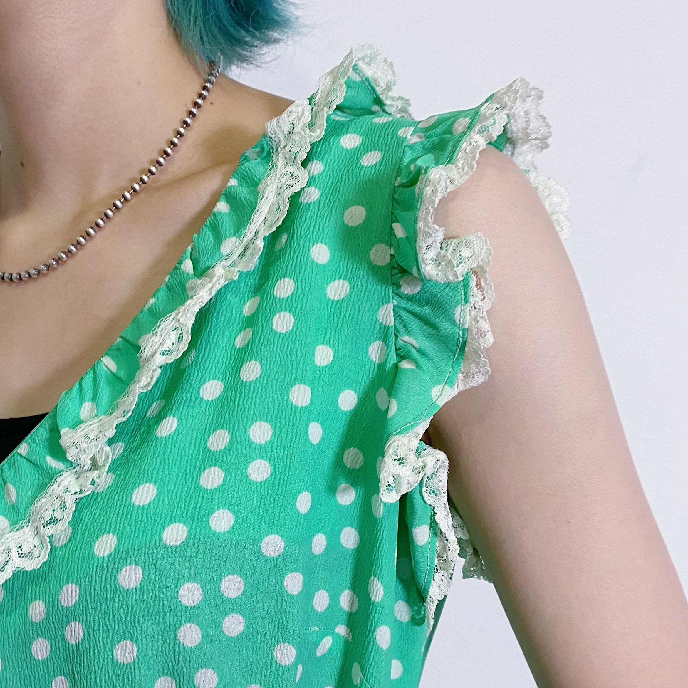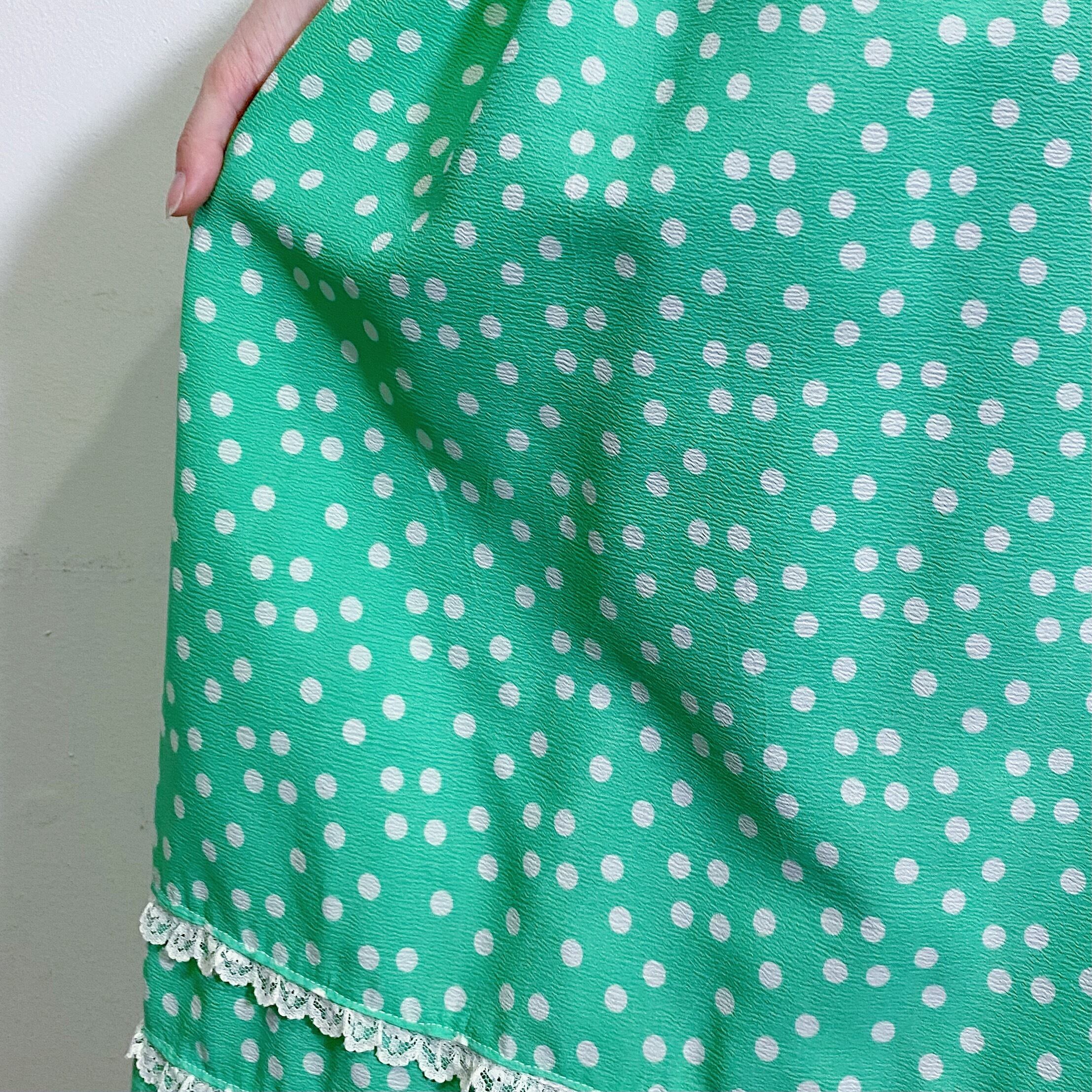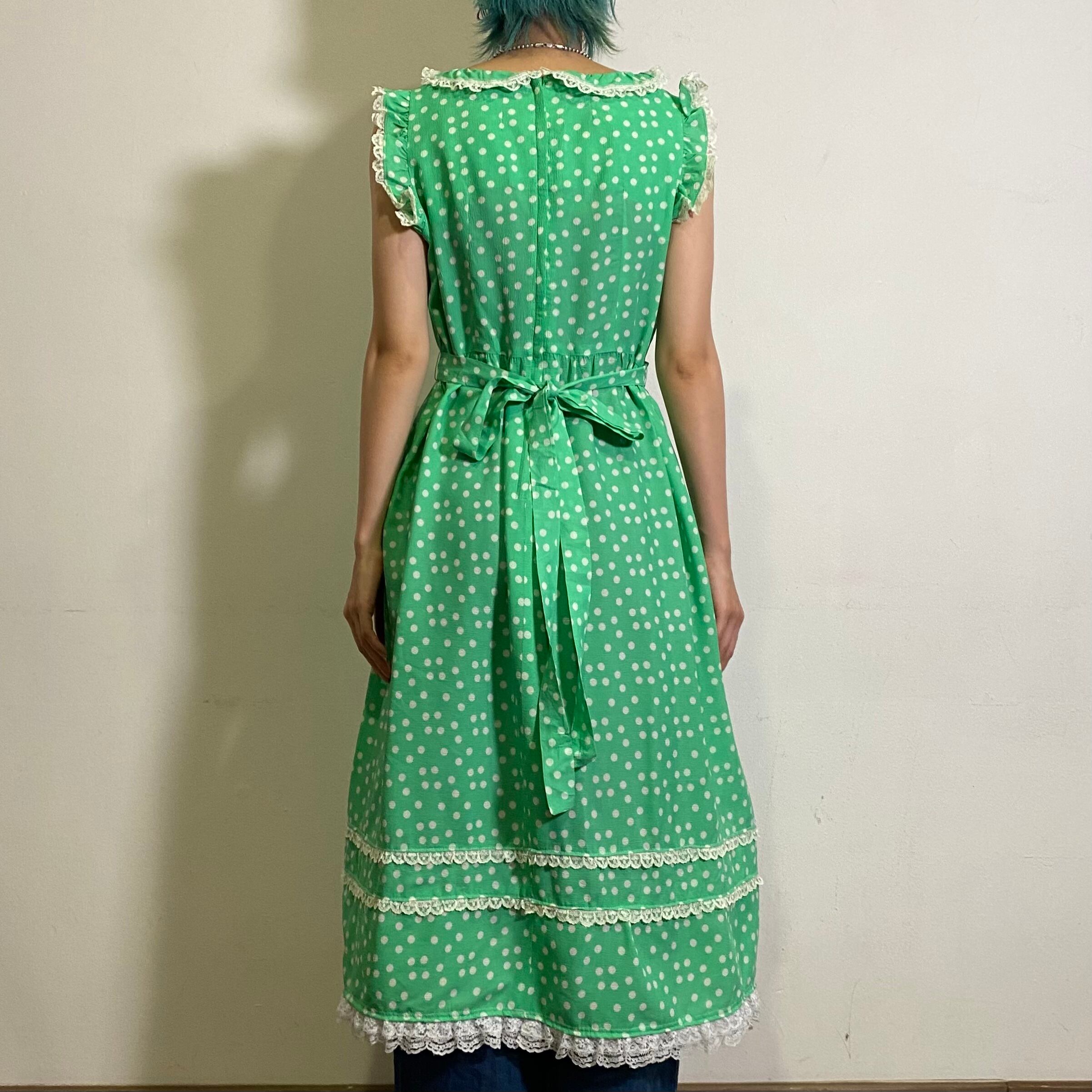 グリーン×ホワイトのドットが可愛い、70年代のワンピースです。