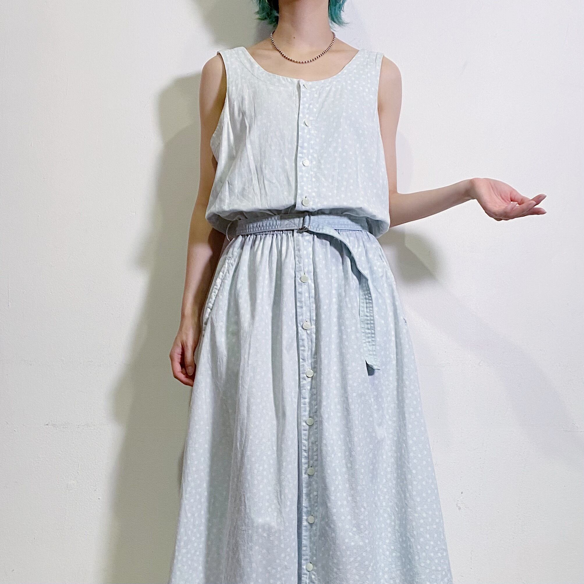 淡いサックスブルーにドット柄が可愛い、80年代のノースリーブワンピースです。