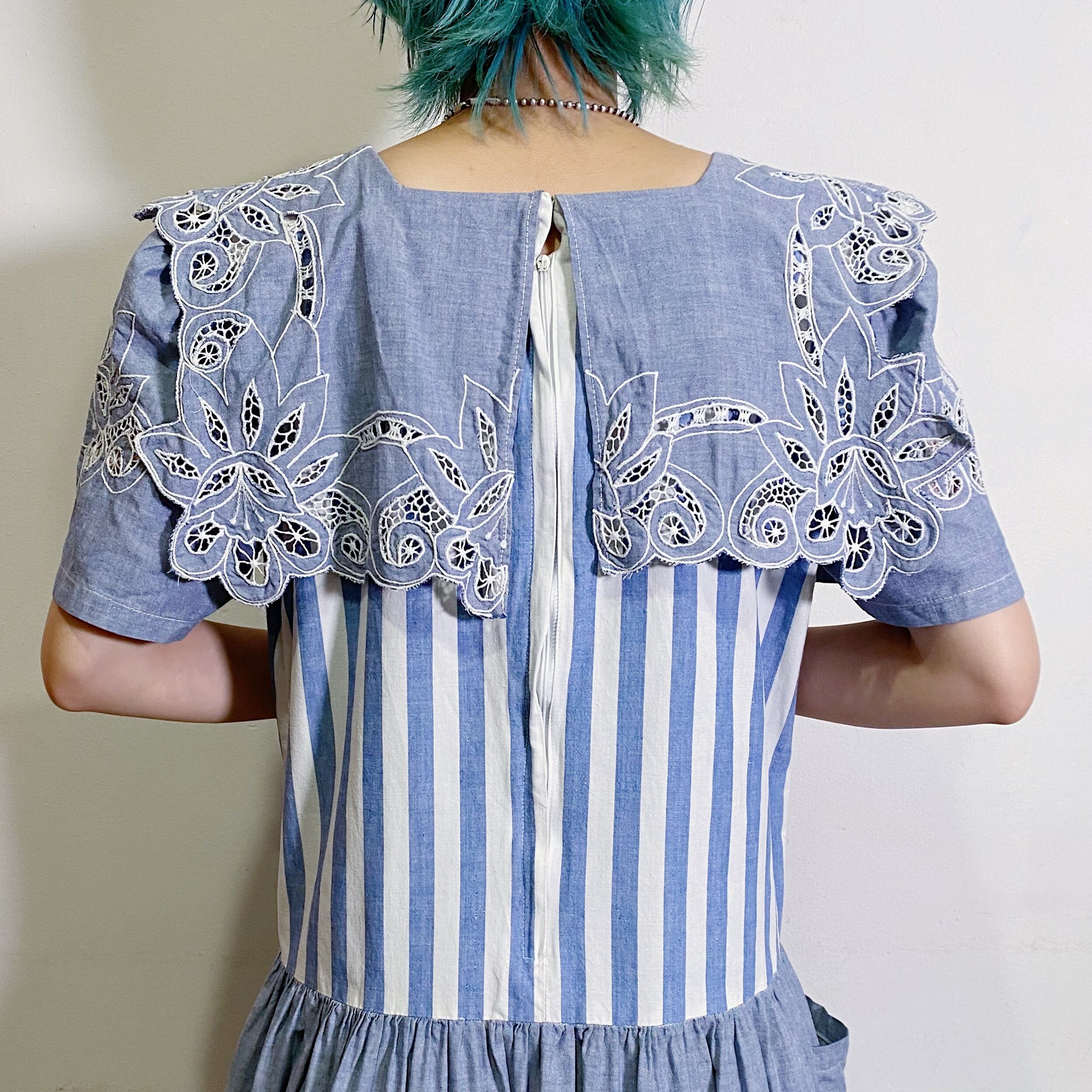 襟や袖、裾には細やかなカットワークが施されており、凝ったつくりの一枚。
