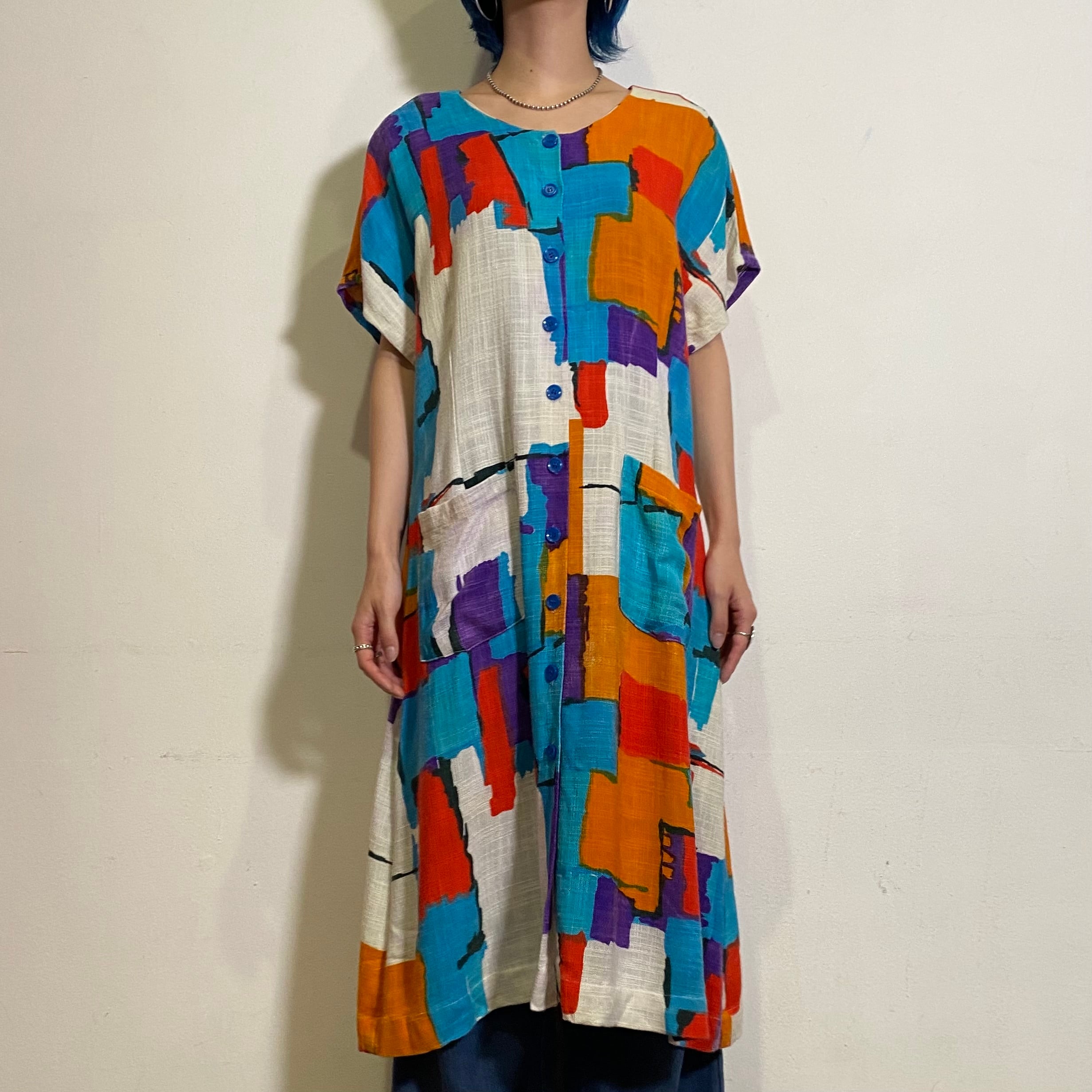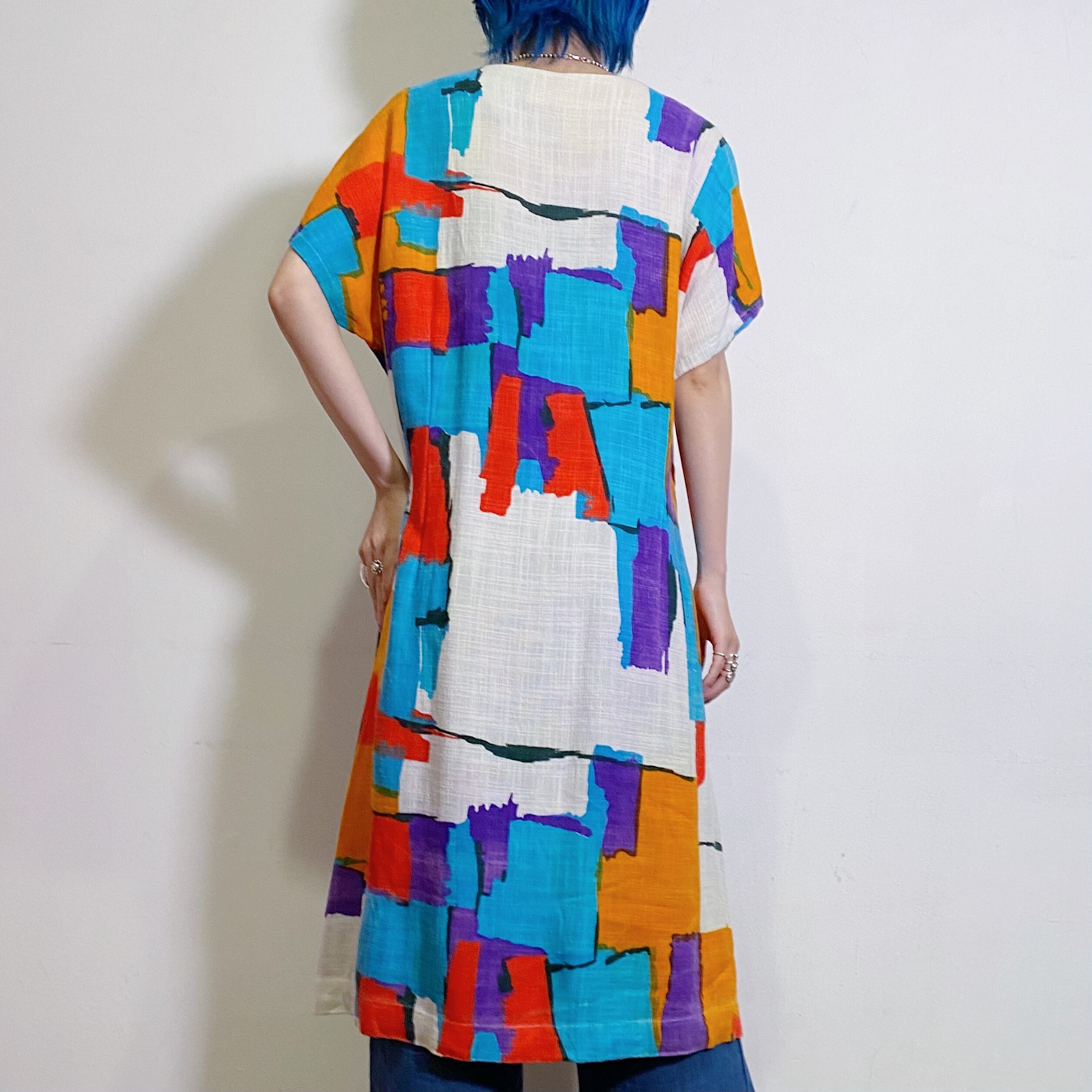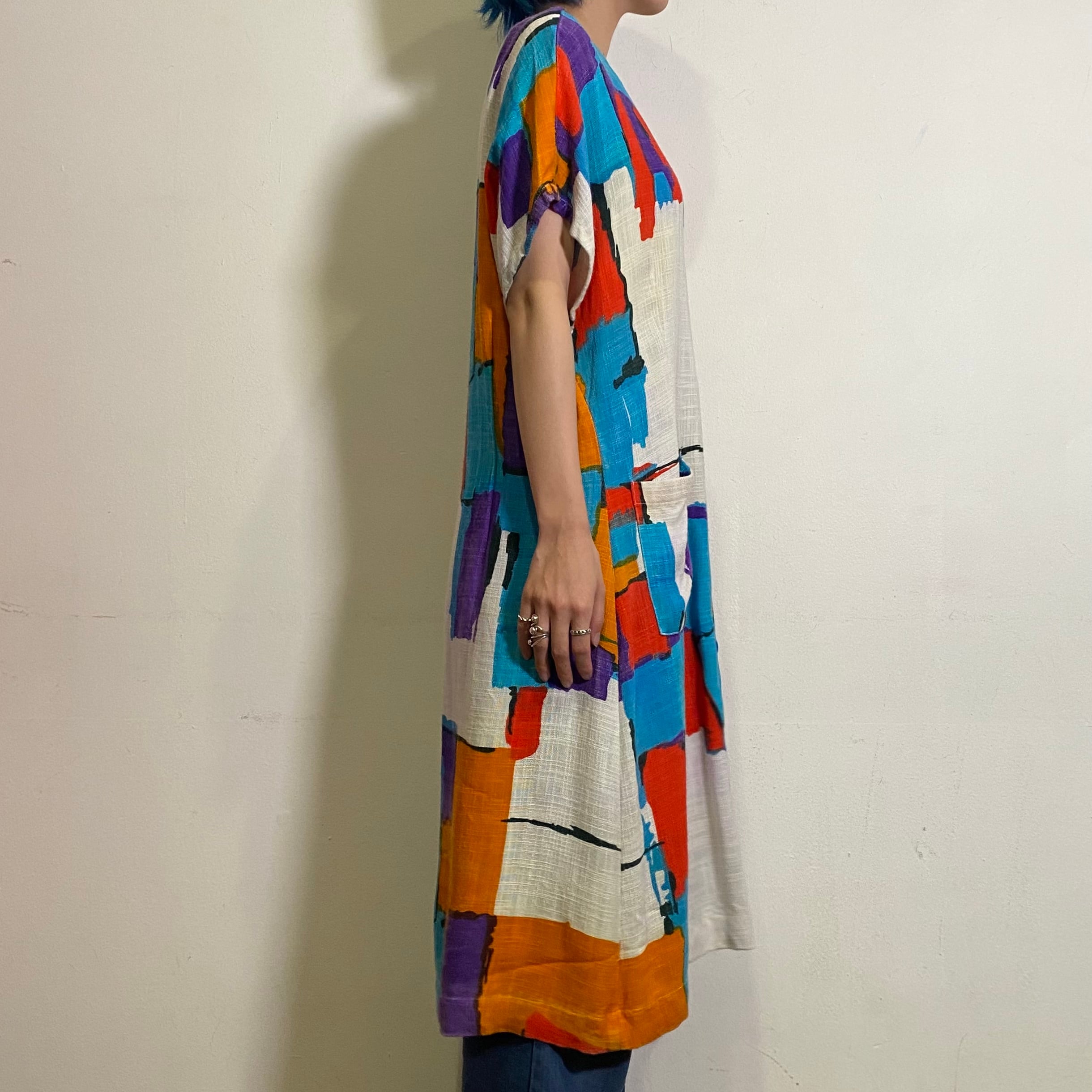 カラフルなペイントのような柄が可愛い、80年代のワンピースです。