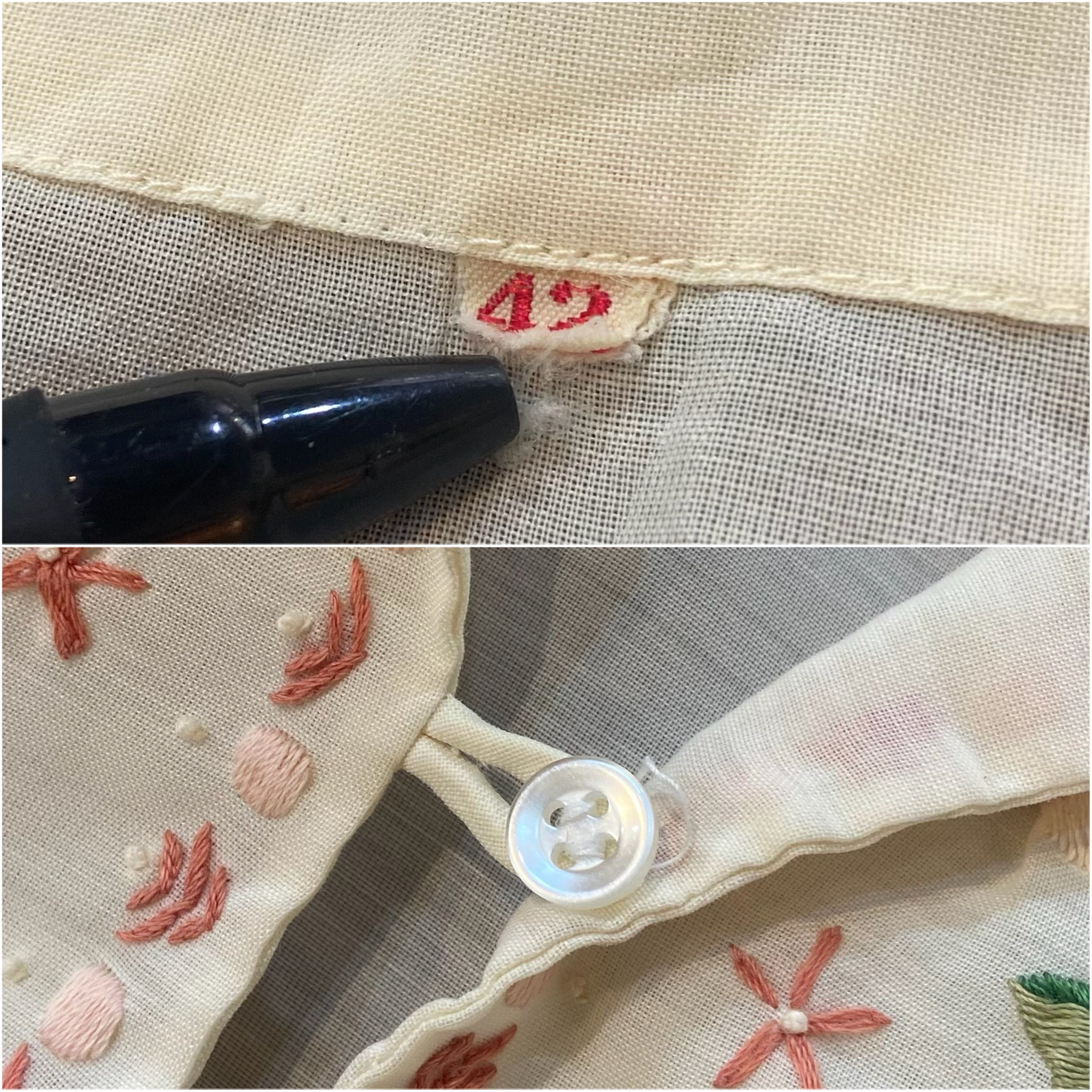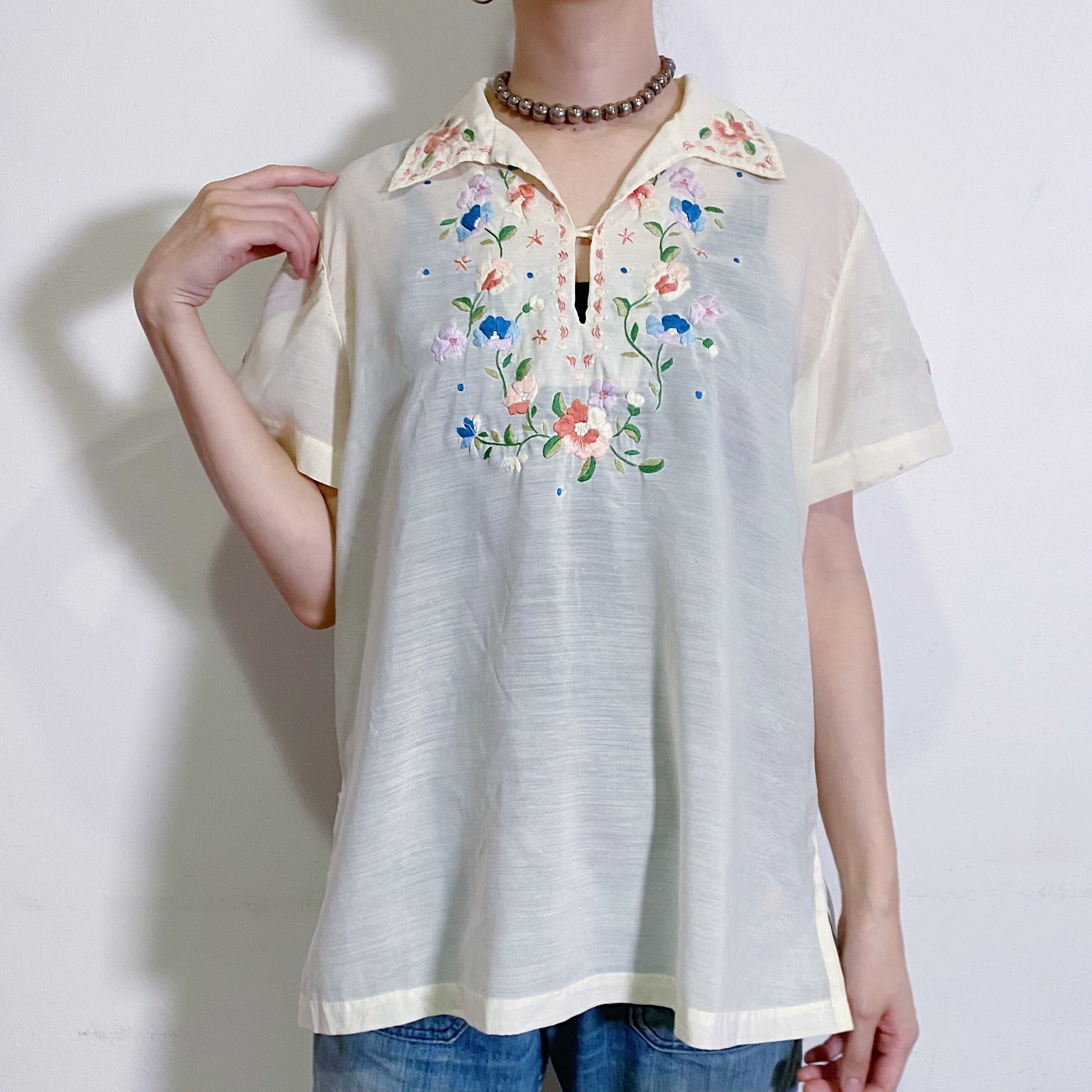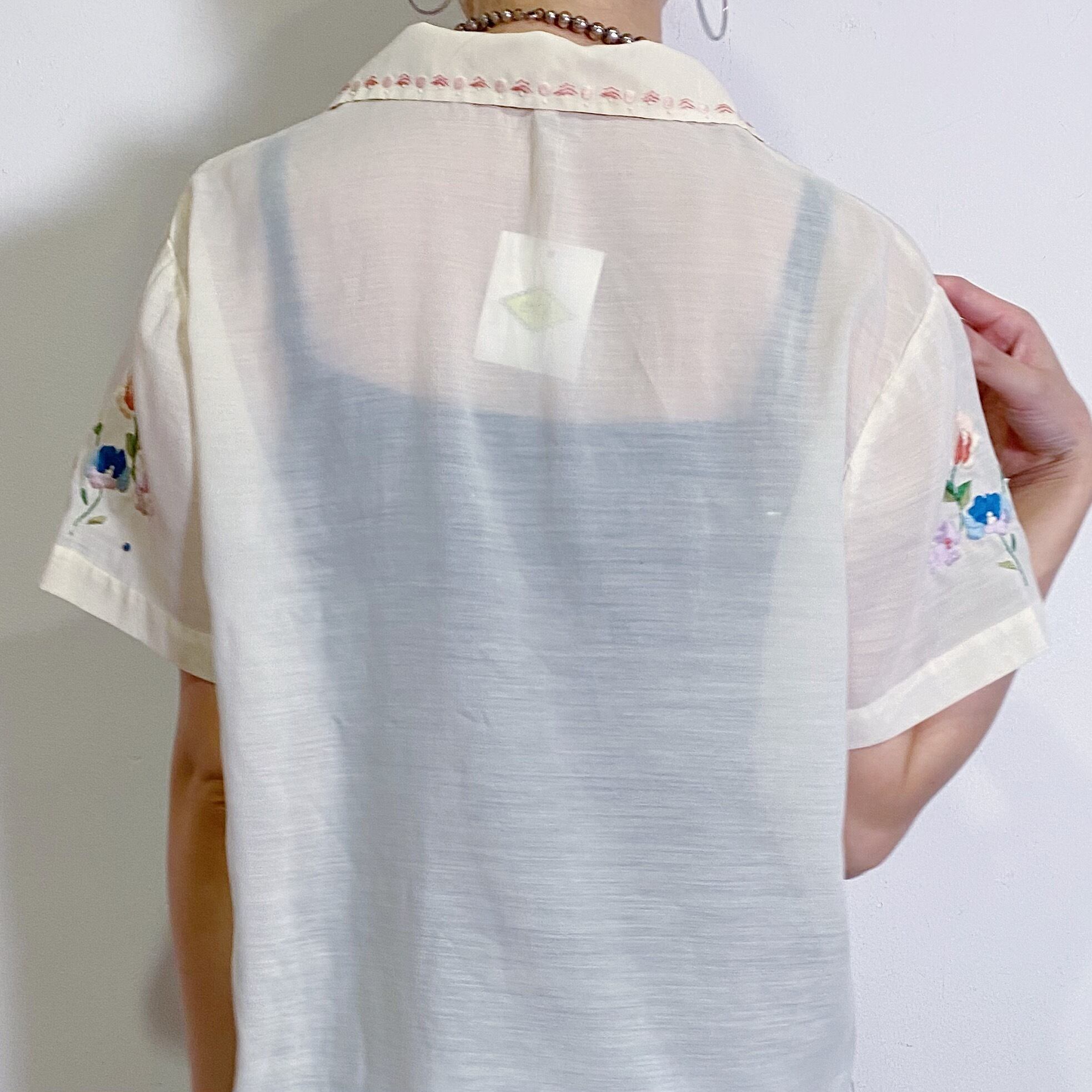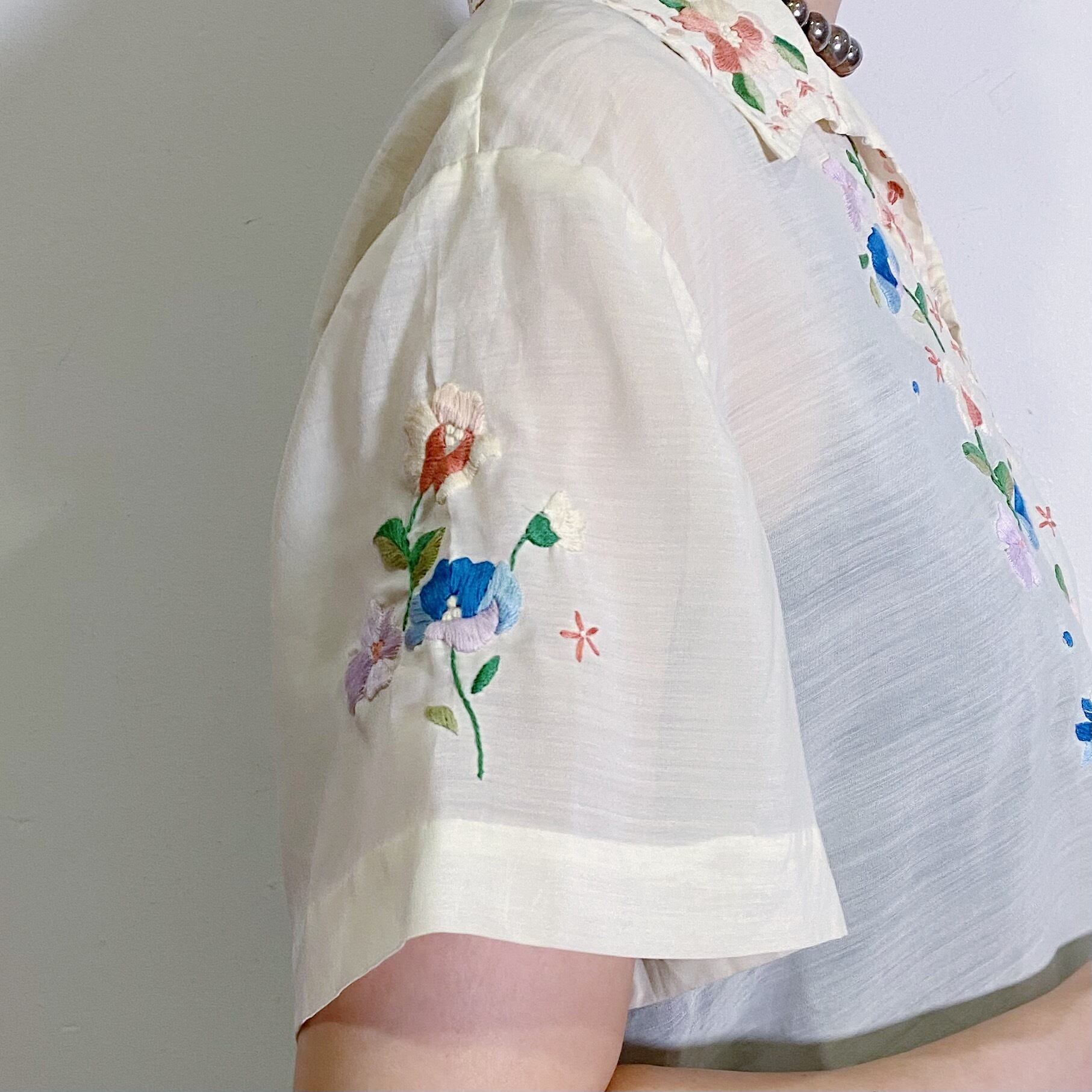 カラフルなお花の刺繍が可愛い、チャイナの開襟シャツです。