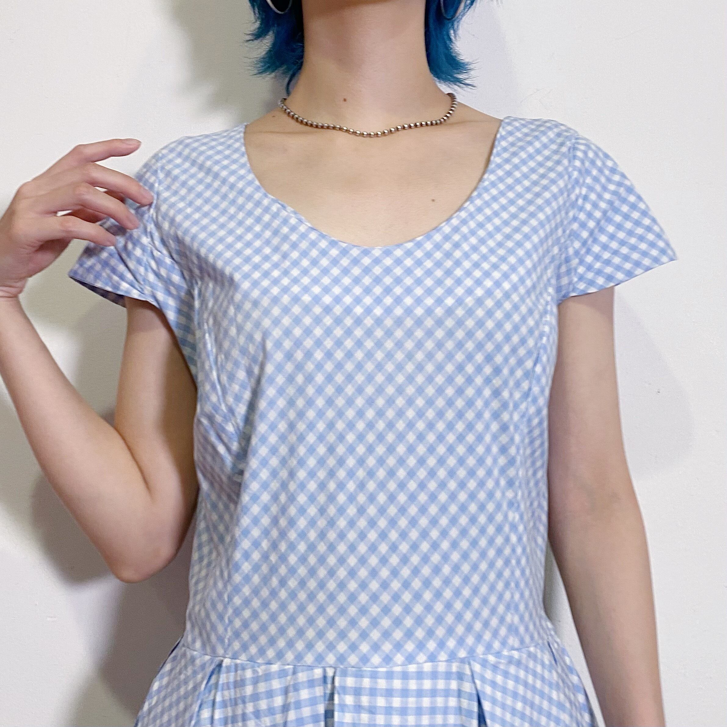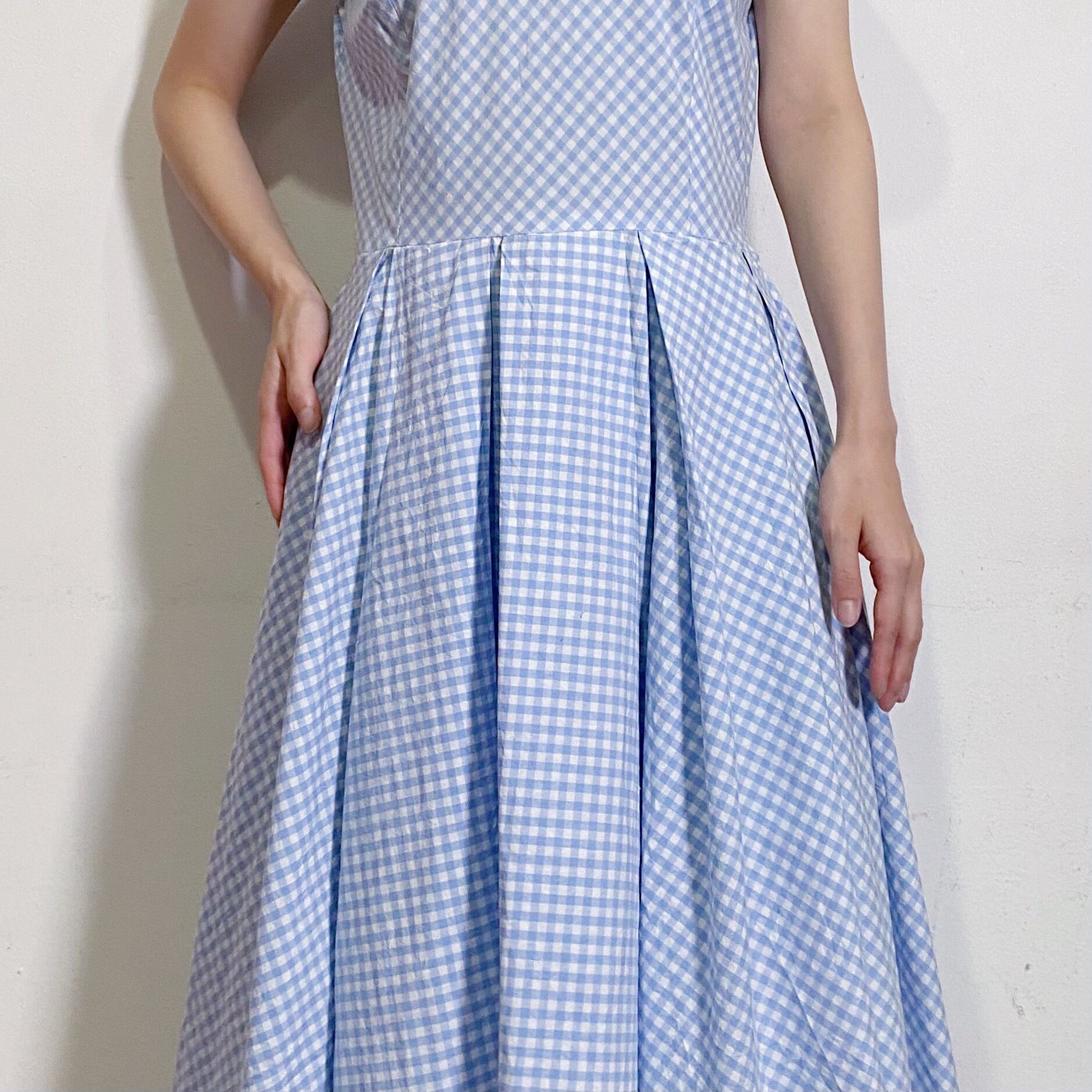 サックスブルー×ホワイトのギンガムチェックが可愛い、80年代のロングワンピースです。