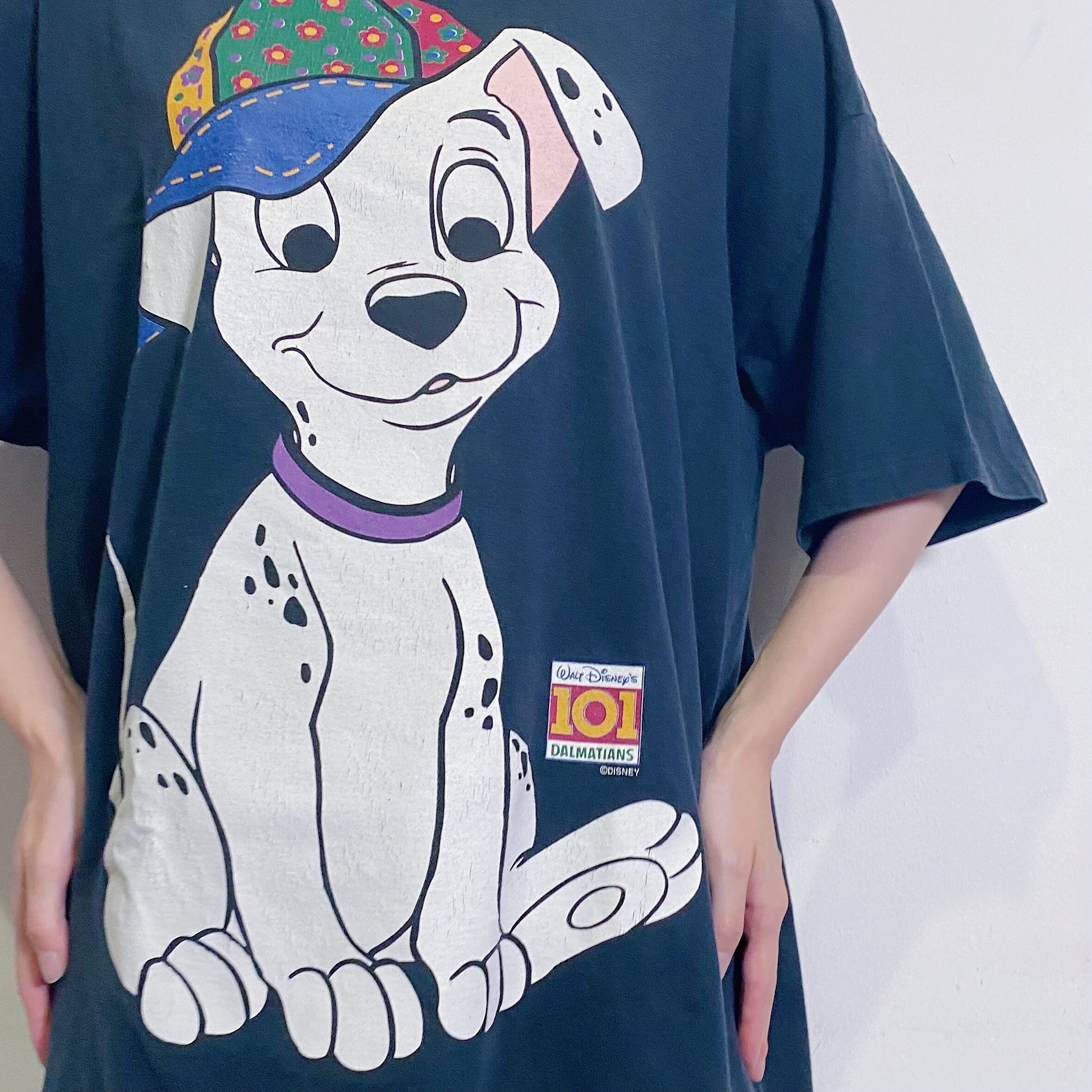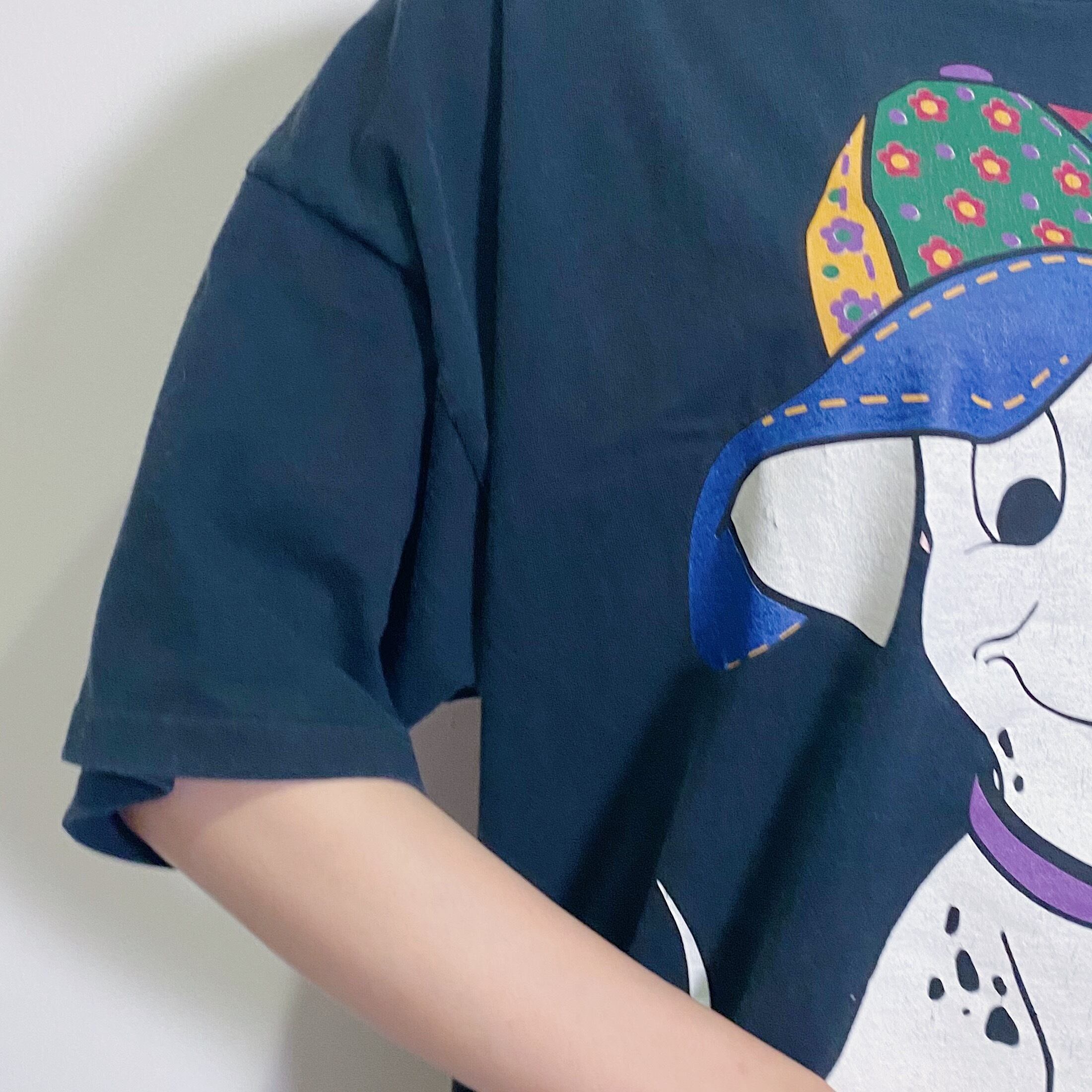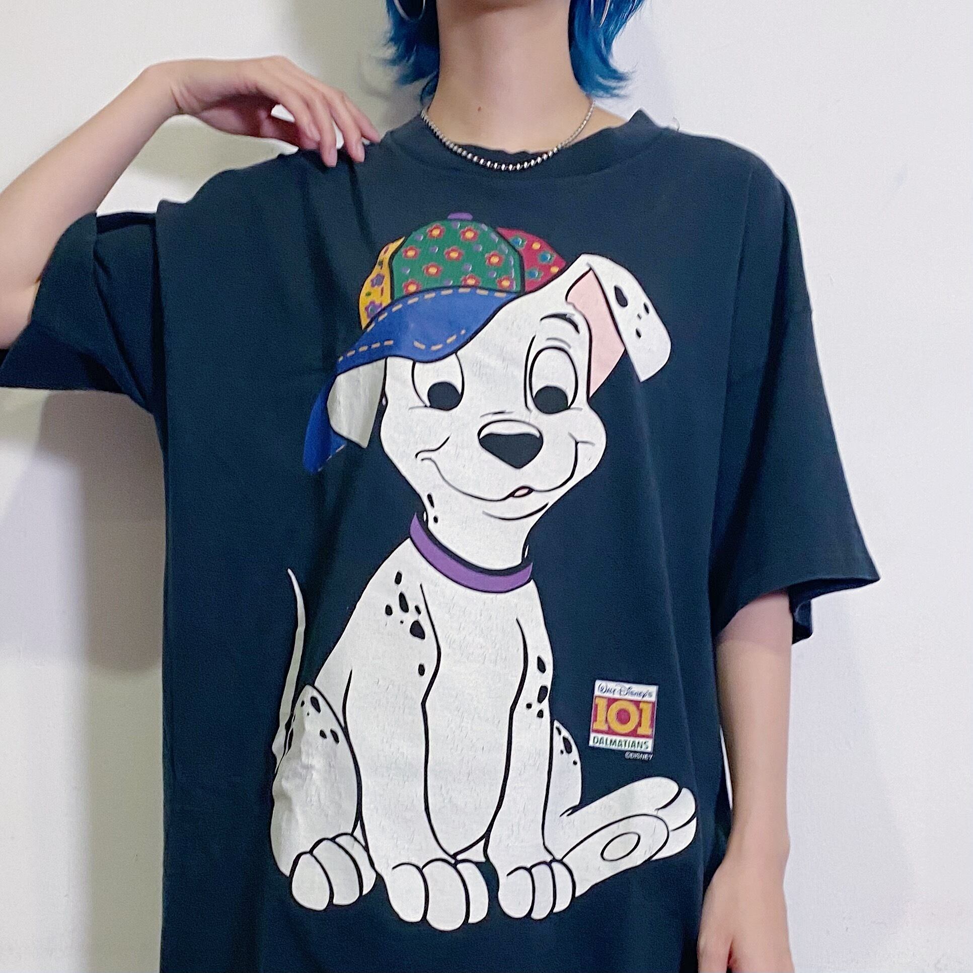 花柄パッチワークのキャップを被った101匹わんちゃんのプリントが愛らしい、90年代のTシャツです。