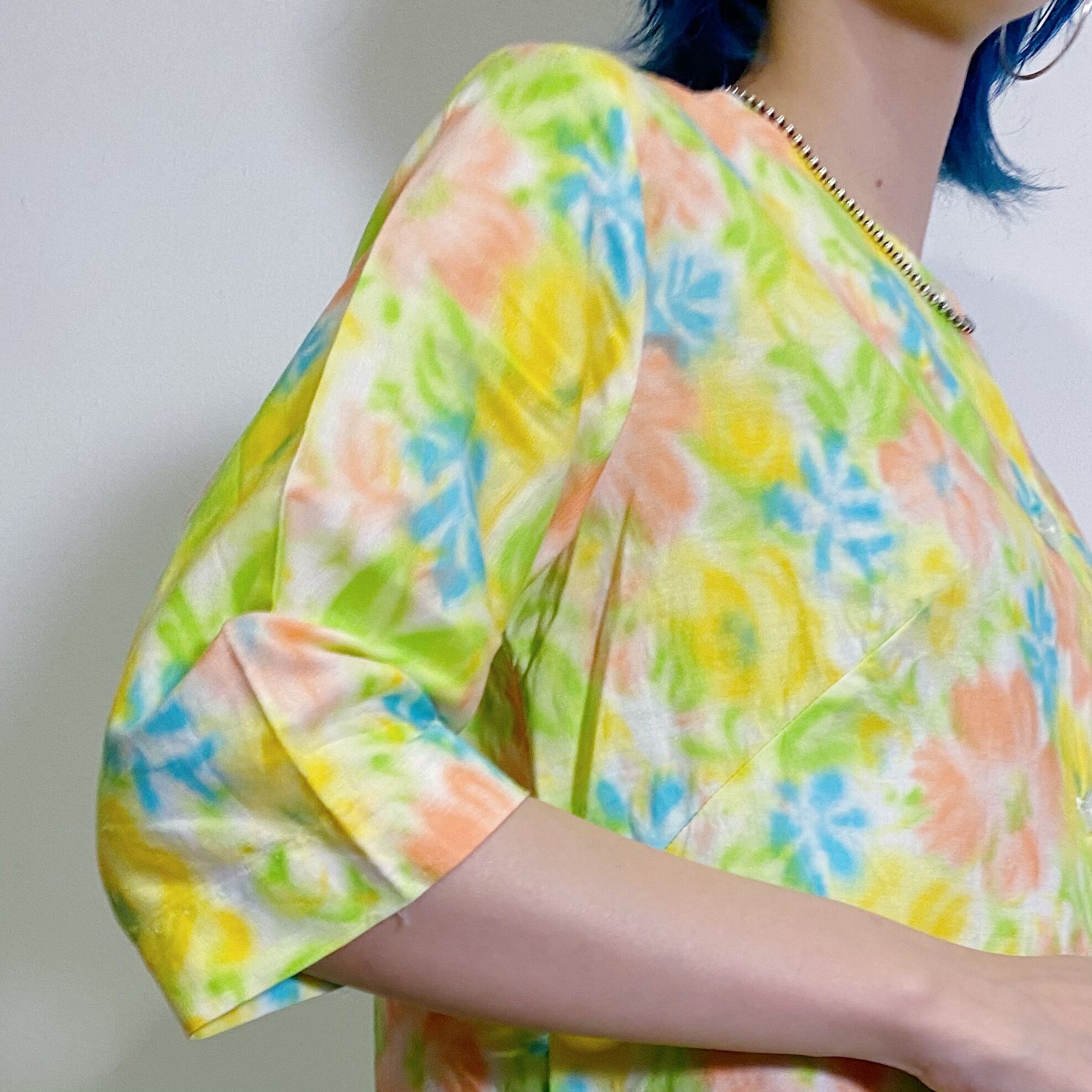 水彩画タッチのテキスタイルが可愛い、70年代のトップスです。