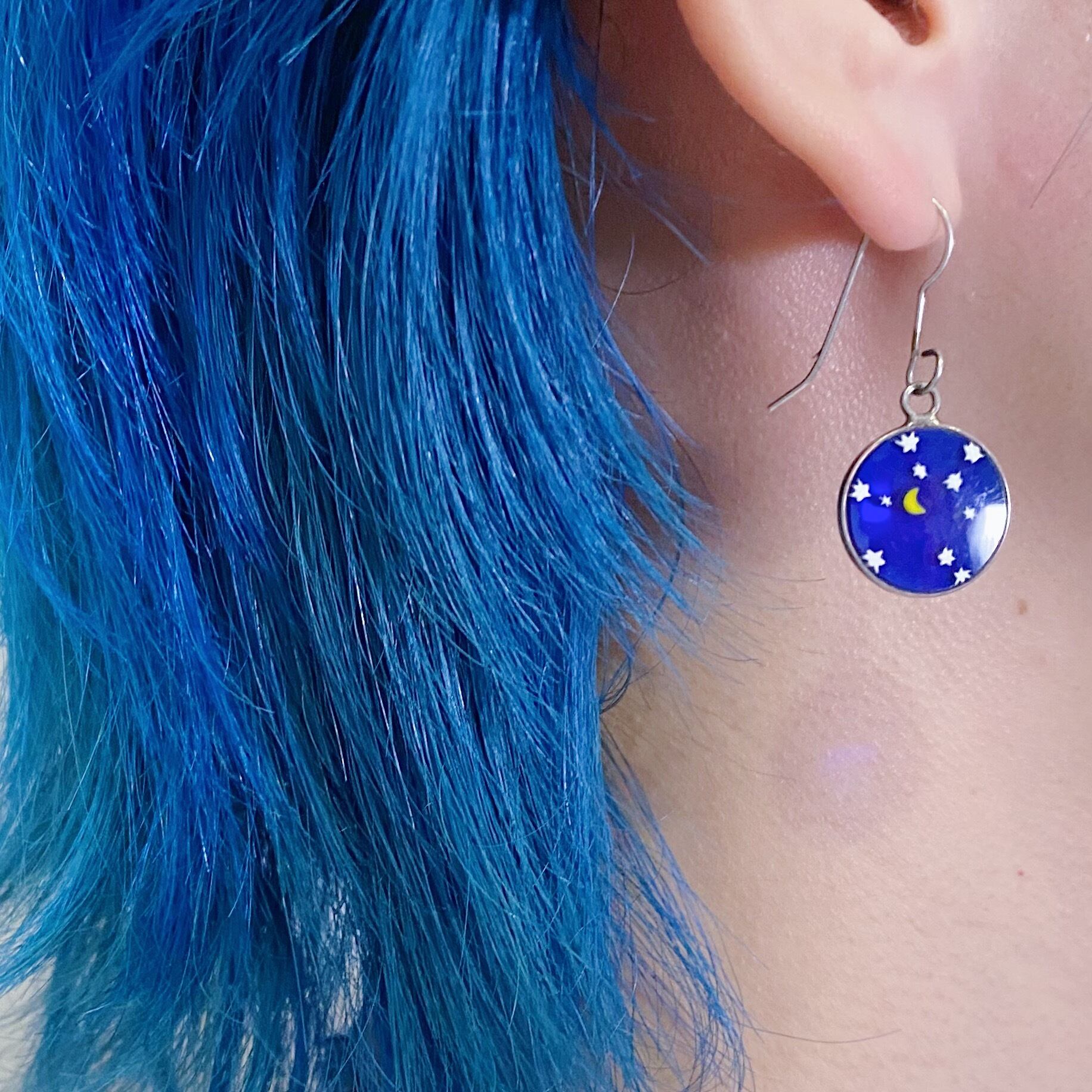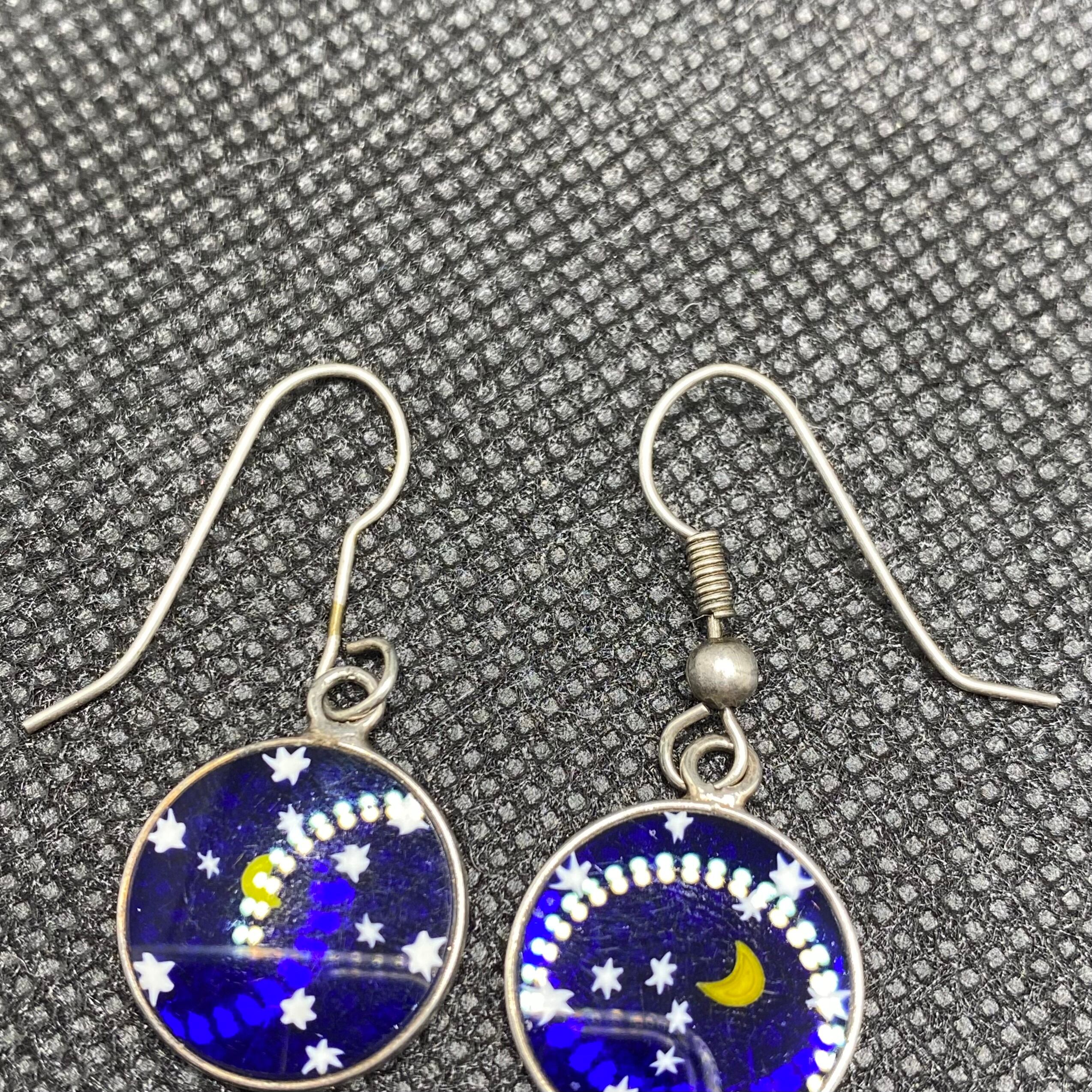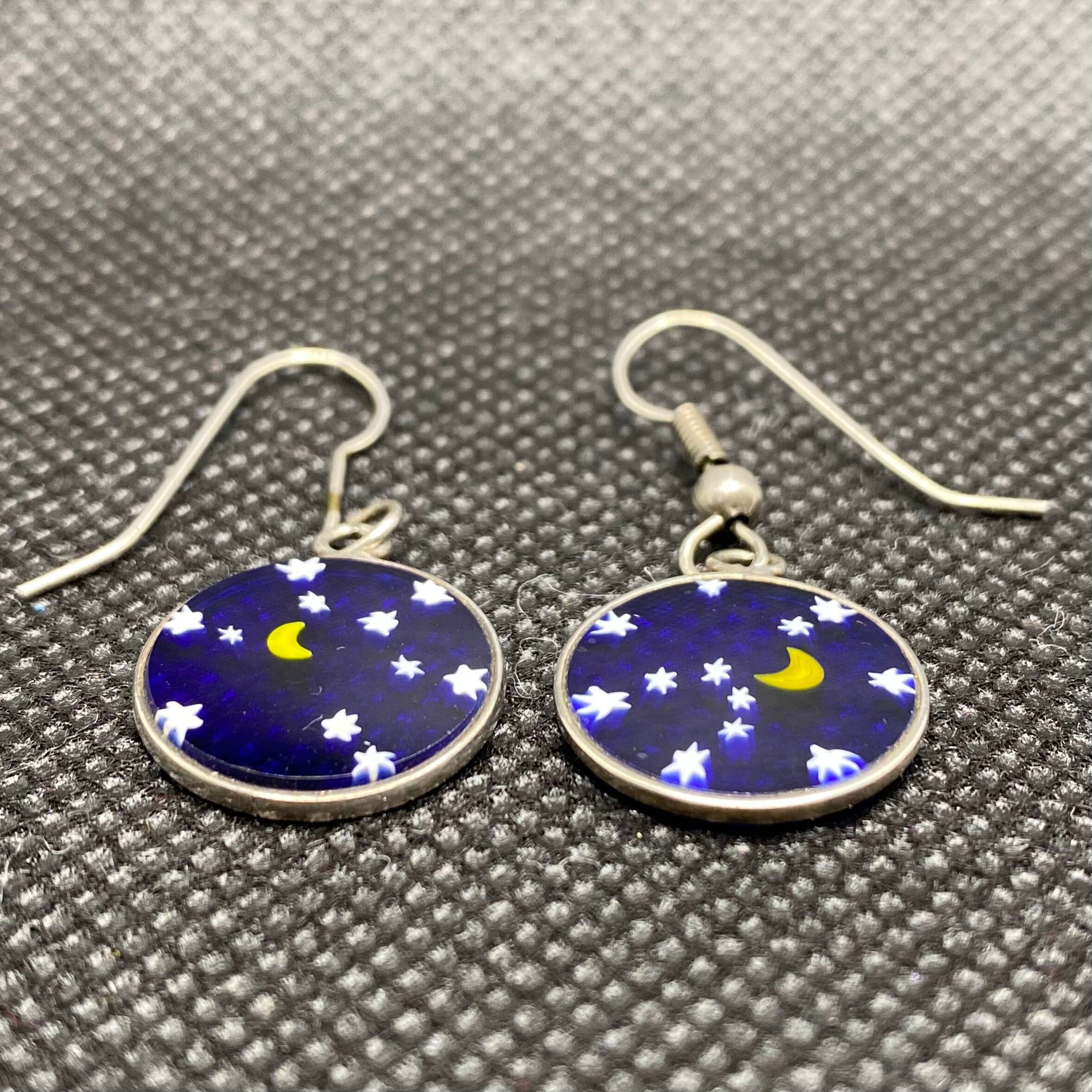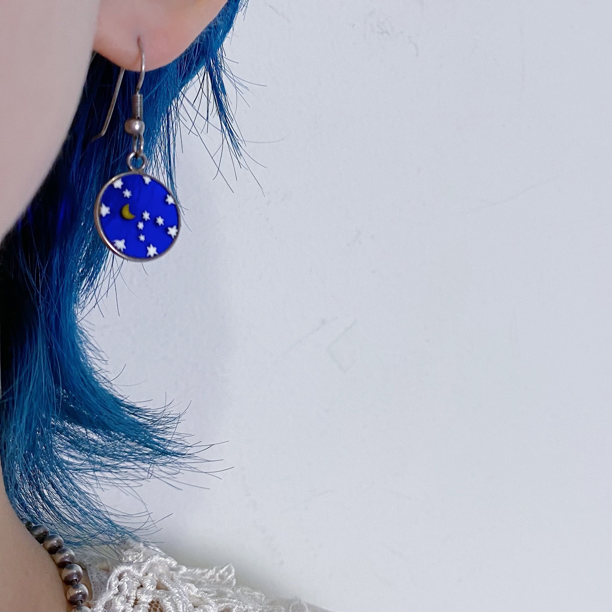 925シルバーの金具と枠の中にガラスのような樹脂を流し、星や月のモチーフが浮かぶ可愛いデザインのピアスです。