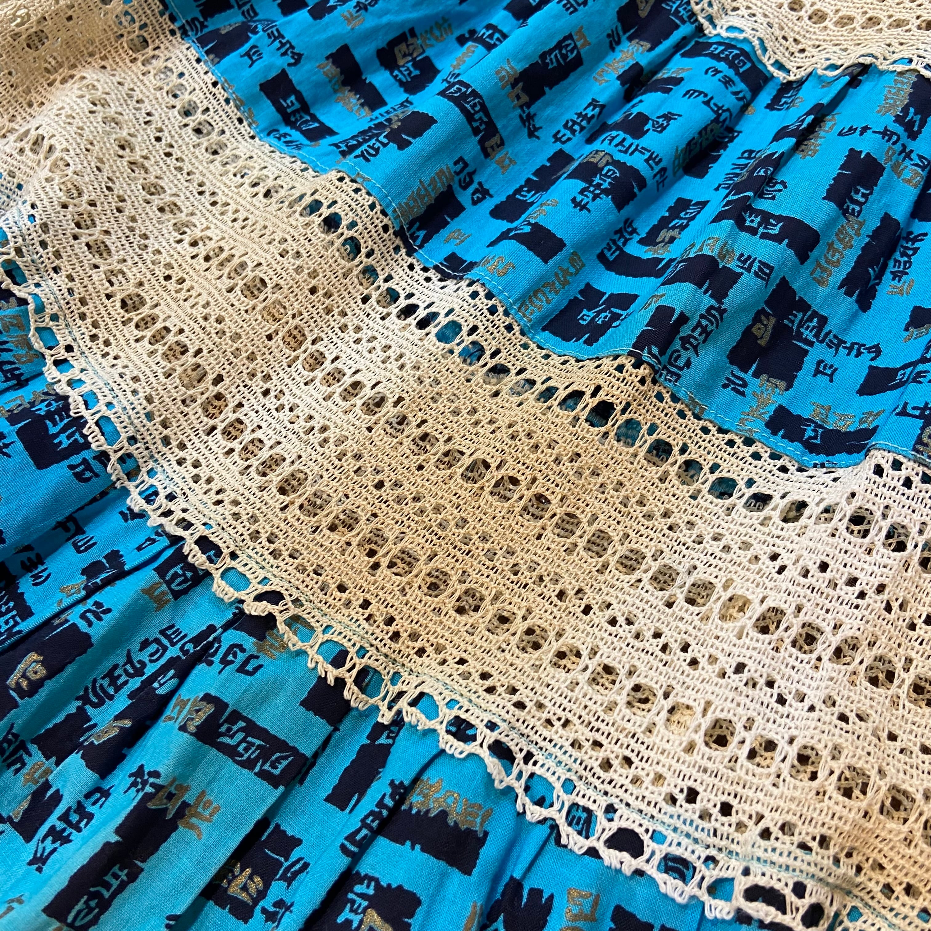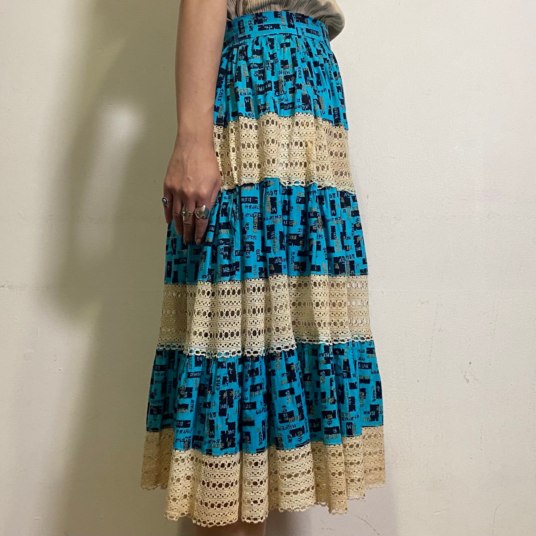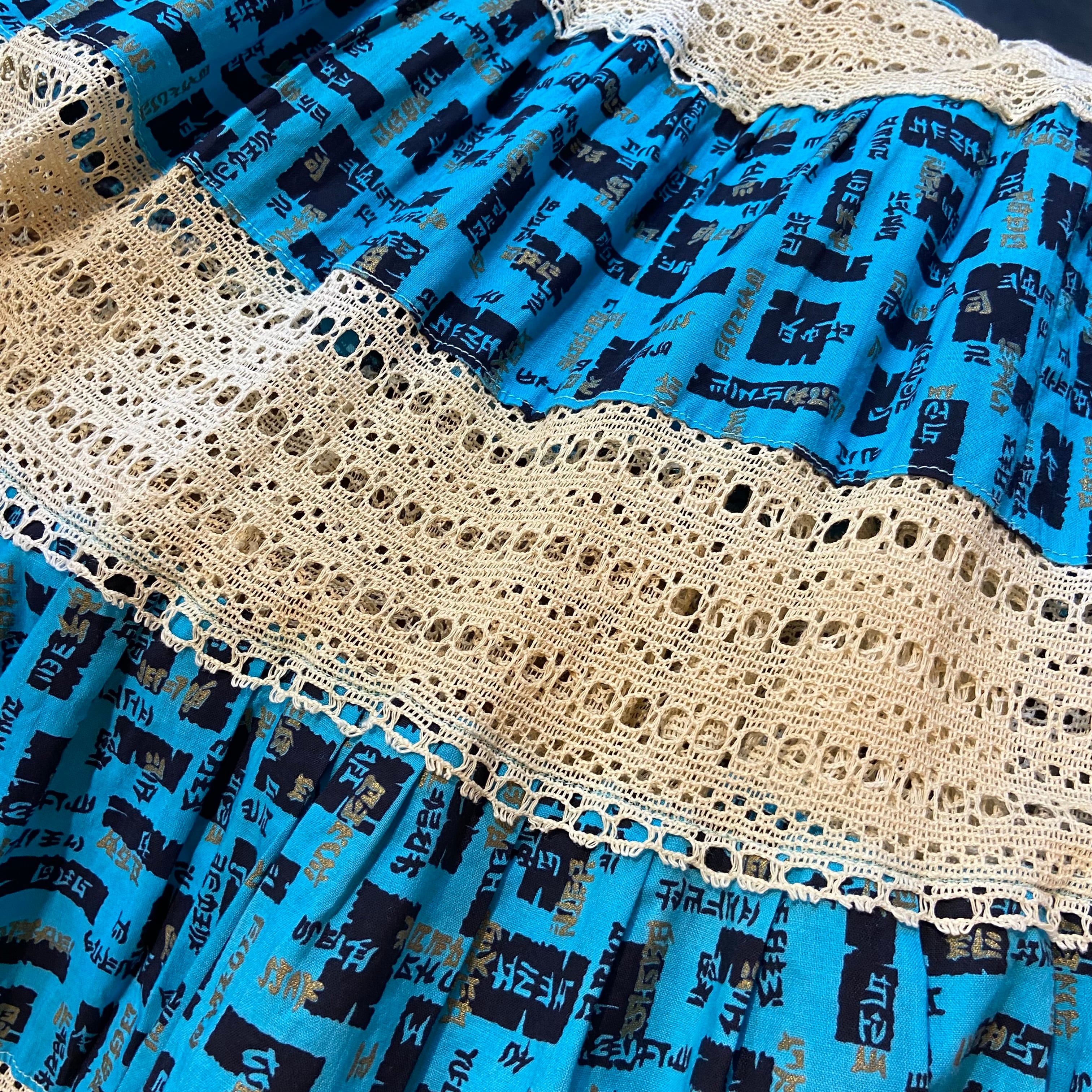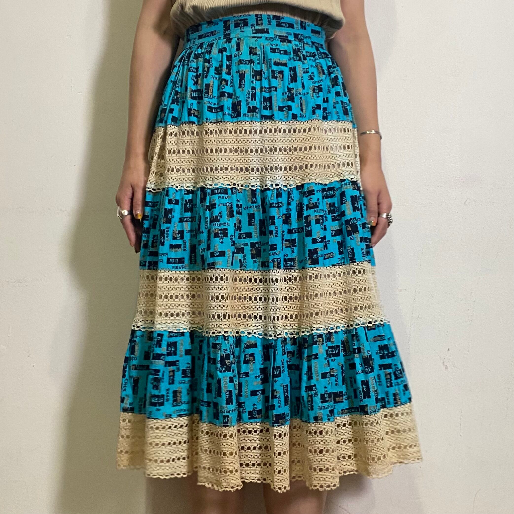 文字のようにも見える不思議なテキスタイルとレースの組み合わせが可愛い、50年代のスカートです。