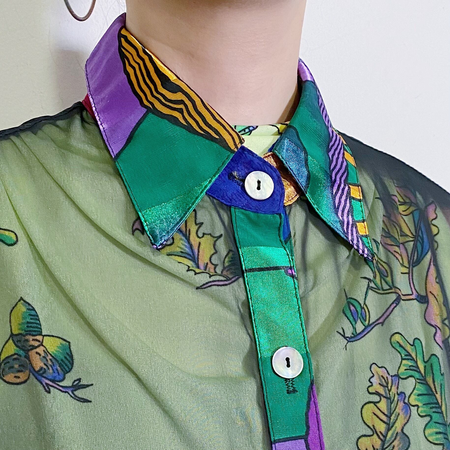 スカーフのような光沢感のあるカラフルな生地との切り替えが可愛い、80年代のシースルーシャツです。