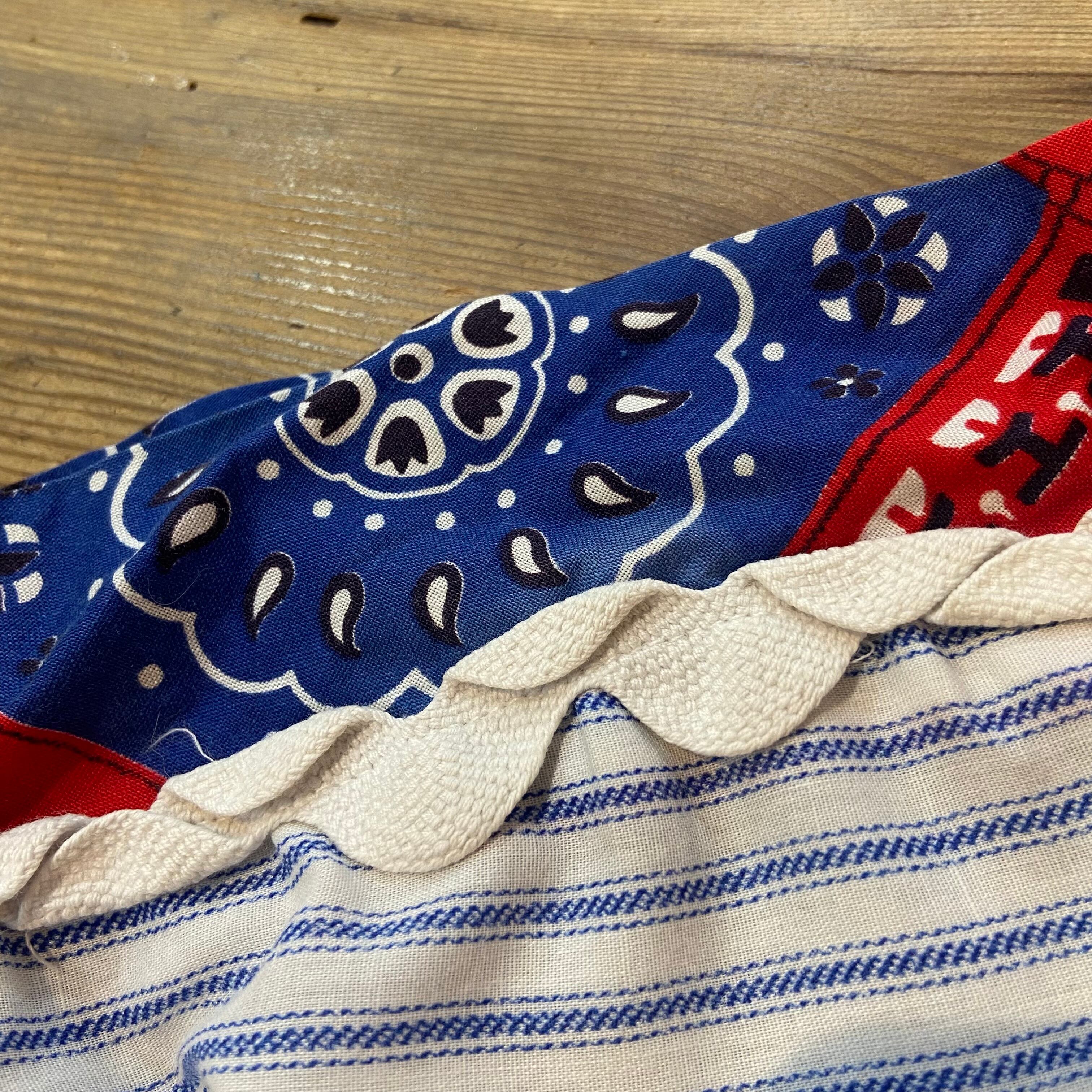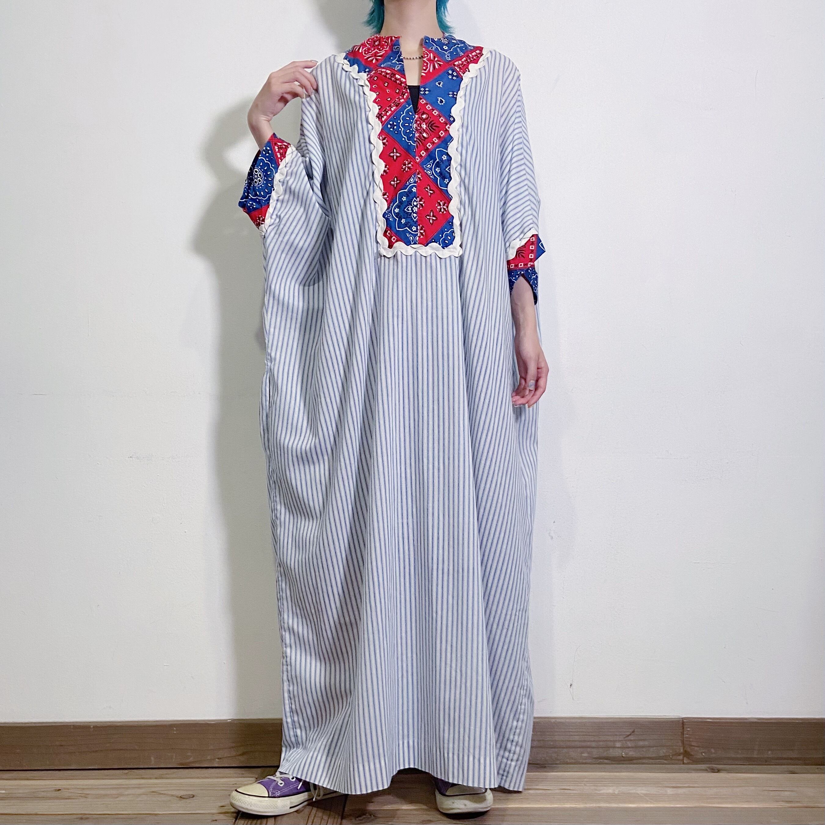 レッドとブルーのバンダナ柄とストライプ柄の組み合わせが最高に可愛い、70年代のロングワンピースです。