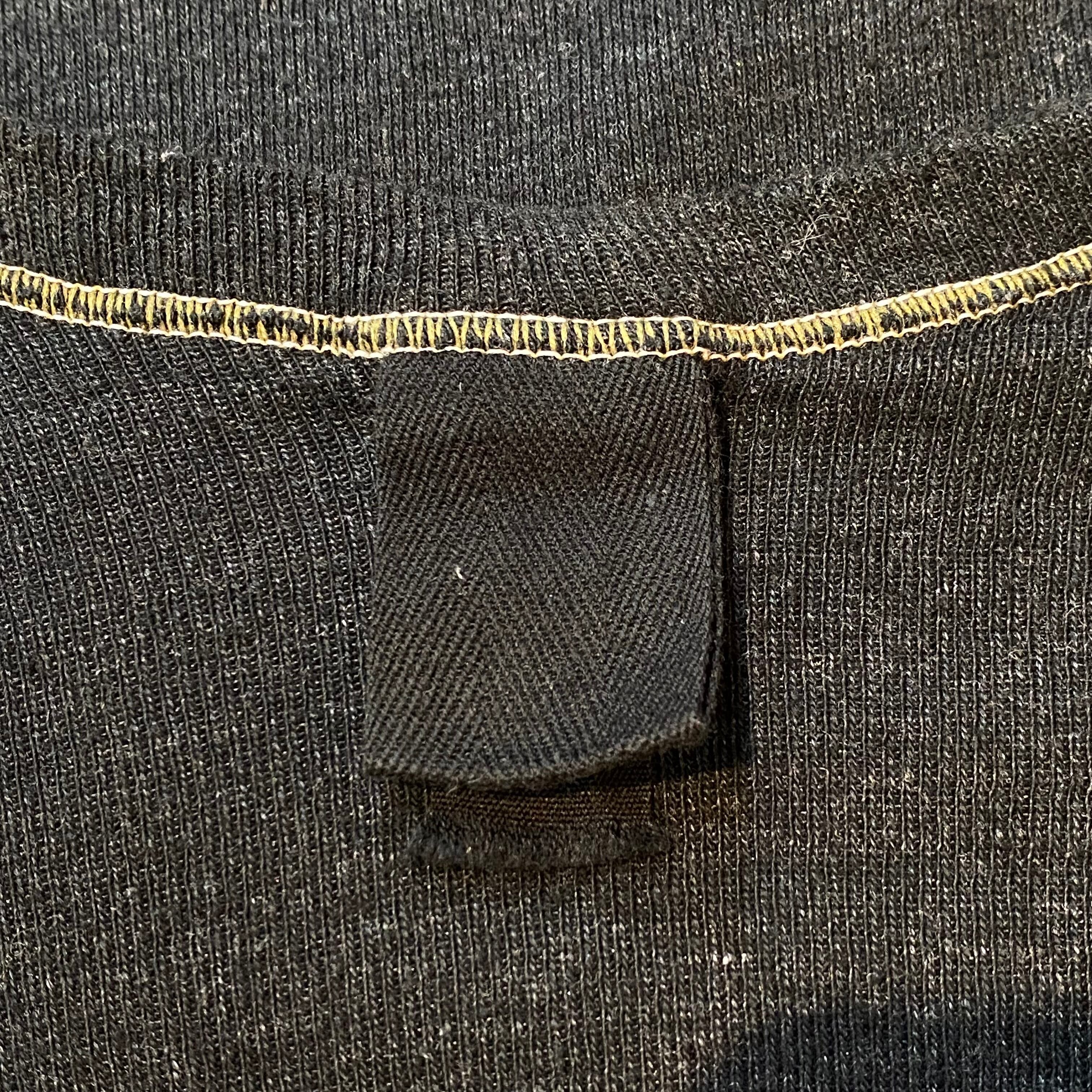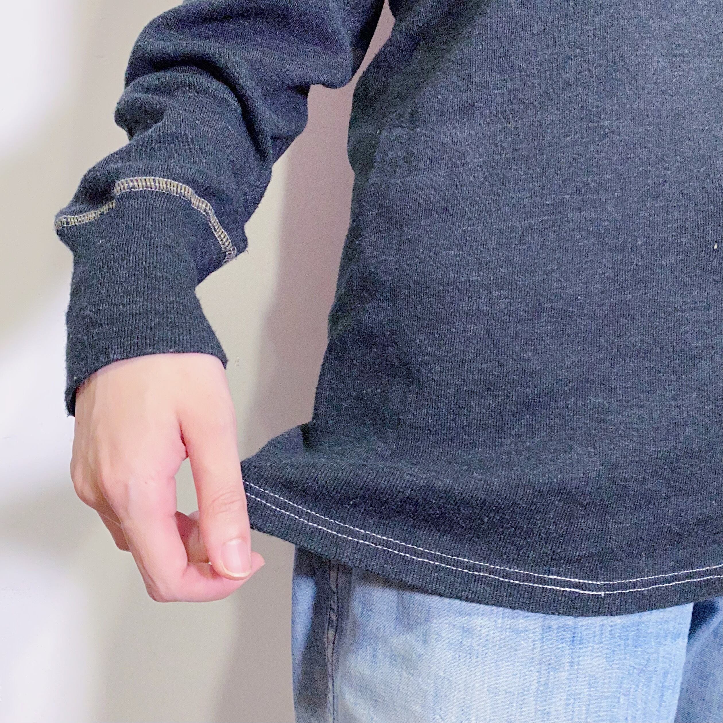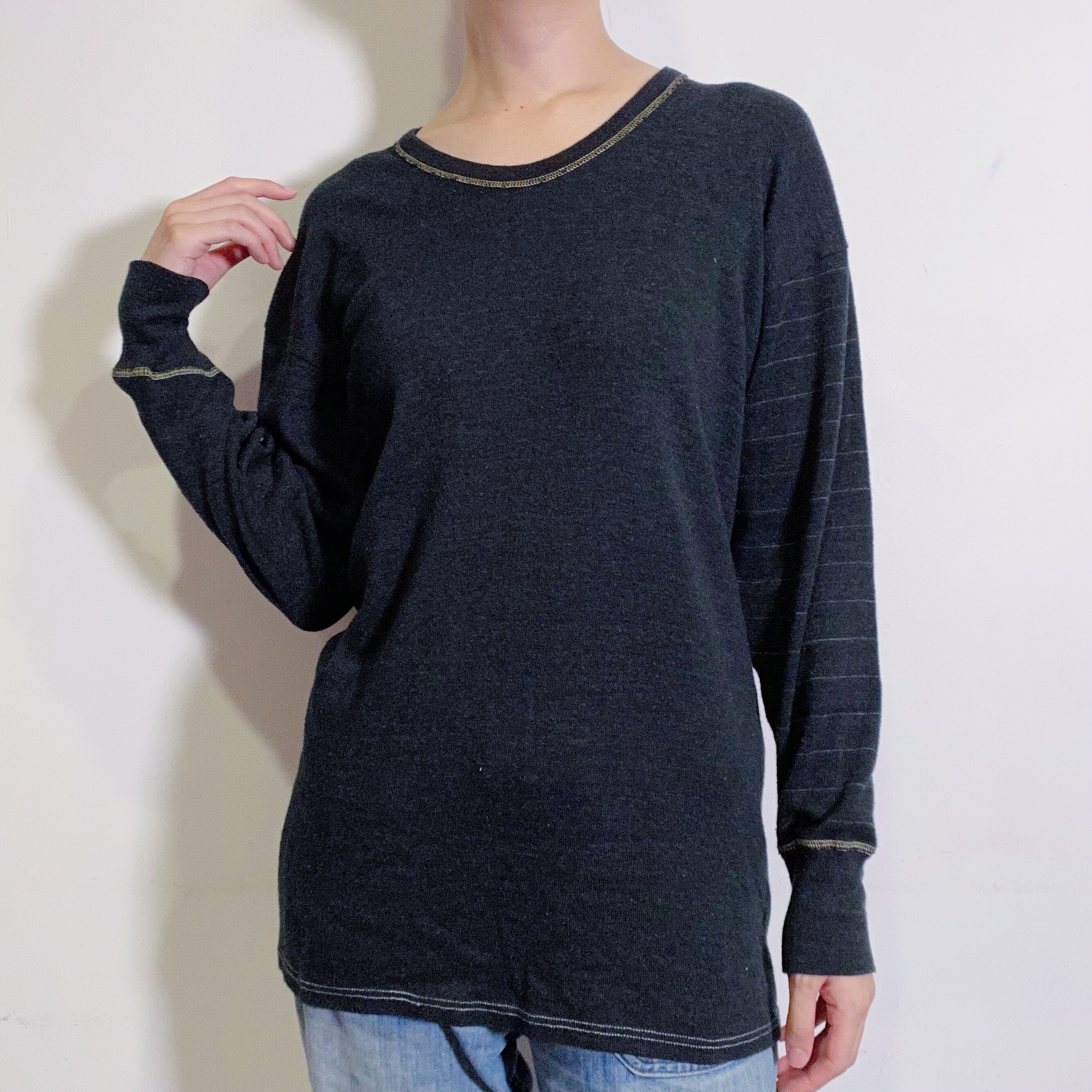 シンプルながらもホワイトのステッチがアクセントになっており、左袖のみ細いボーダーが入っているのもポイントの一枚。