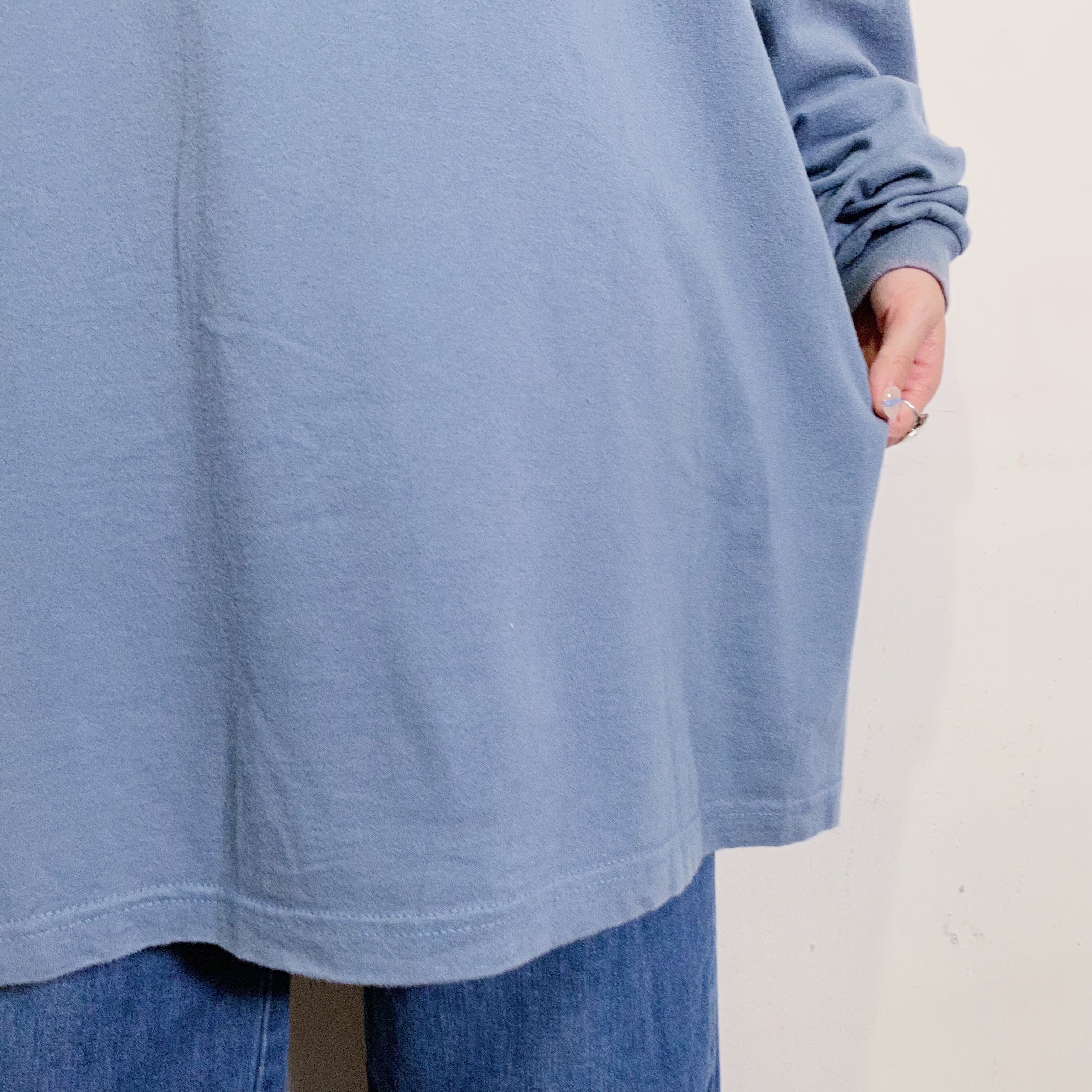 サックスブルーとグレーの中間のようなスモーキーカラーで、着こなしやすそうな一枚です。