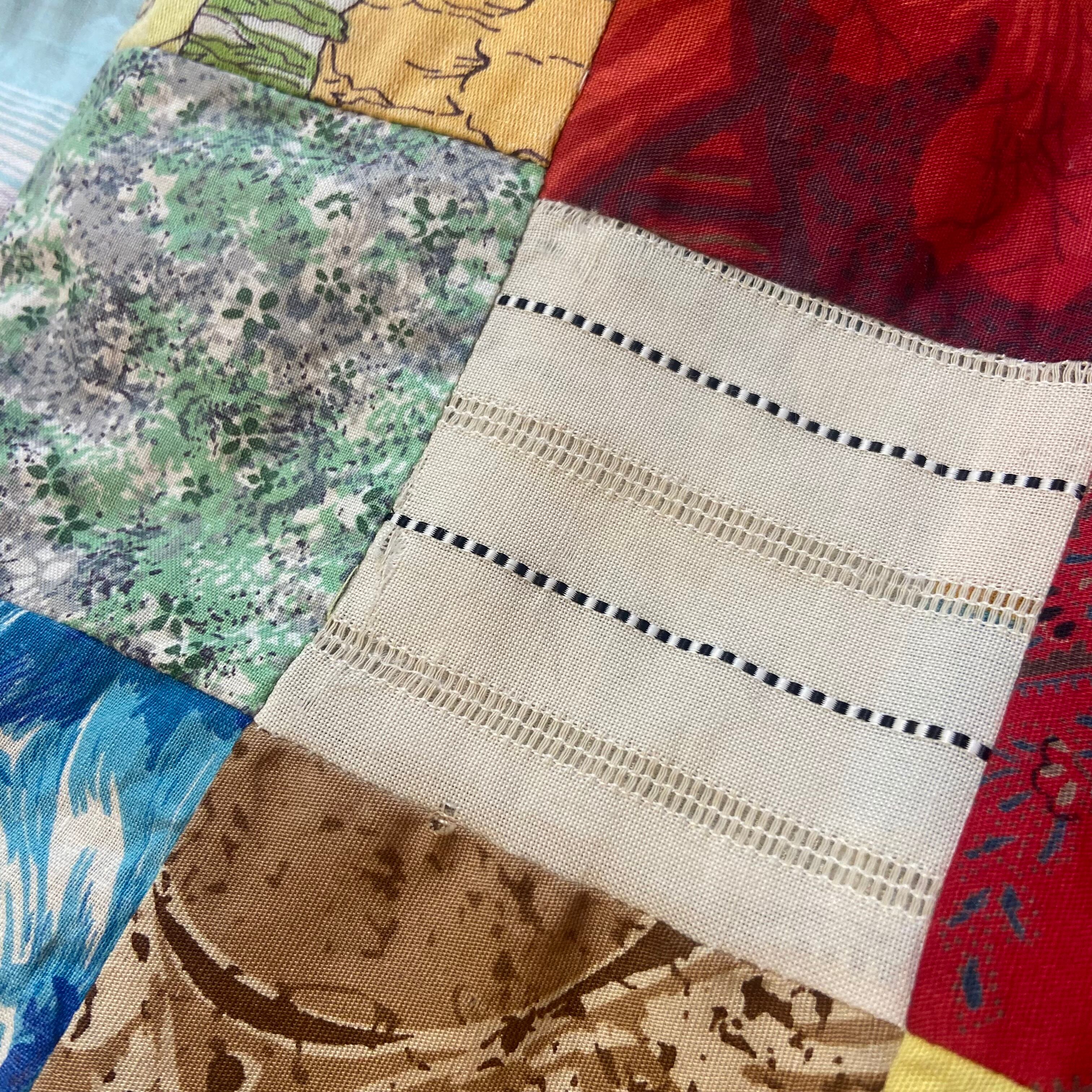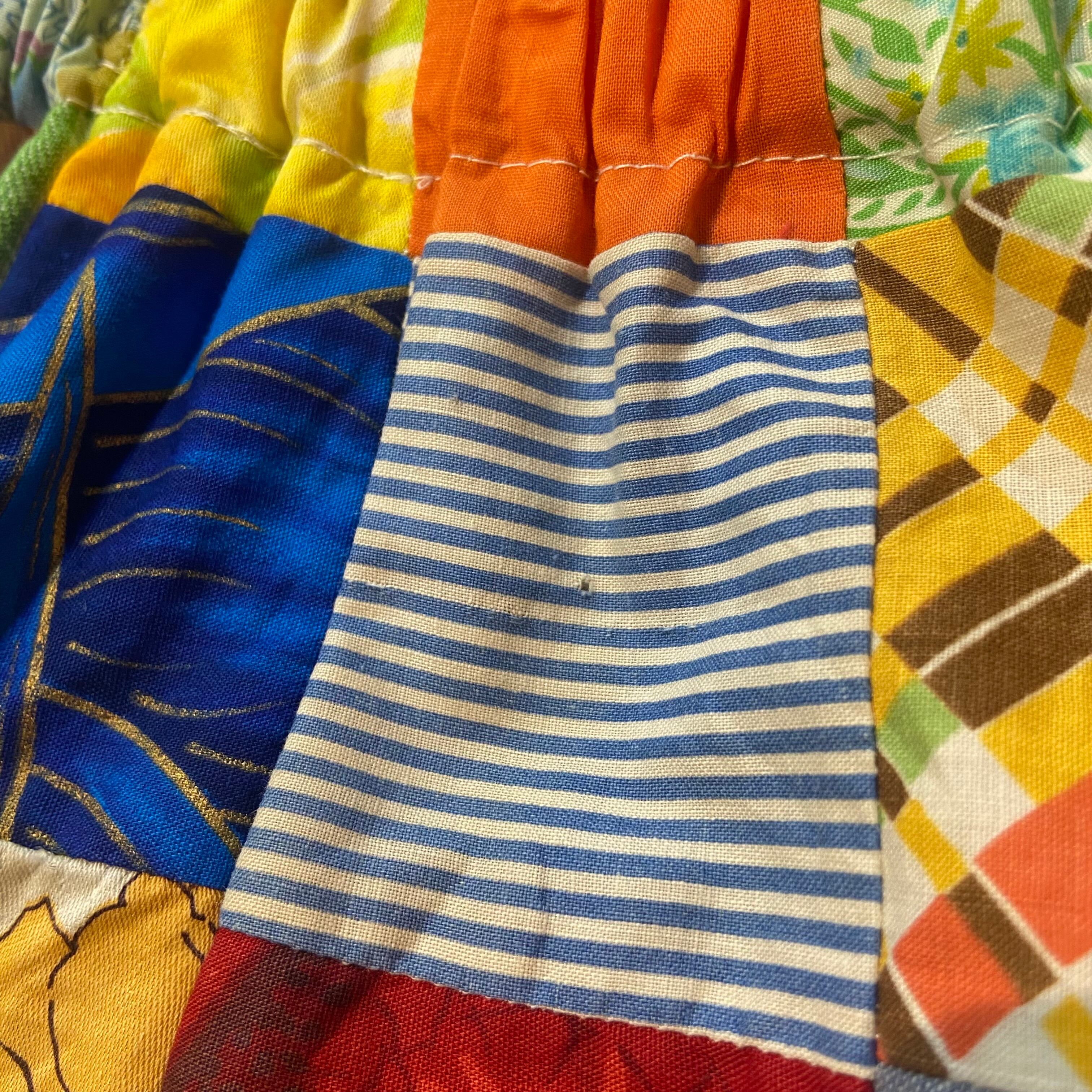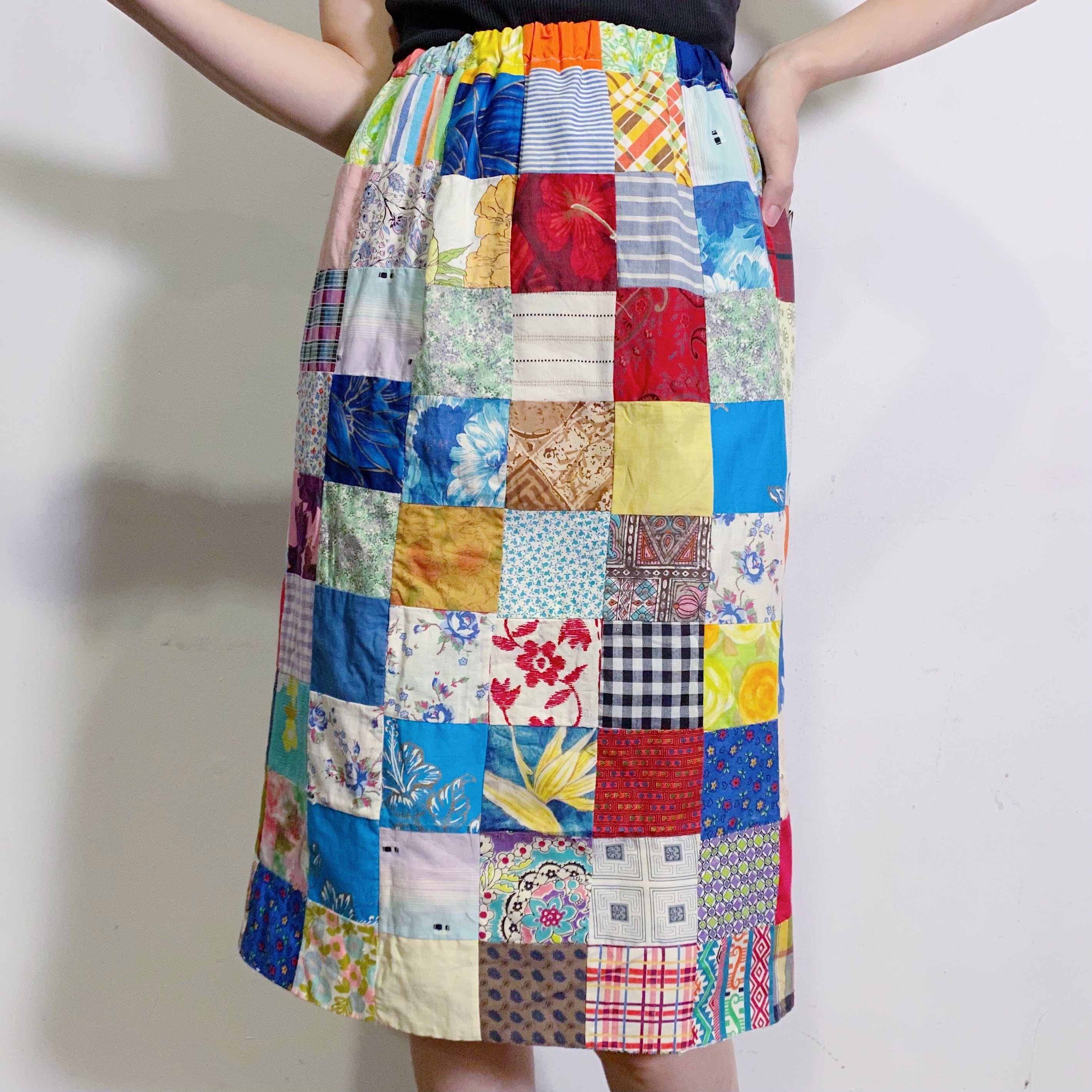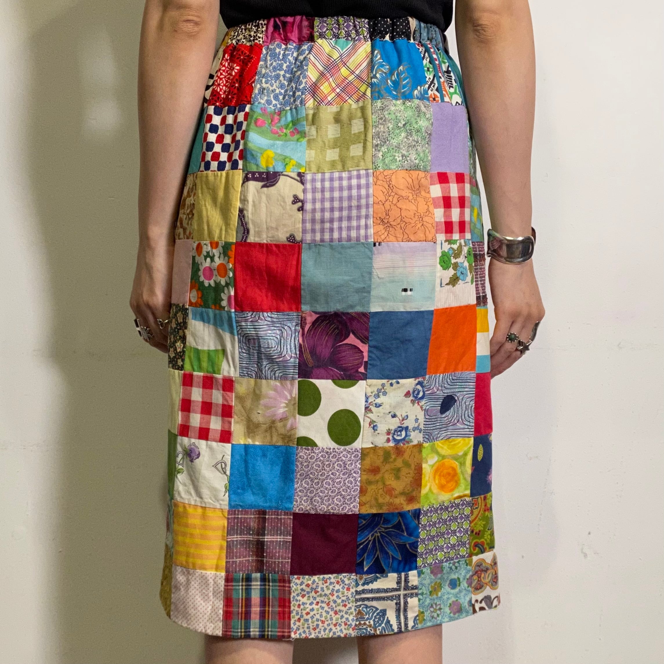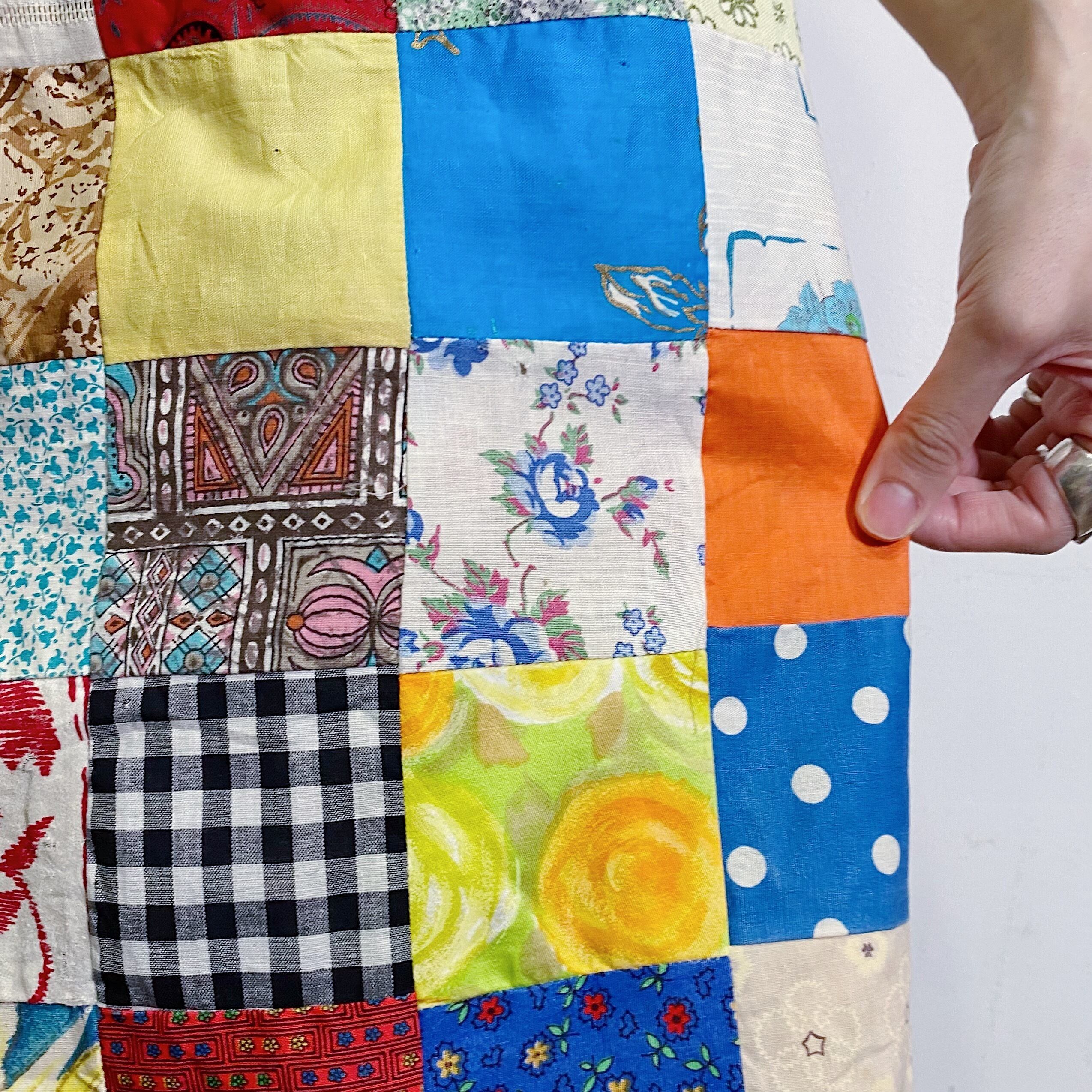 70sらしいカラフルなファブリックのパッチワークが可愛いスカートです。