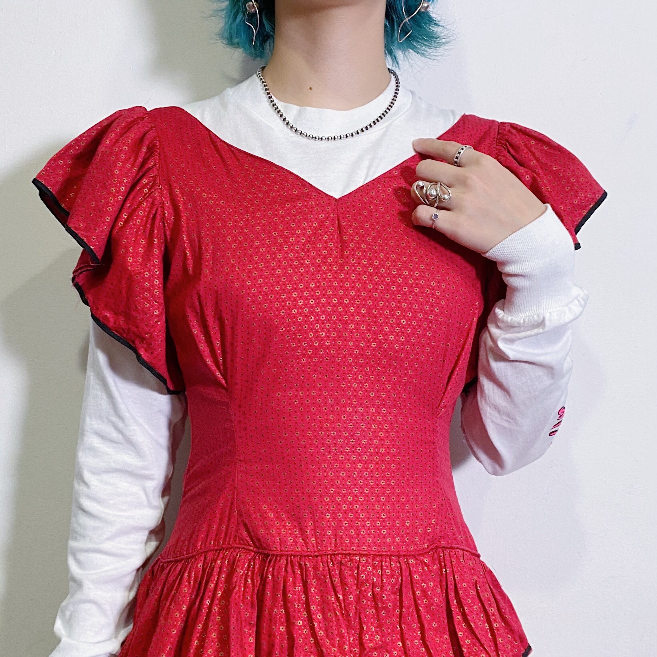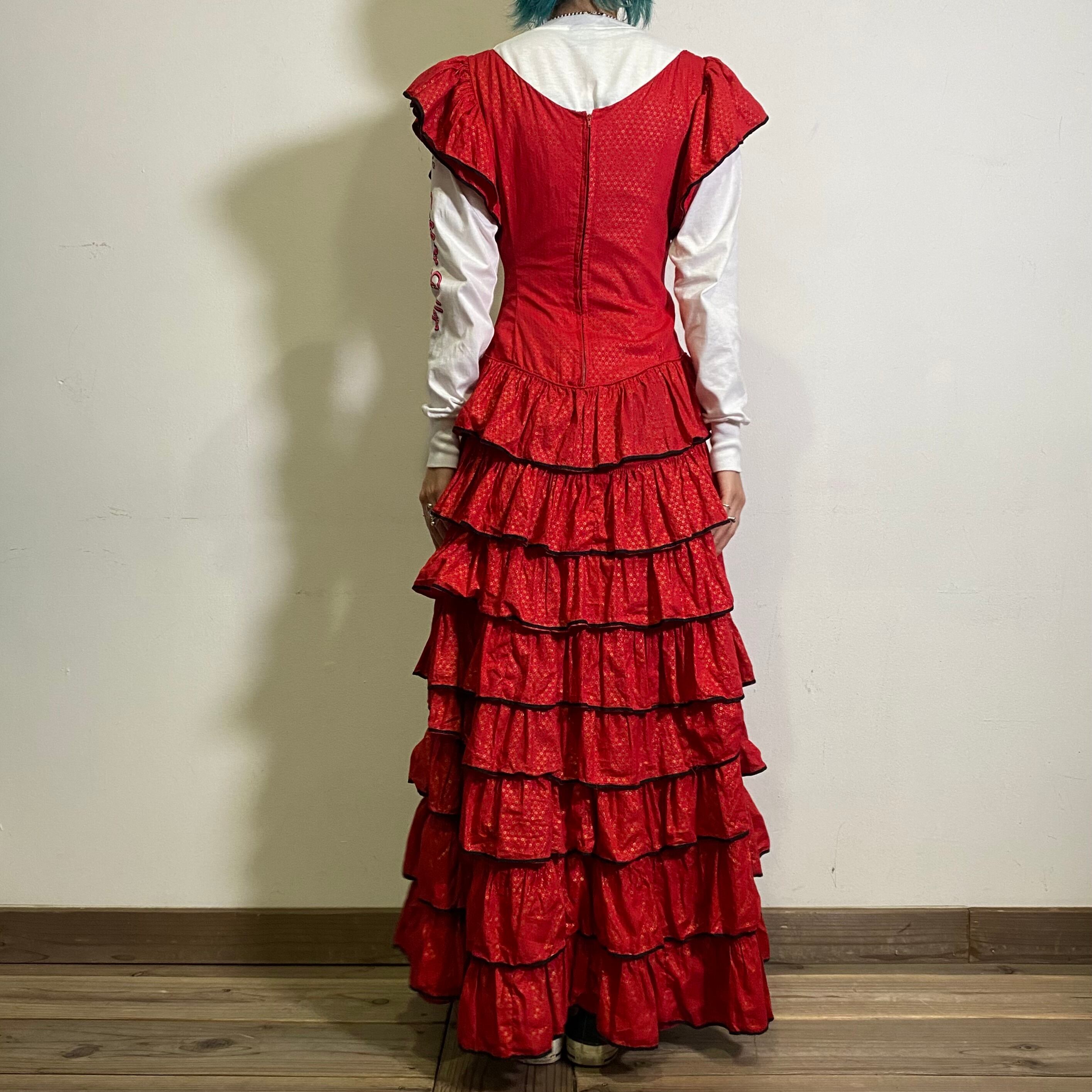 スカート部分の贅沢なフリルデザインが圧巻の、50年代のロングワンピースです。