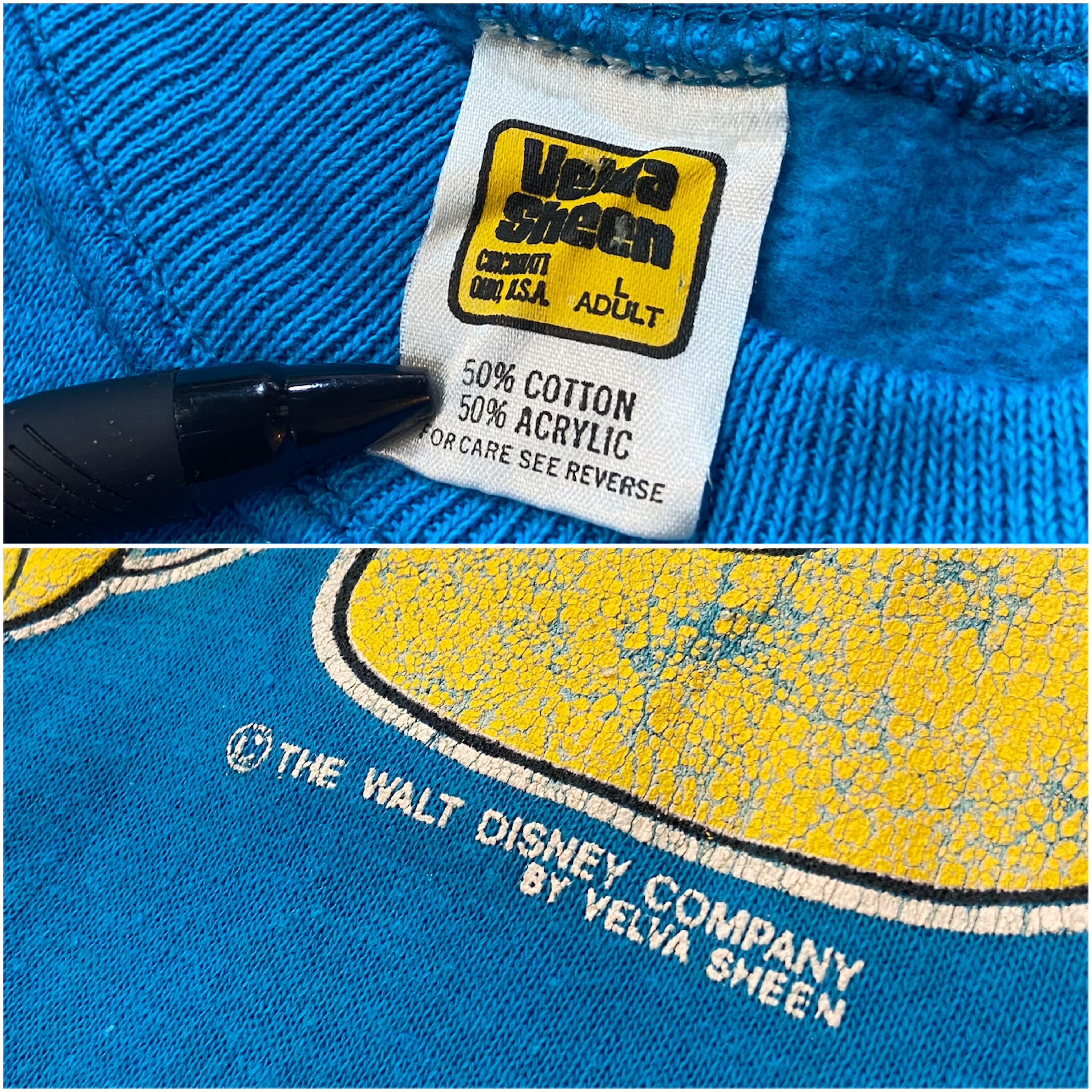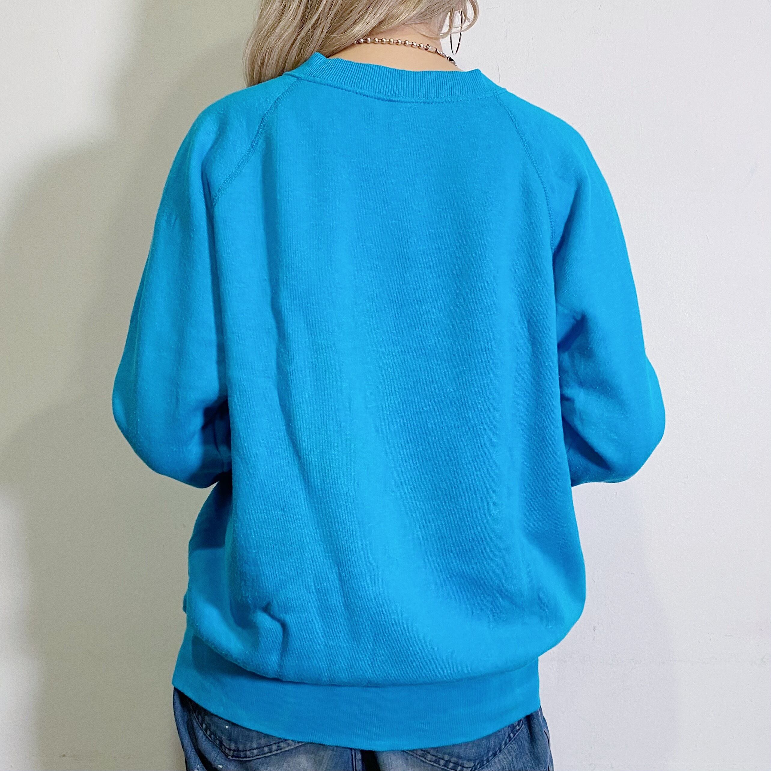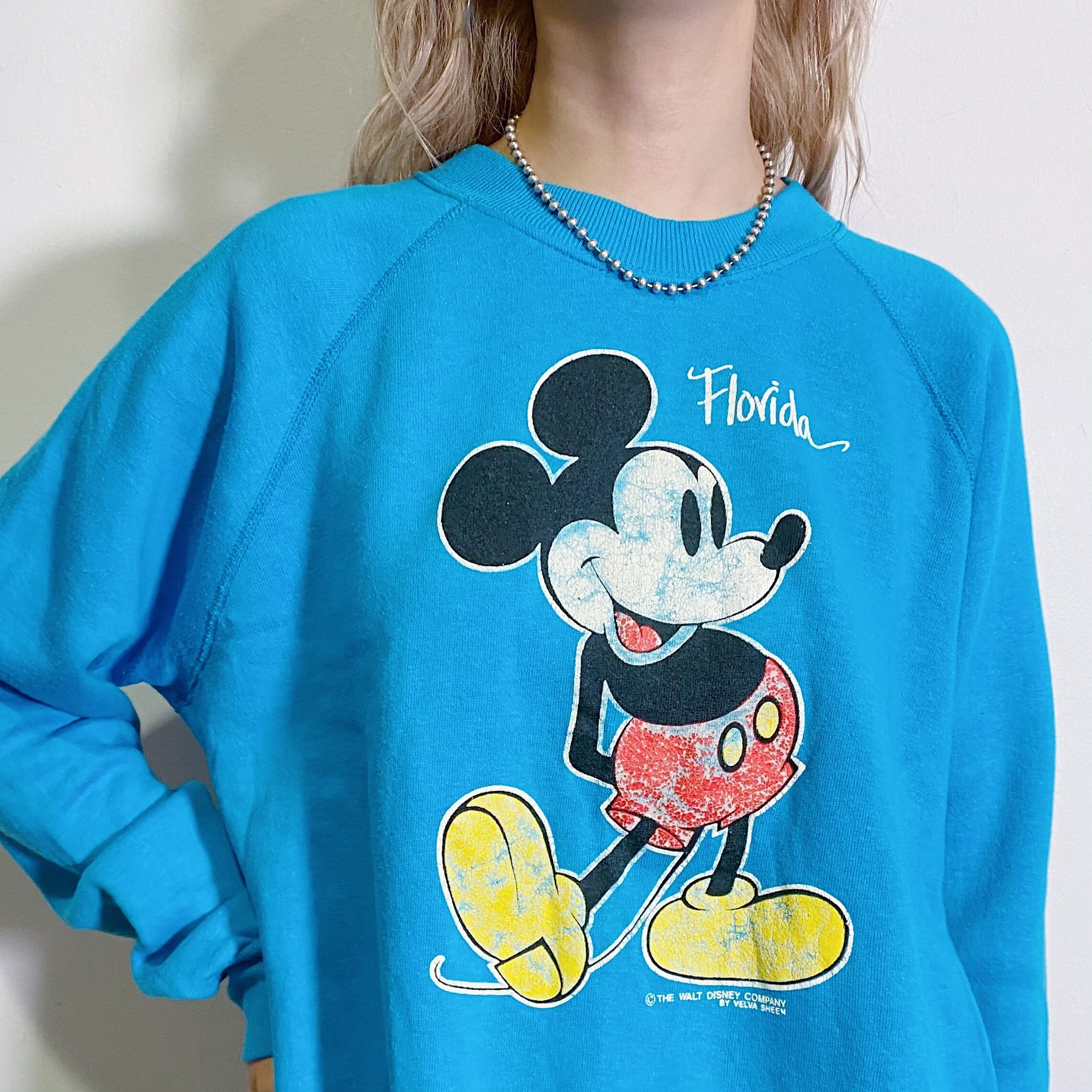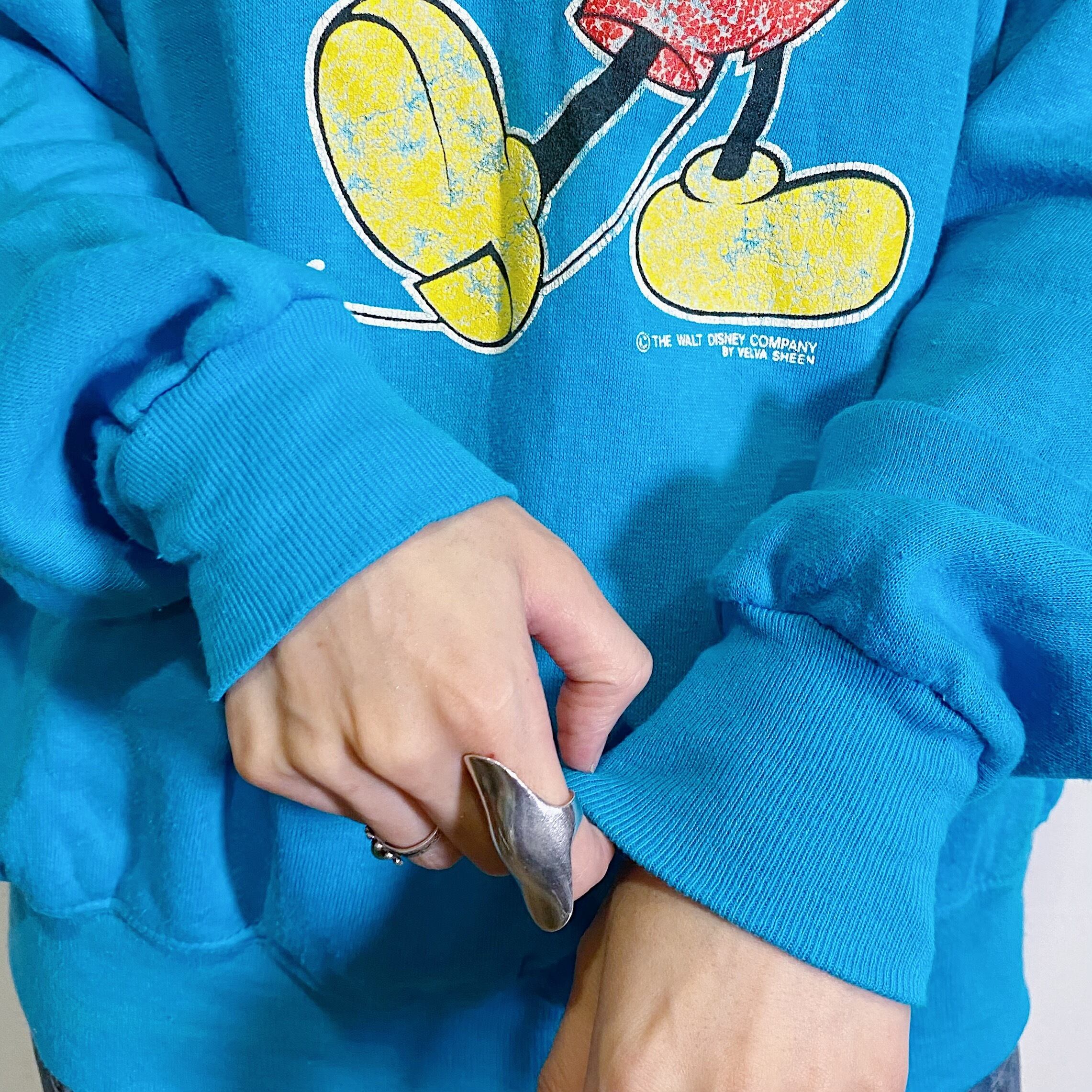 鮮やかなブルーボディにミッキーのプリントが可愛い、80年代のスウェットです。