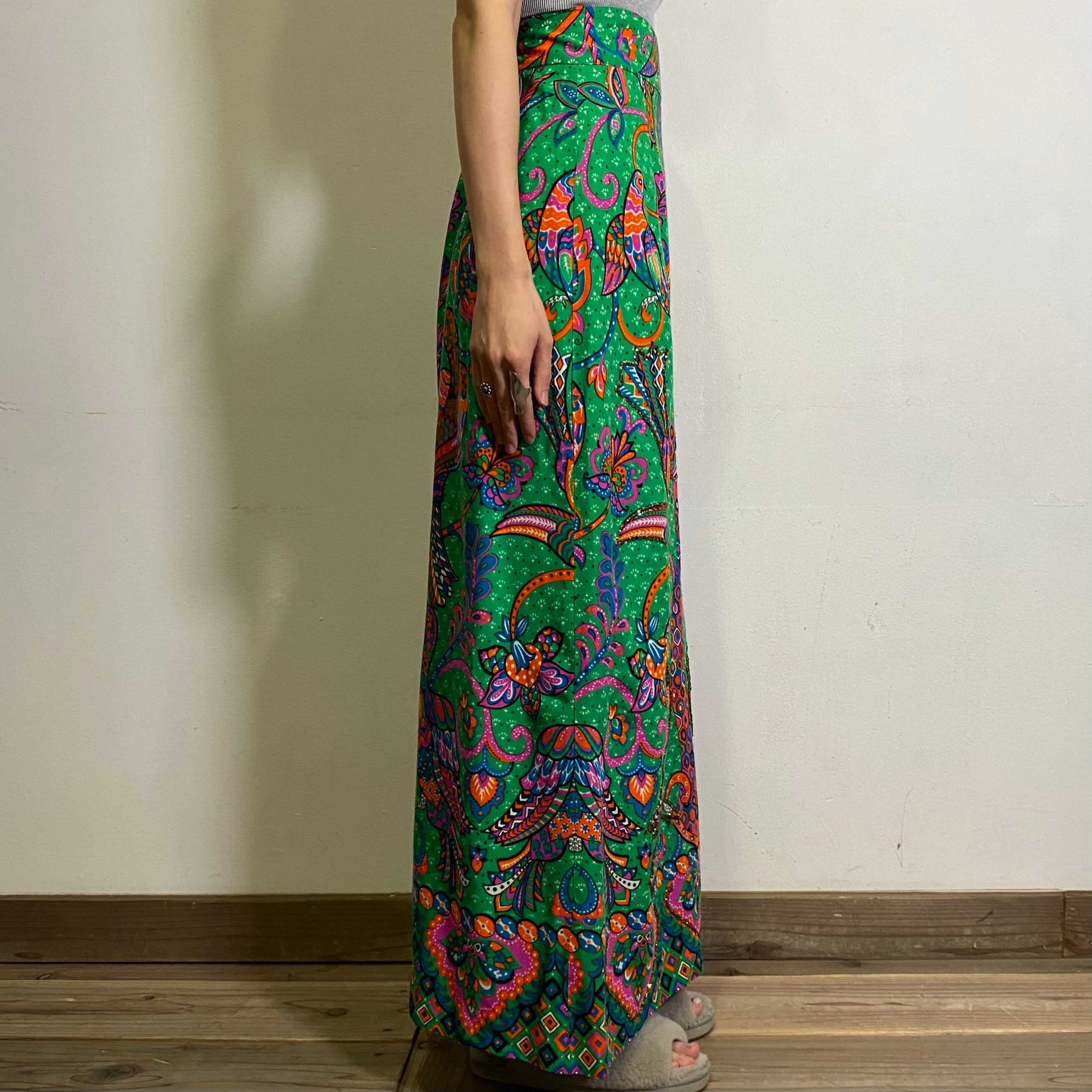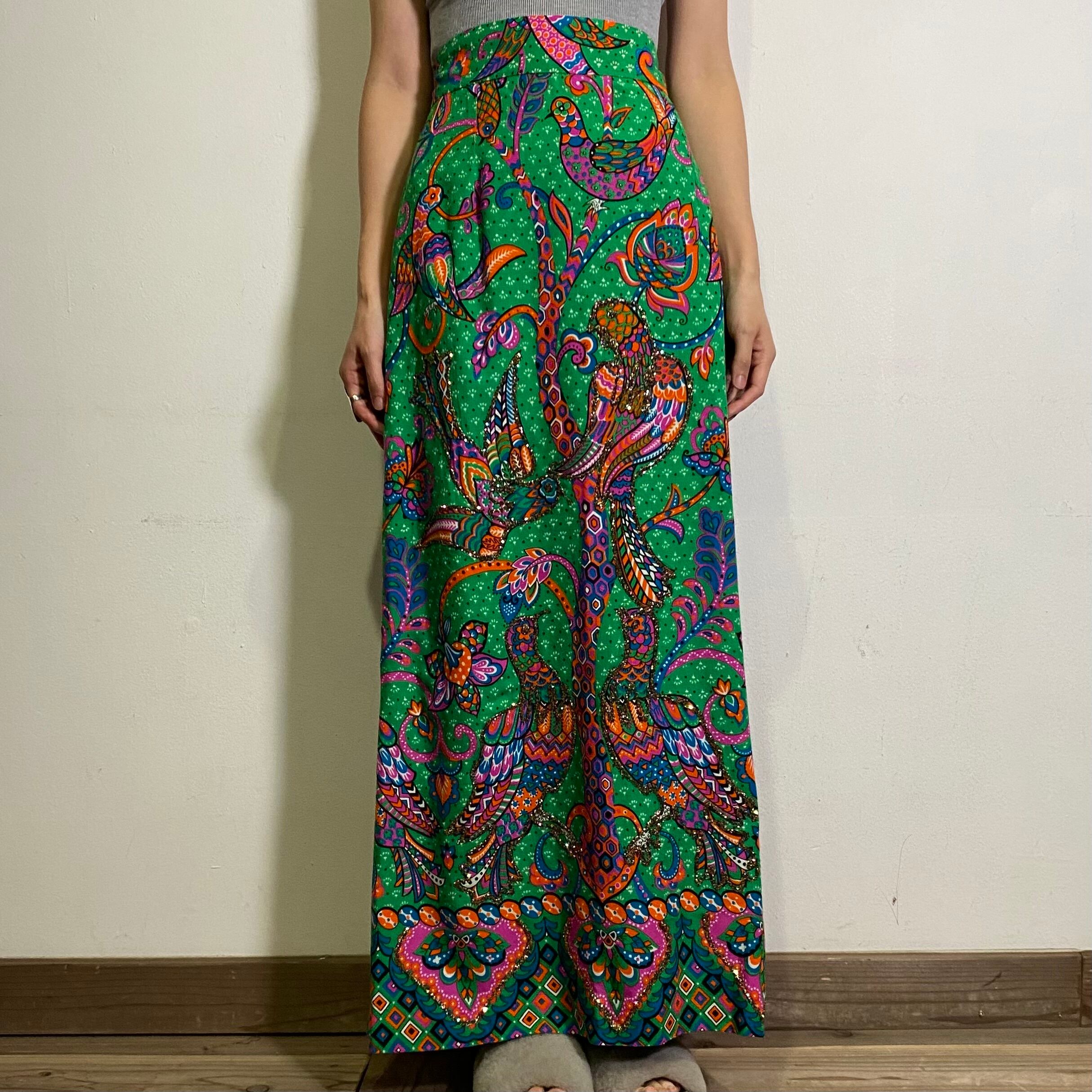 カラフルな鳥やお花などのテキスタイルがとっても素敵な、70年代のロングスカートです。