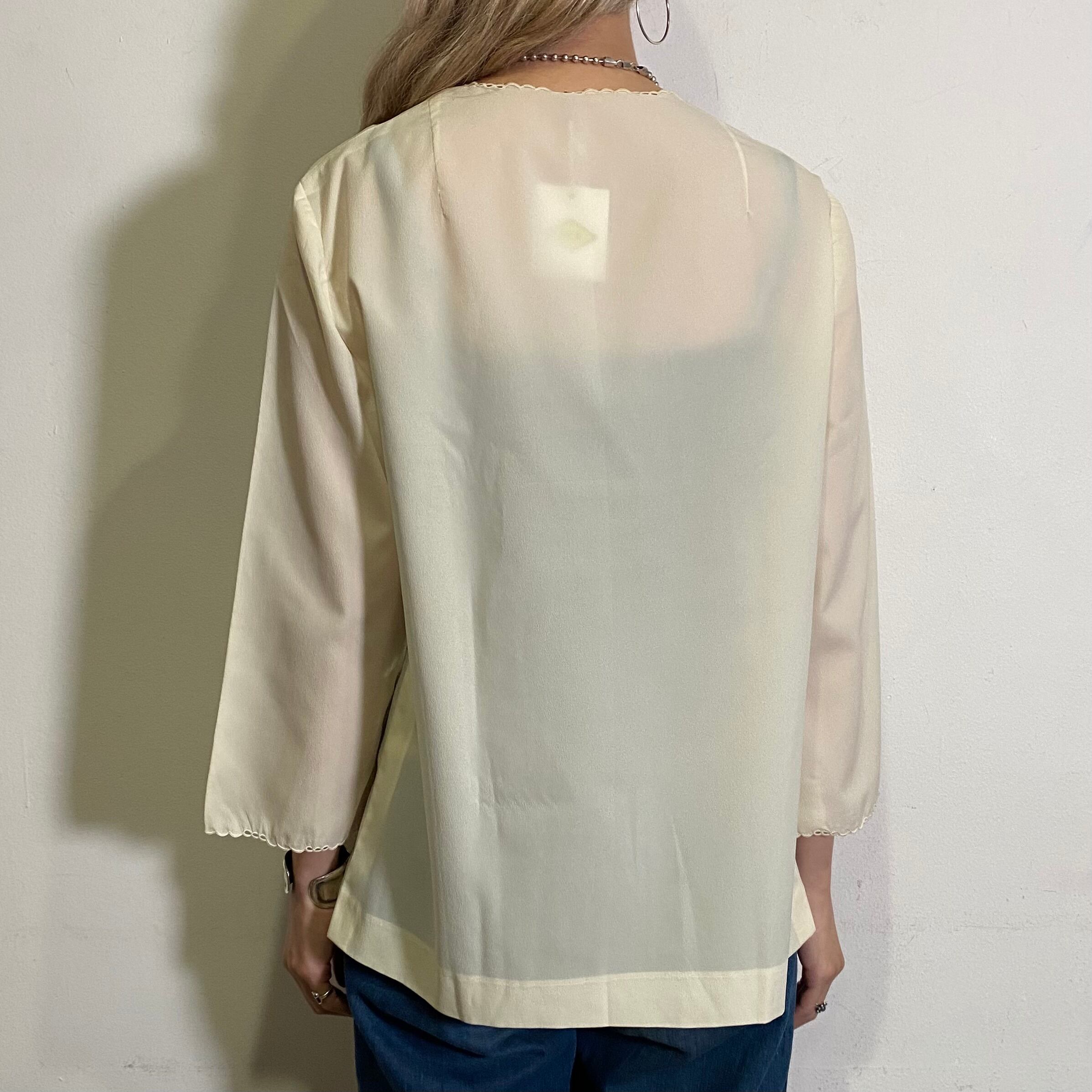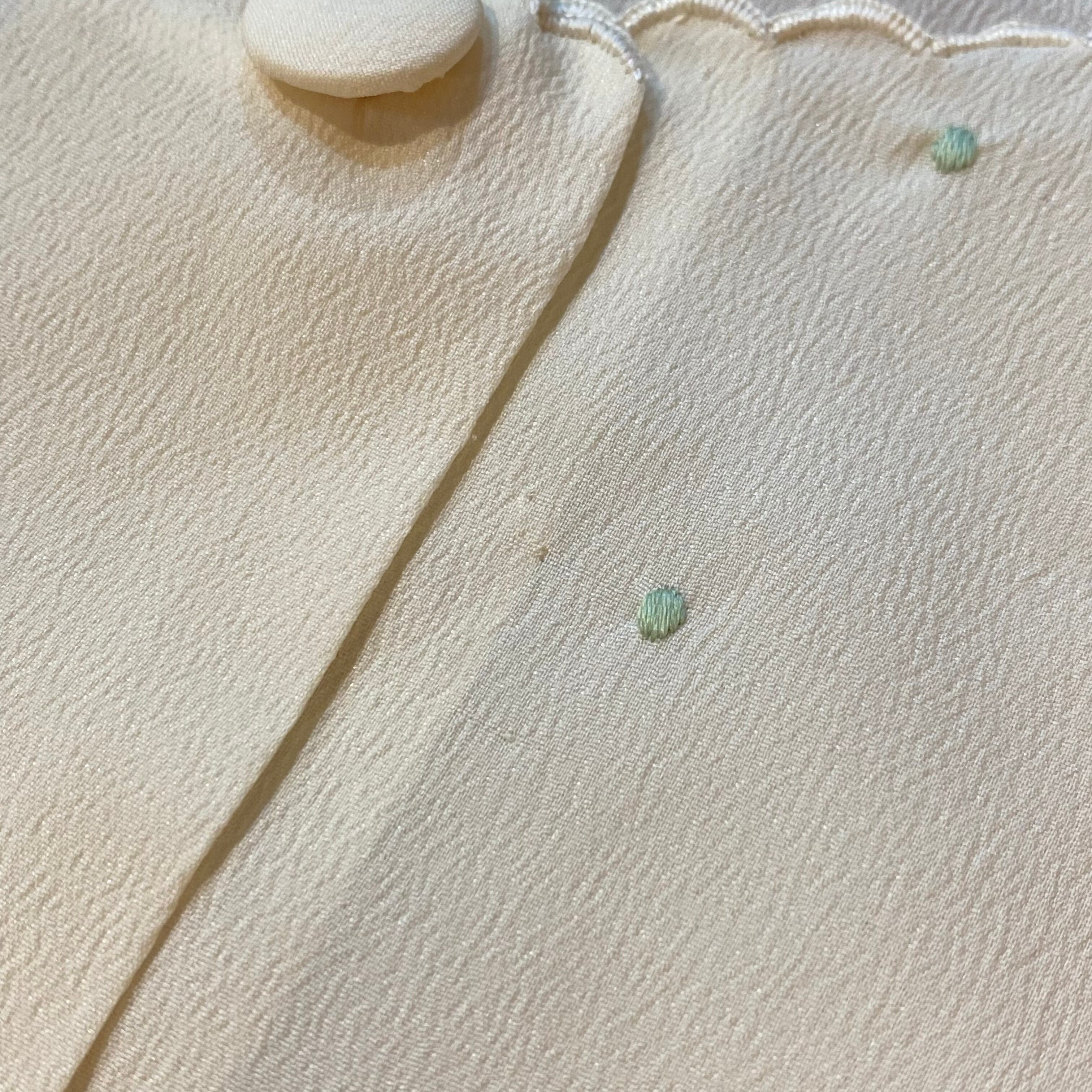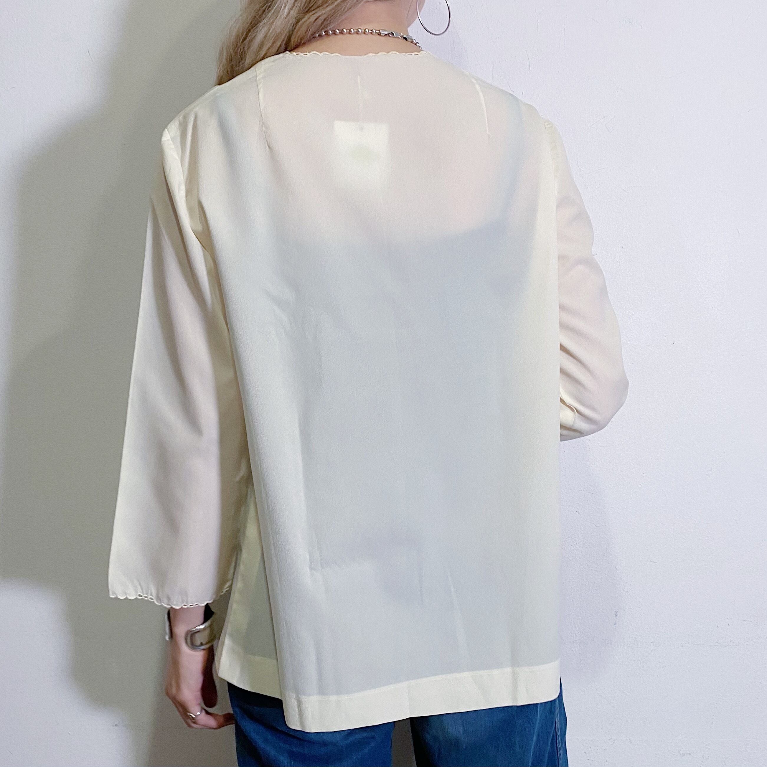 首回りや袖口がスカラップのようになっており、凝ったつくりの一枚。