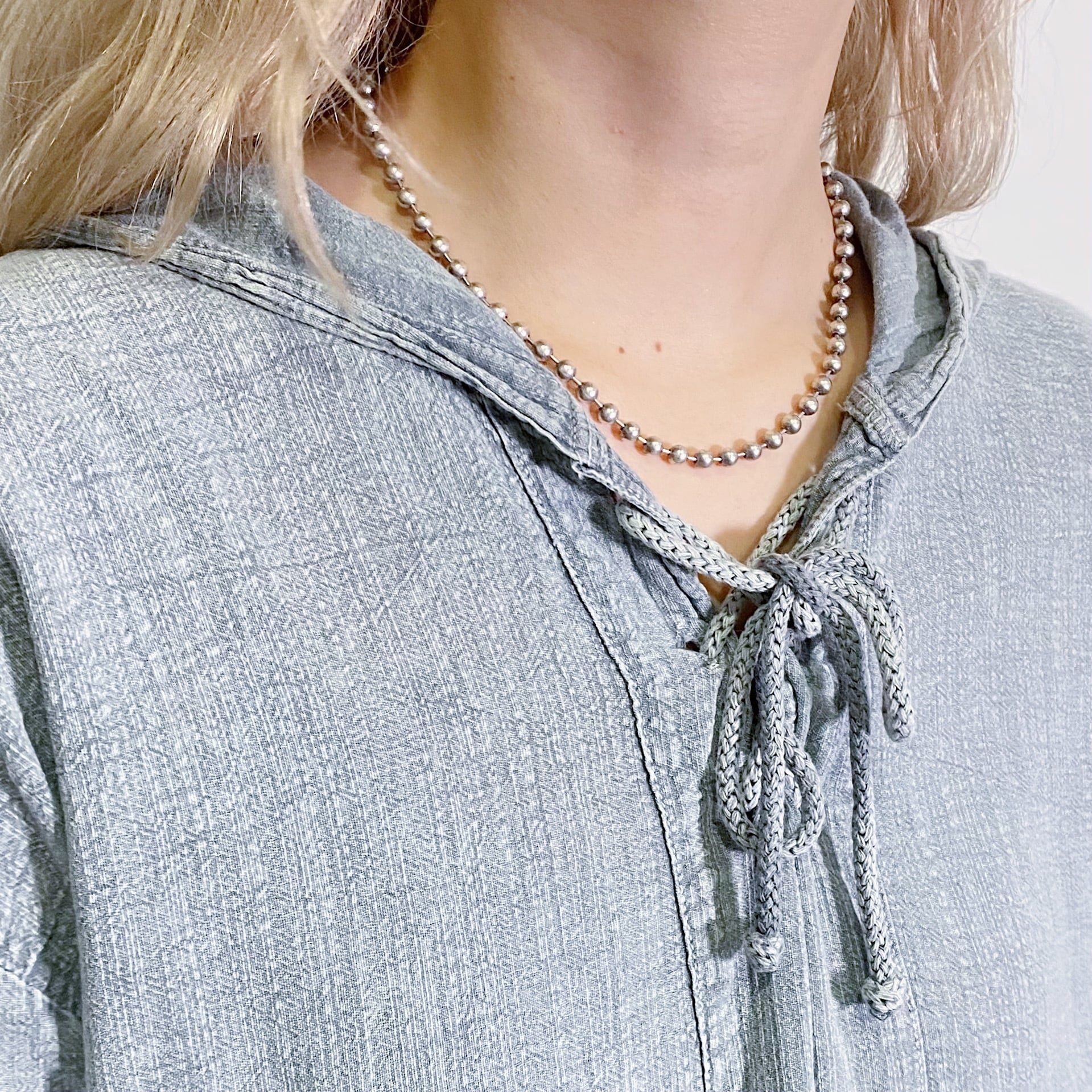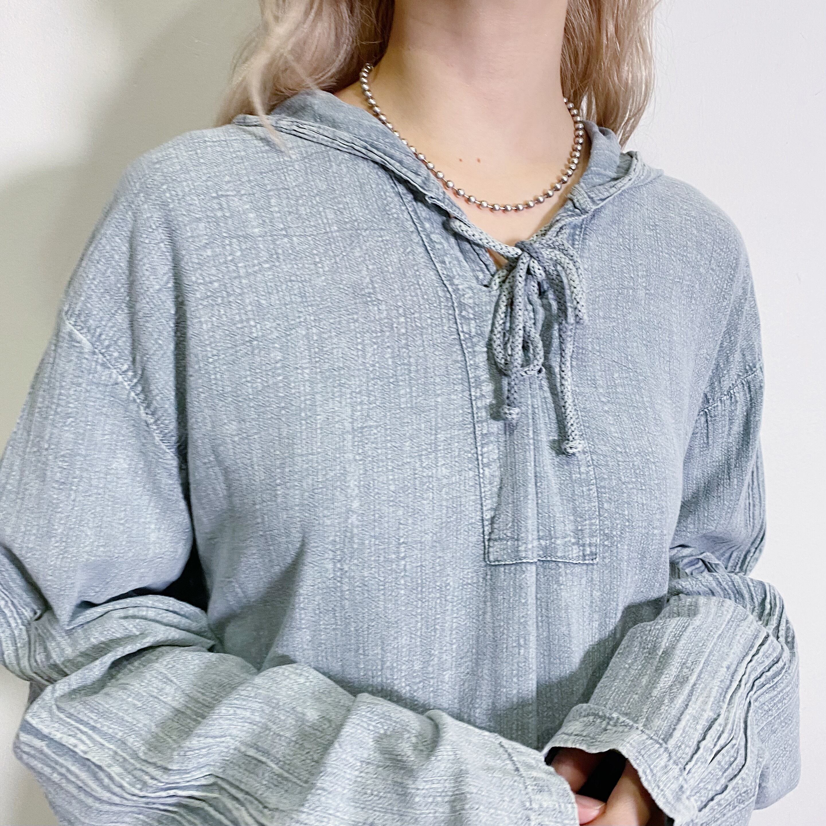 ゆったりとしたサイズ感で着こなしやすく、首元の編み上げやポケットが可愛いですよ。