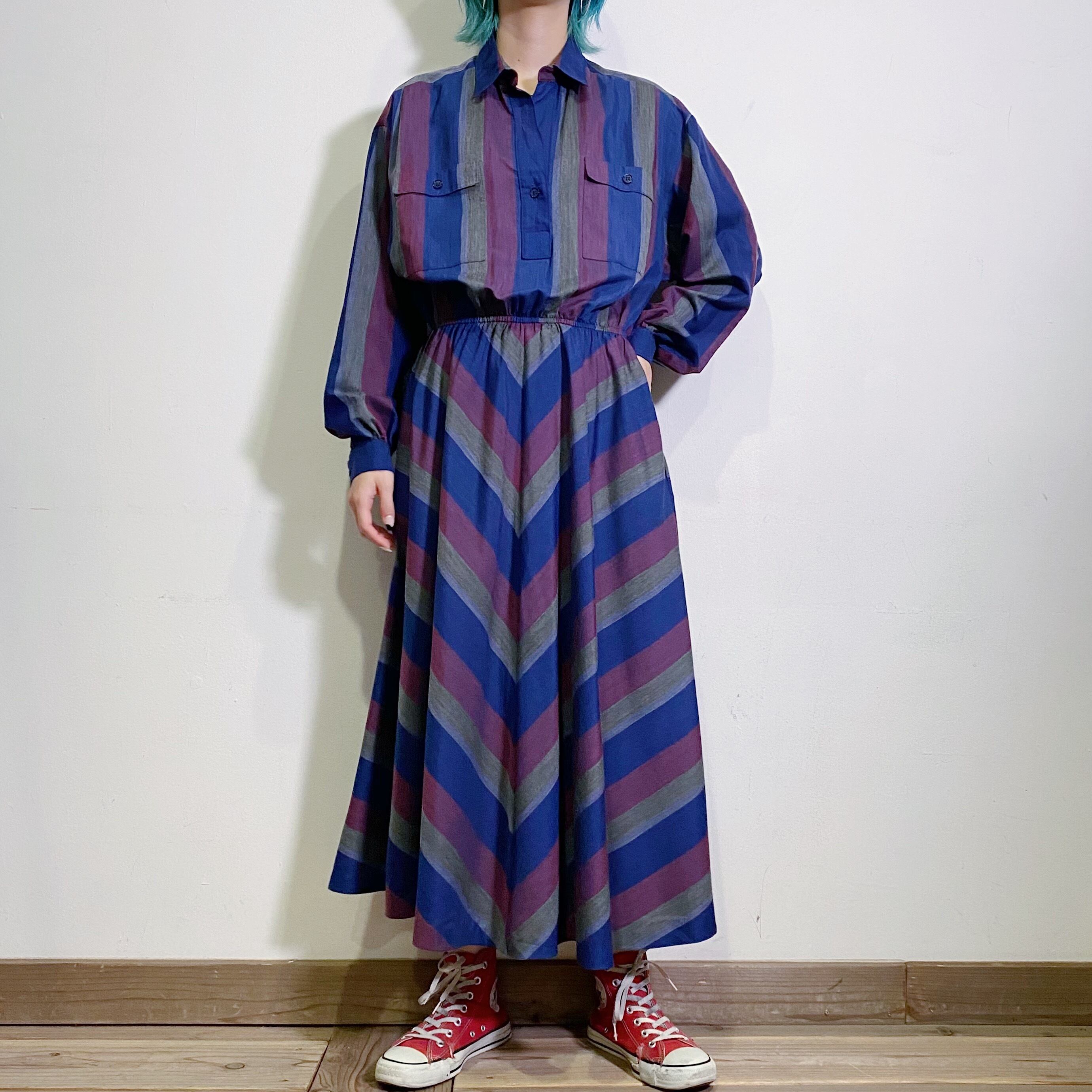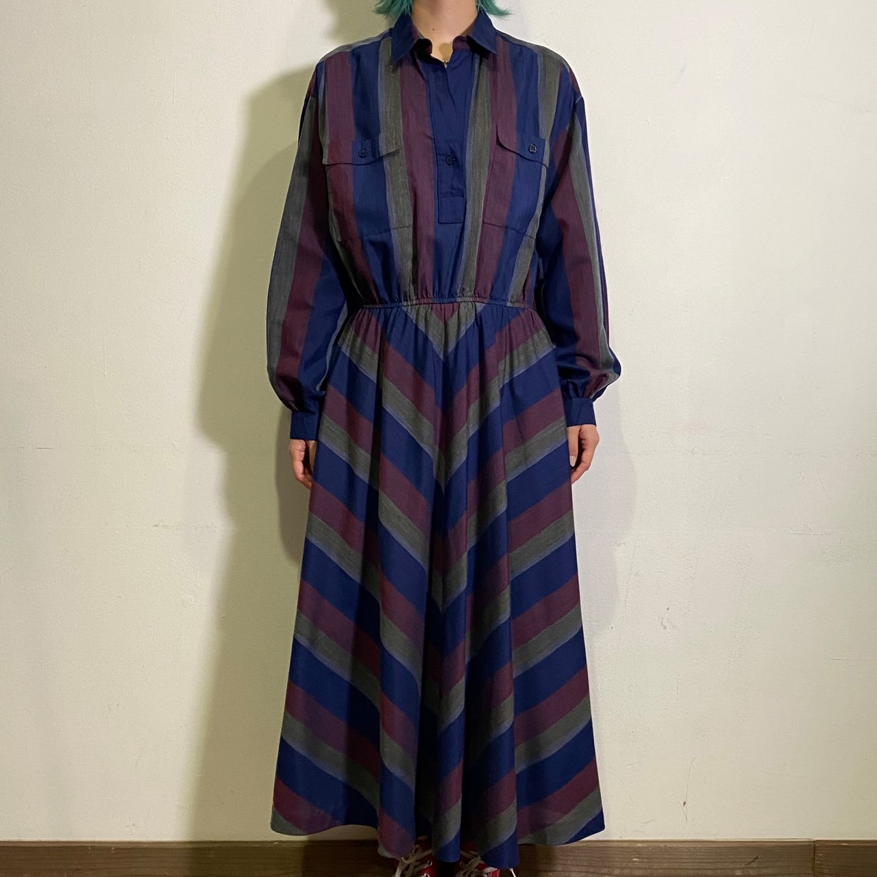 ネイビーやグレーなどの落ち着いた色合いのストライプが大人可愛い、80年代のワンピースです。