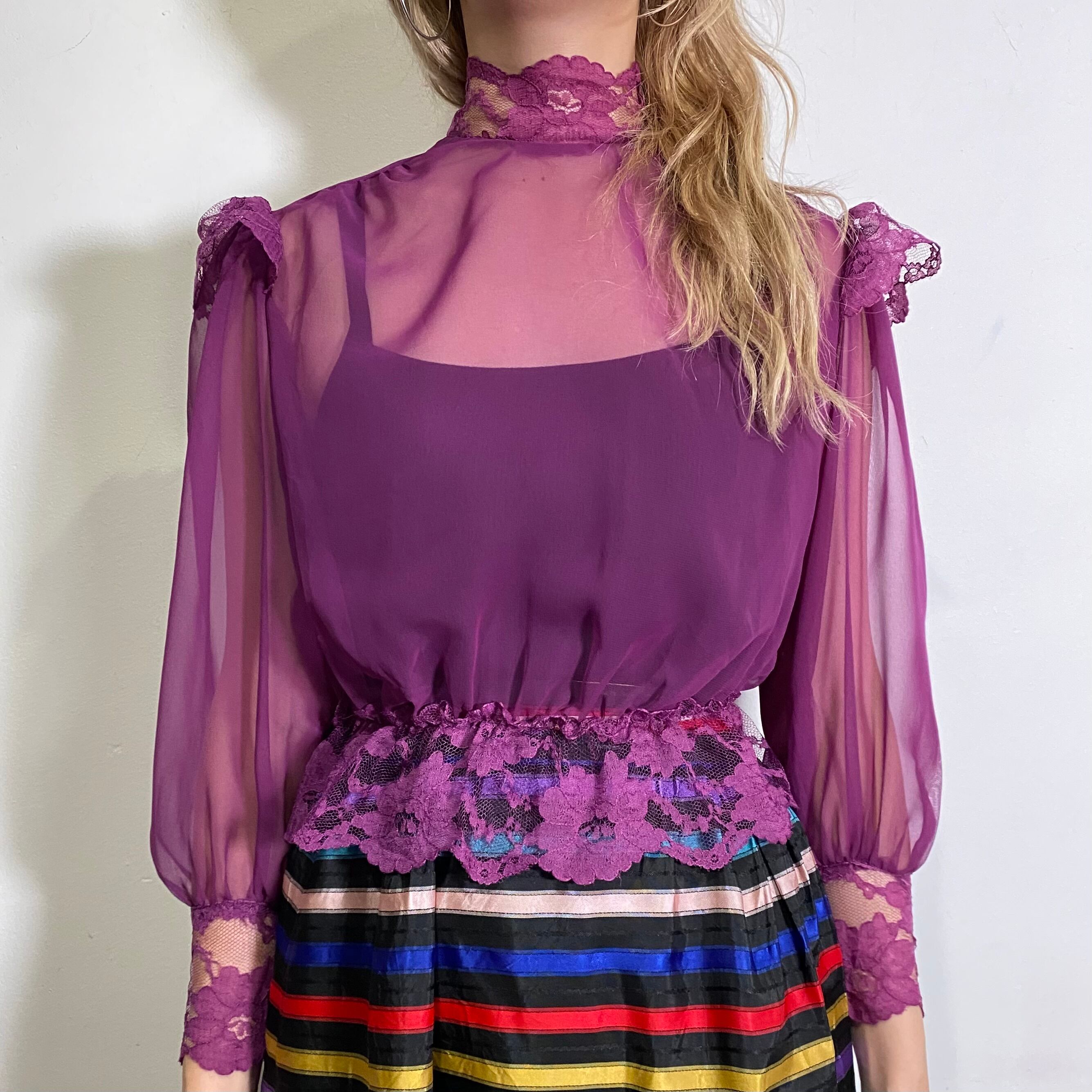 肌が透けるシアーな素材感がとっても素敵な、70年代のブラウスです。