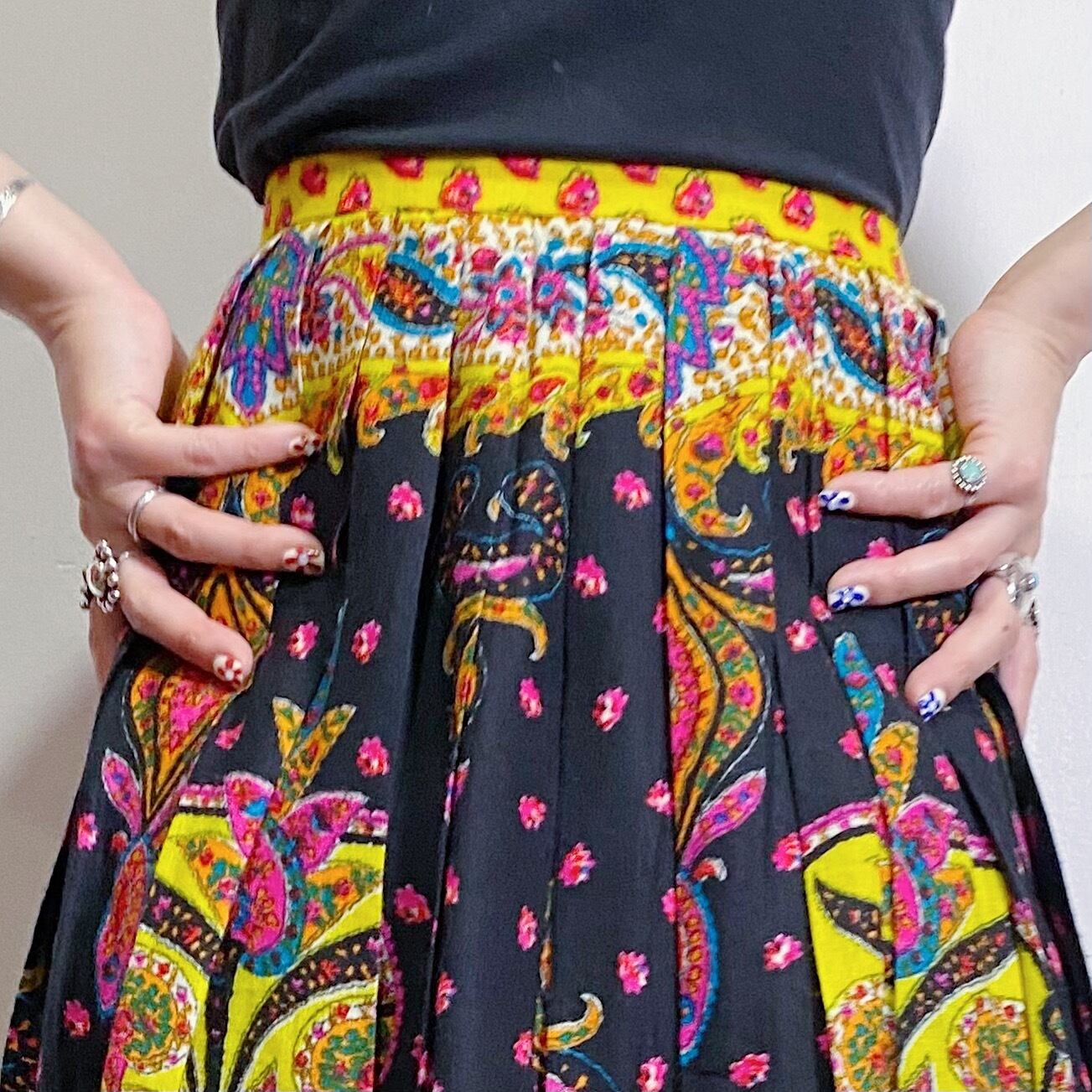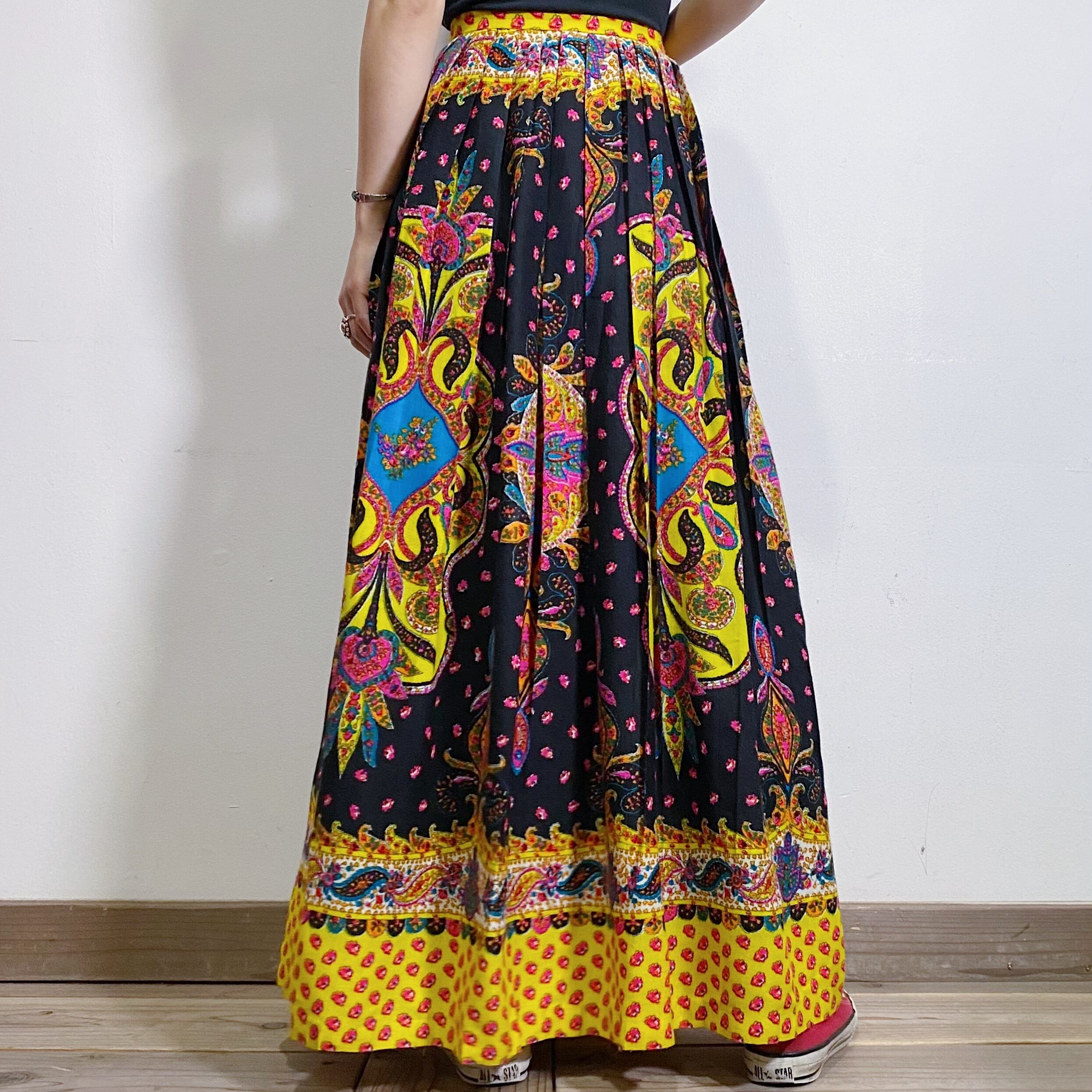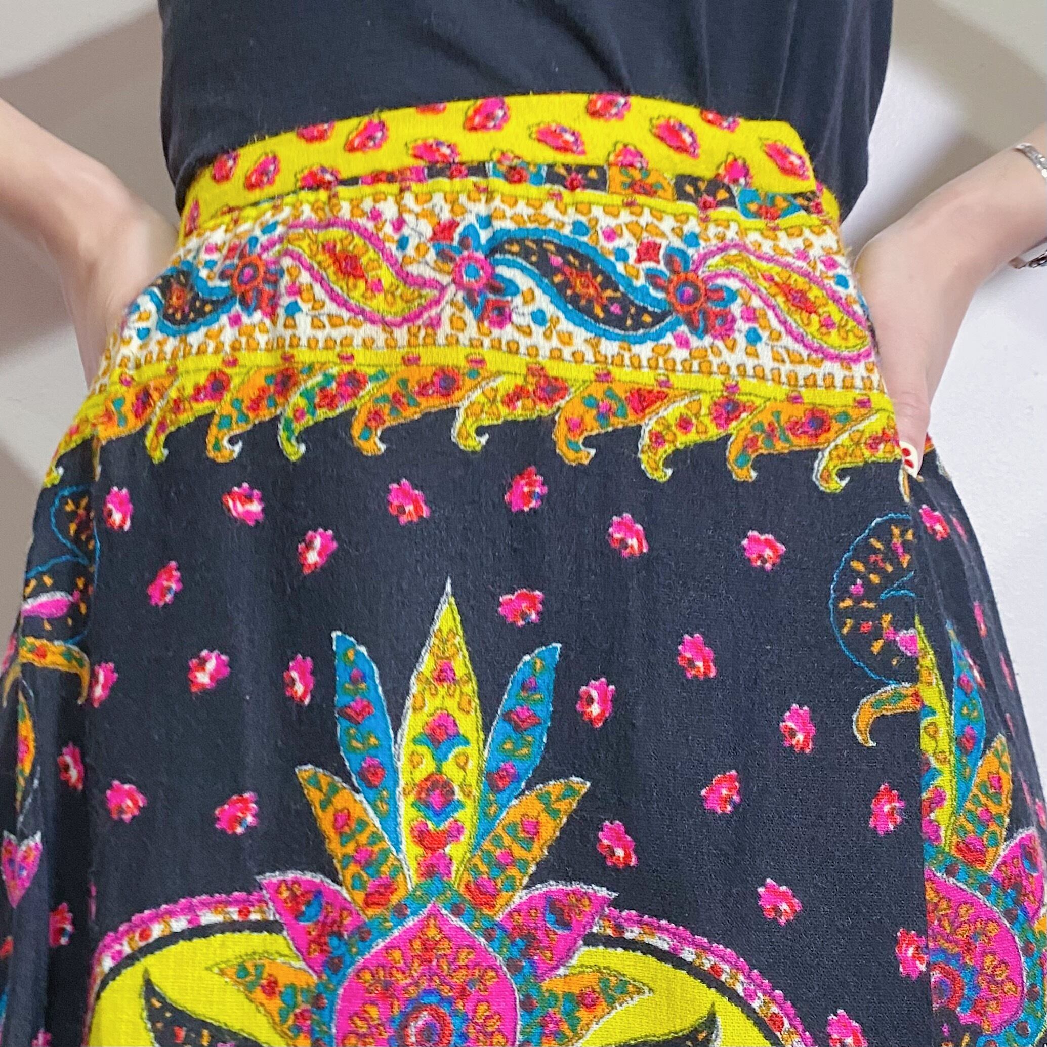 ピンクやイエローなどのカラフルな色合いが可愛い、70年代のスカートです。