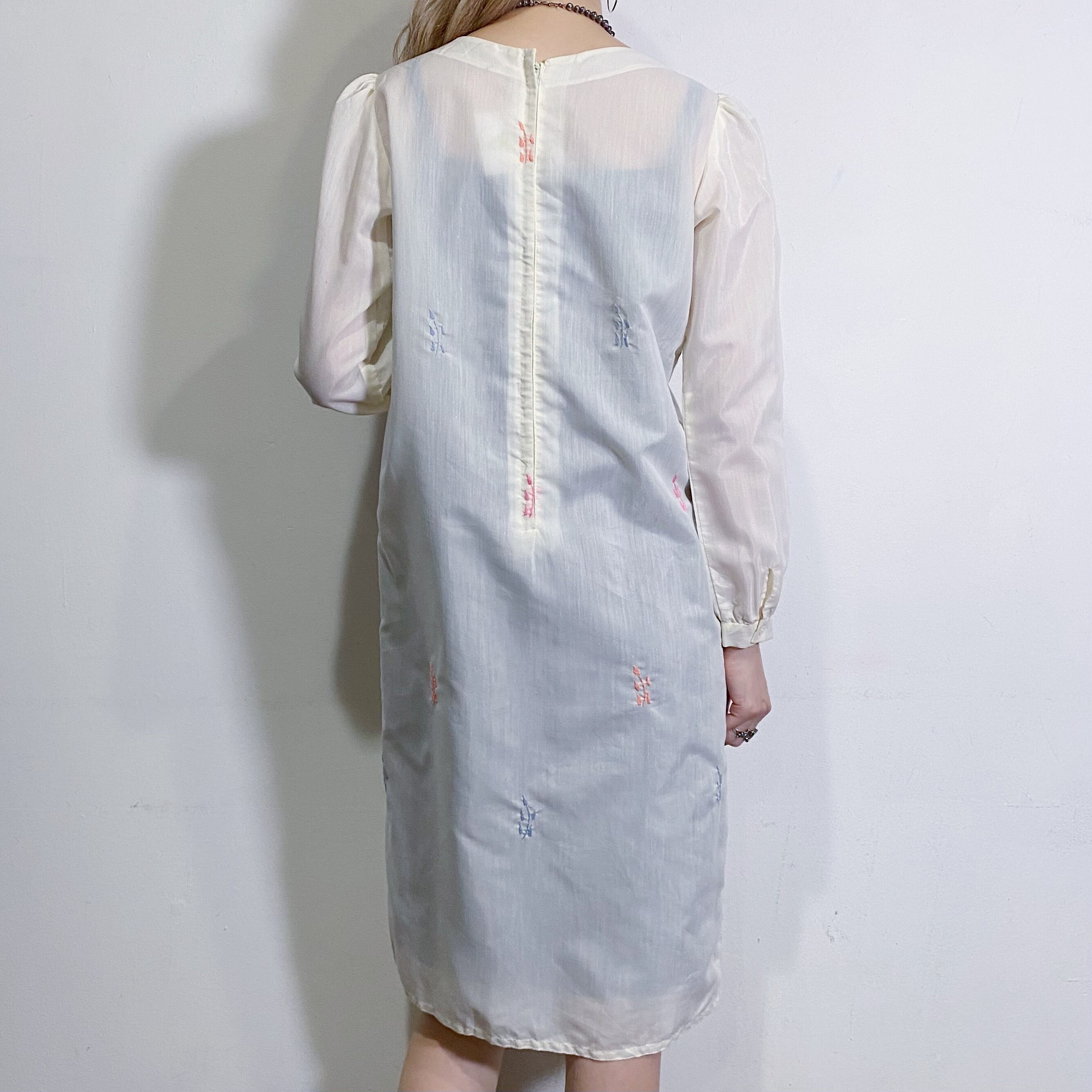 カラフルなパステルカラーのお花の刺繍が可愛い、70年代のワンピースです。