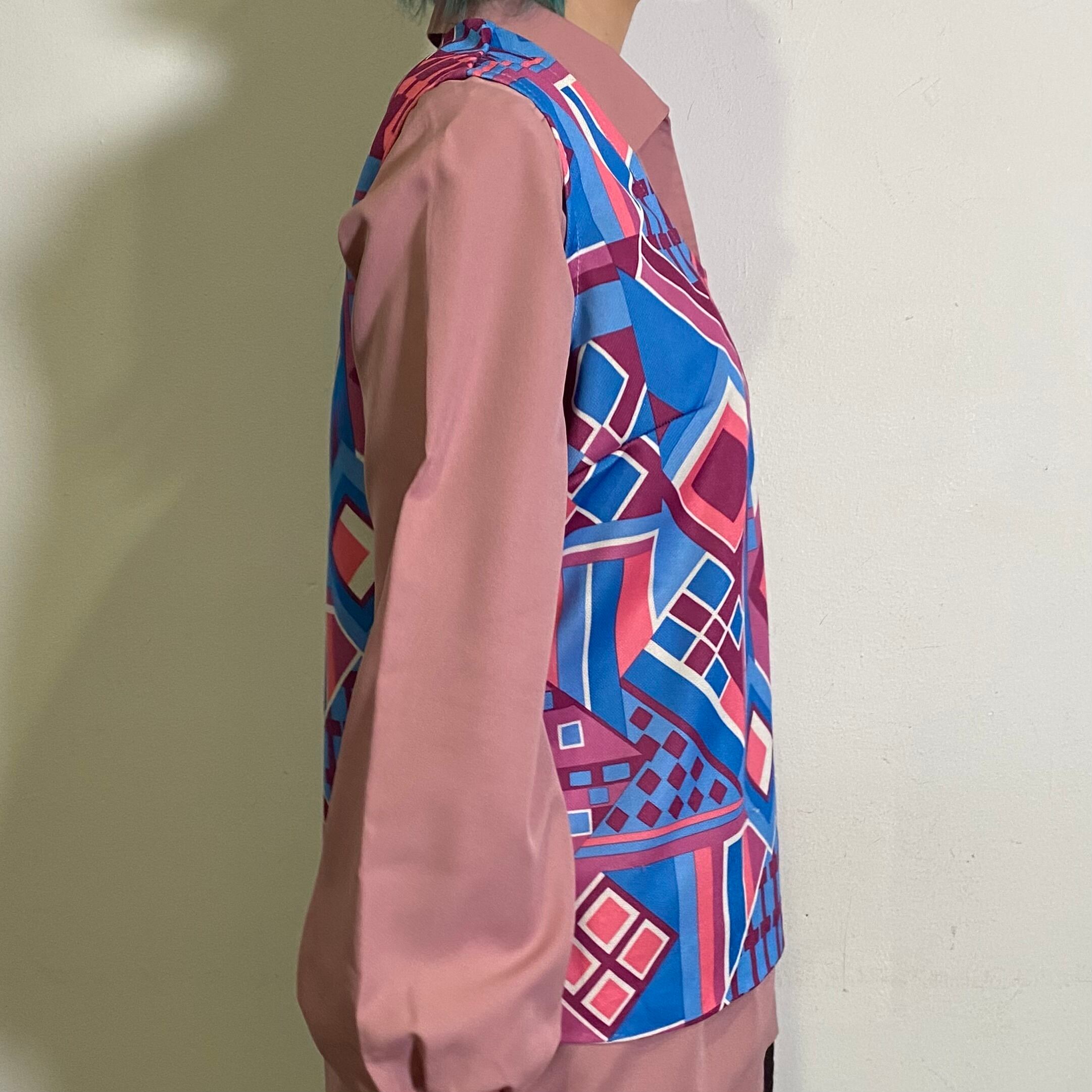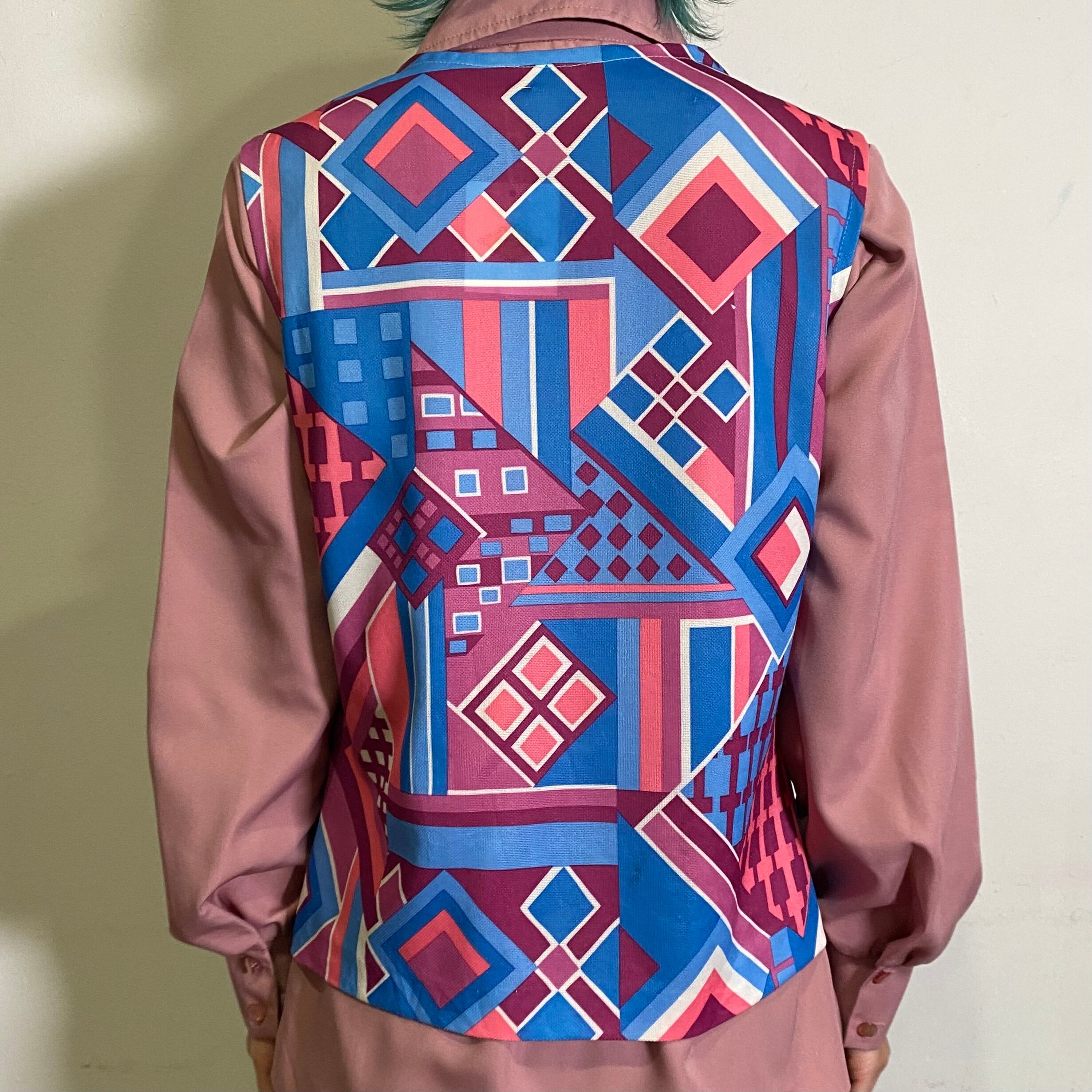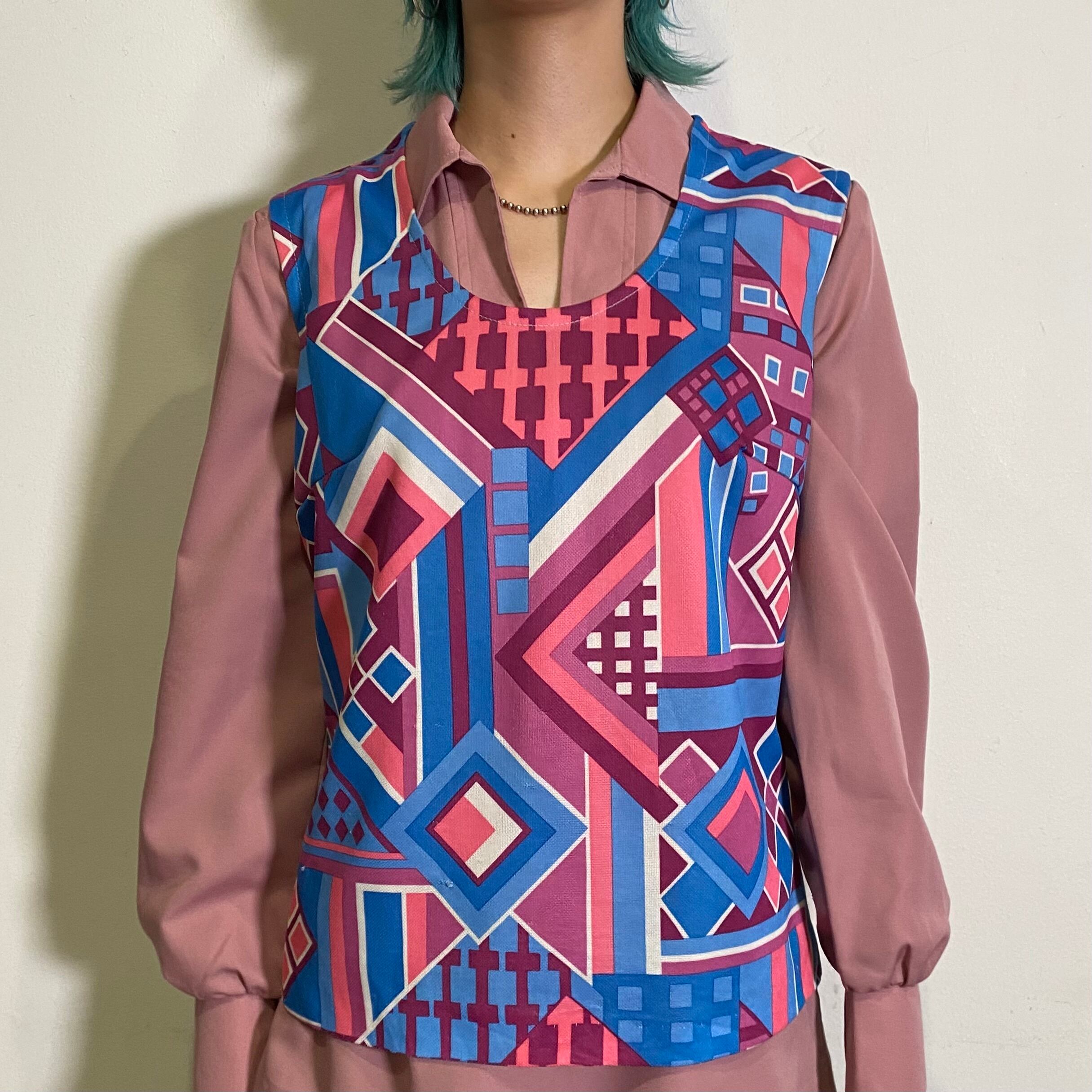 ピンクやブルーの幾何学模様が可愛い、70年代のノースリーブトップスです。