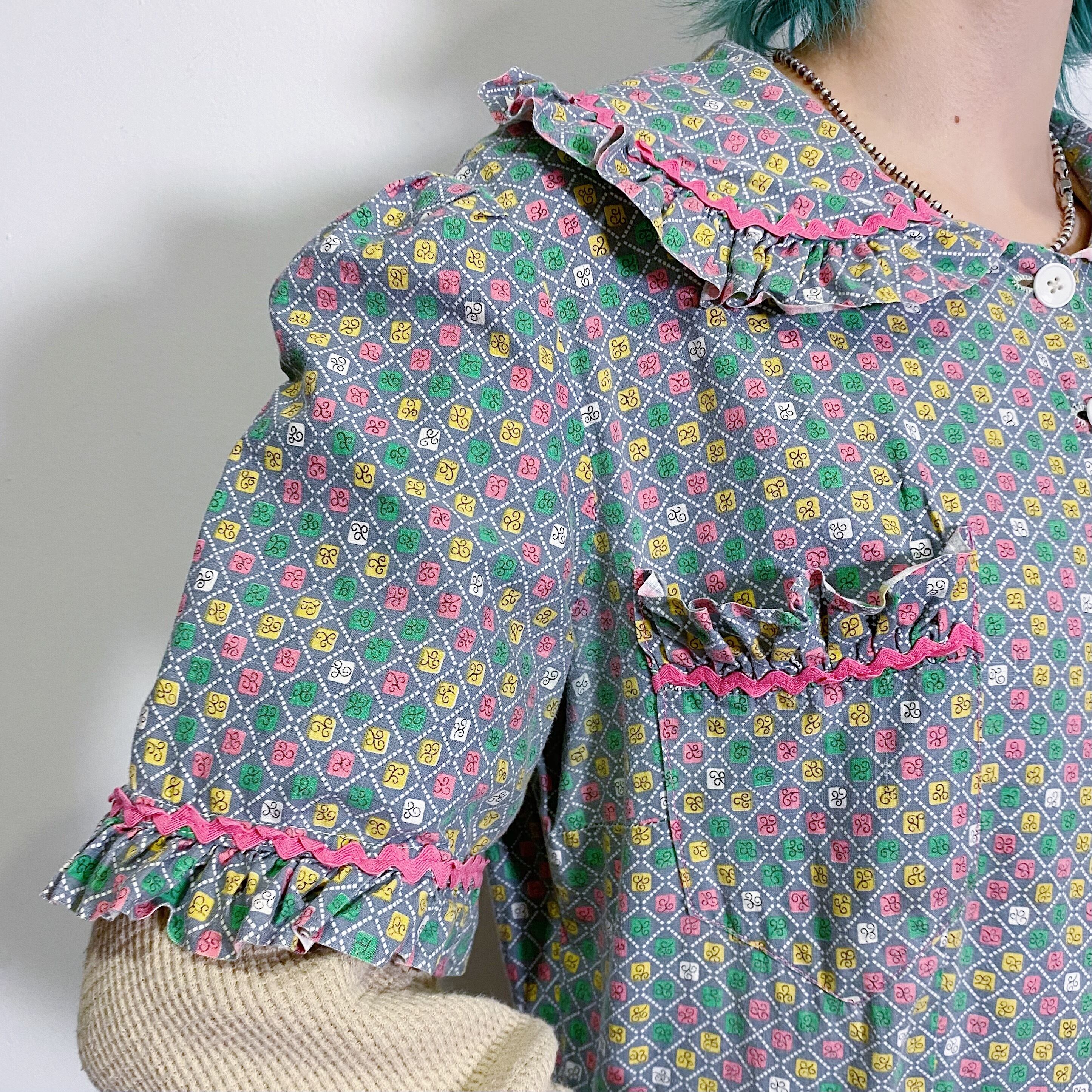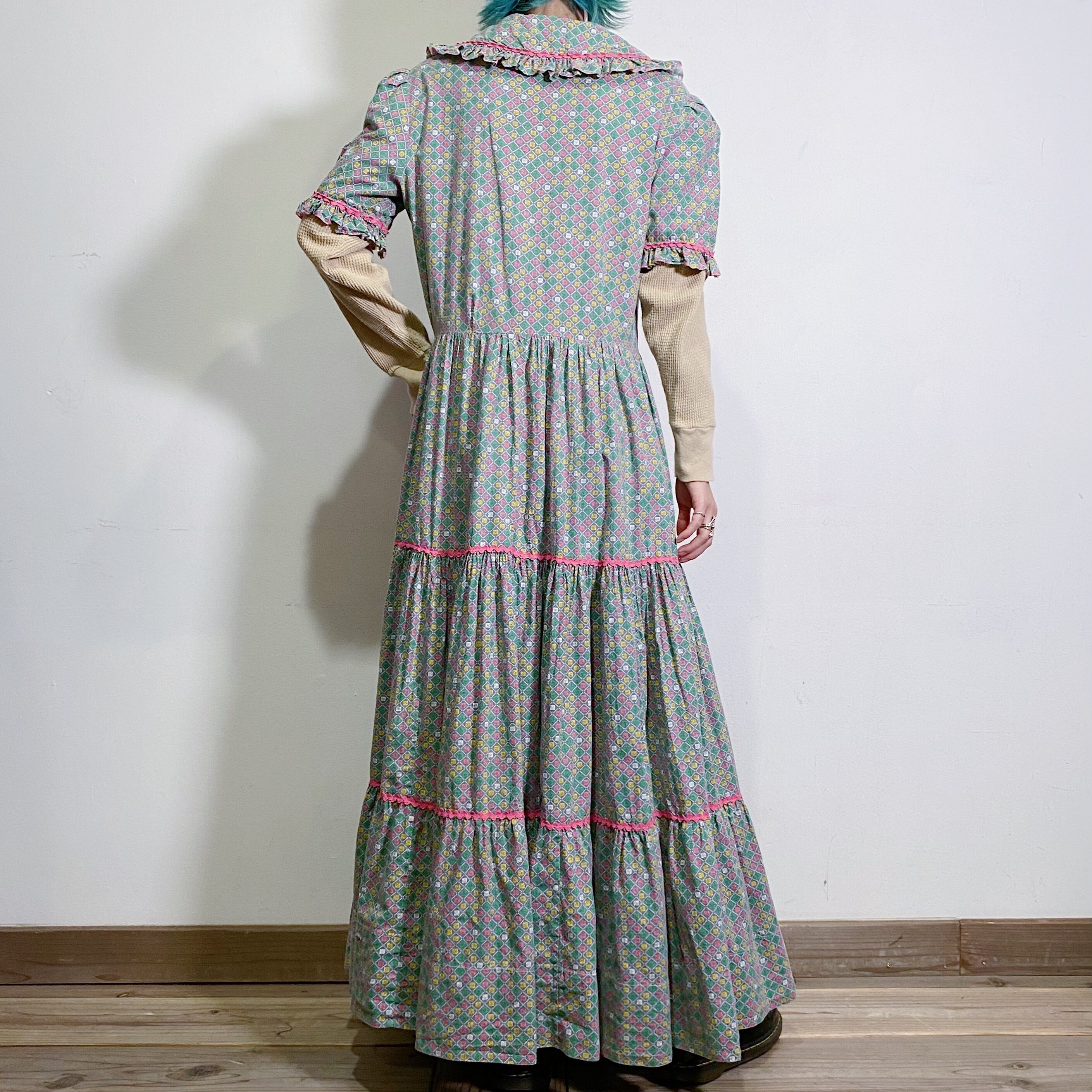 ピンク・イエロー・グリーンのお菓子のラッピングペーパーのような柄が可愛い、50年代のロングワンピースです。