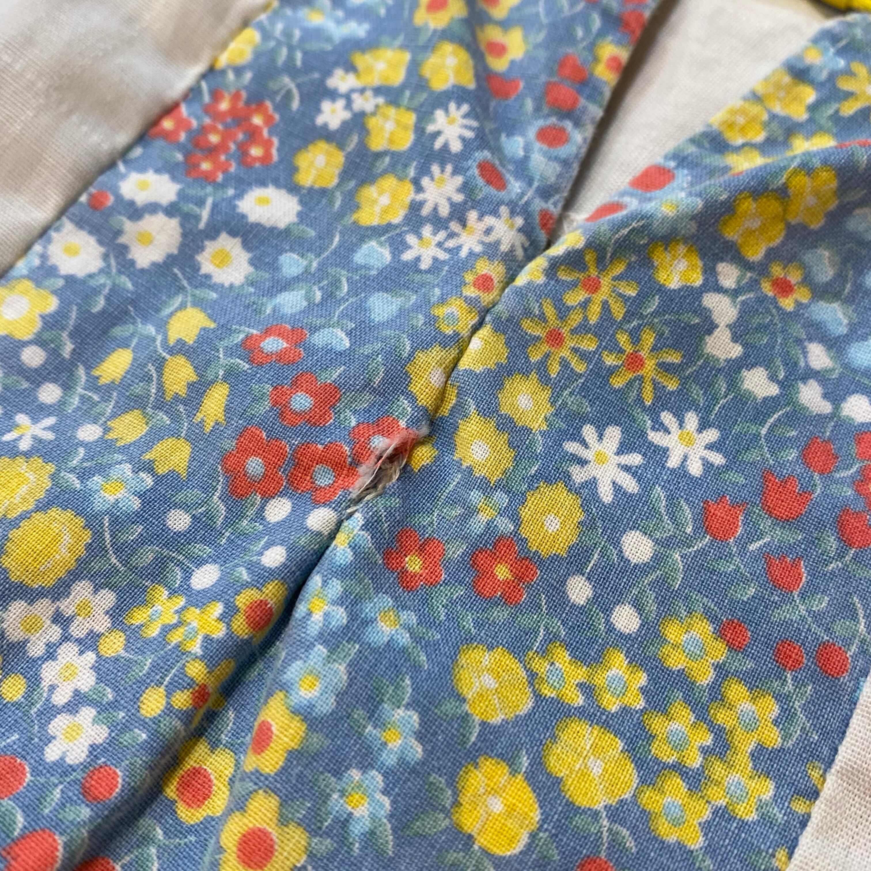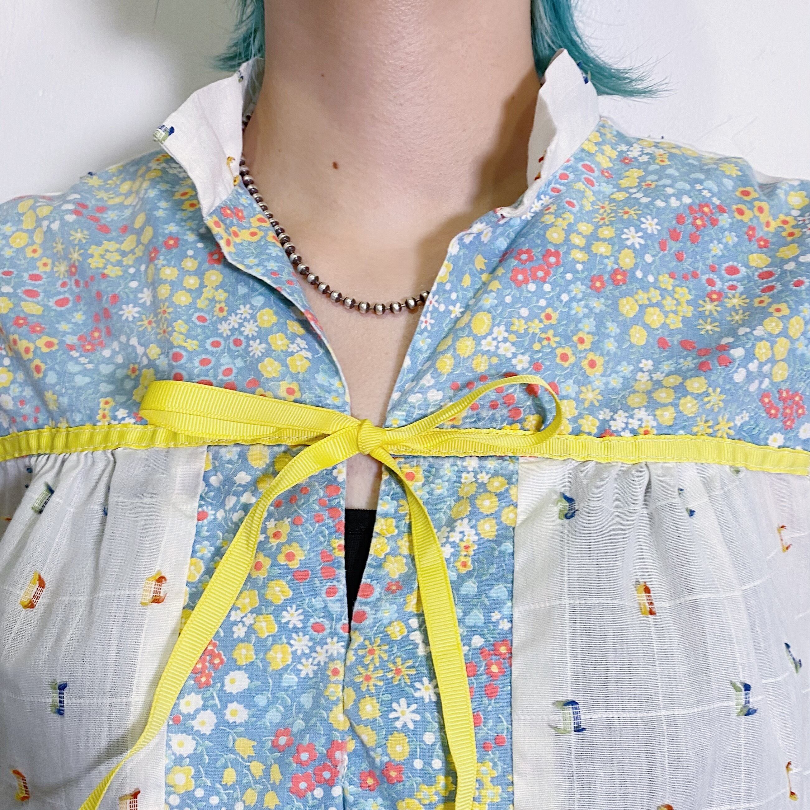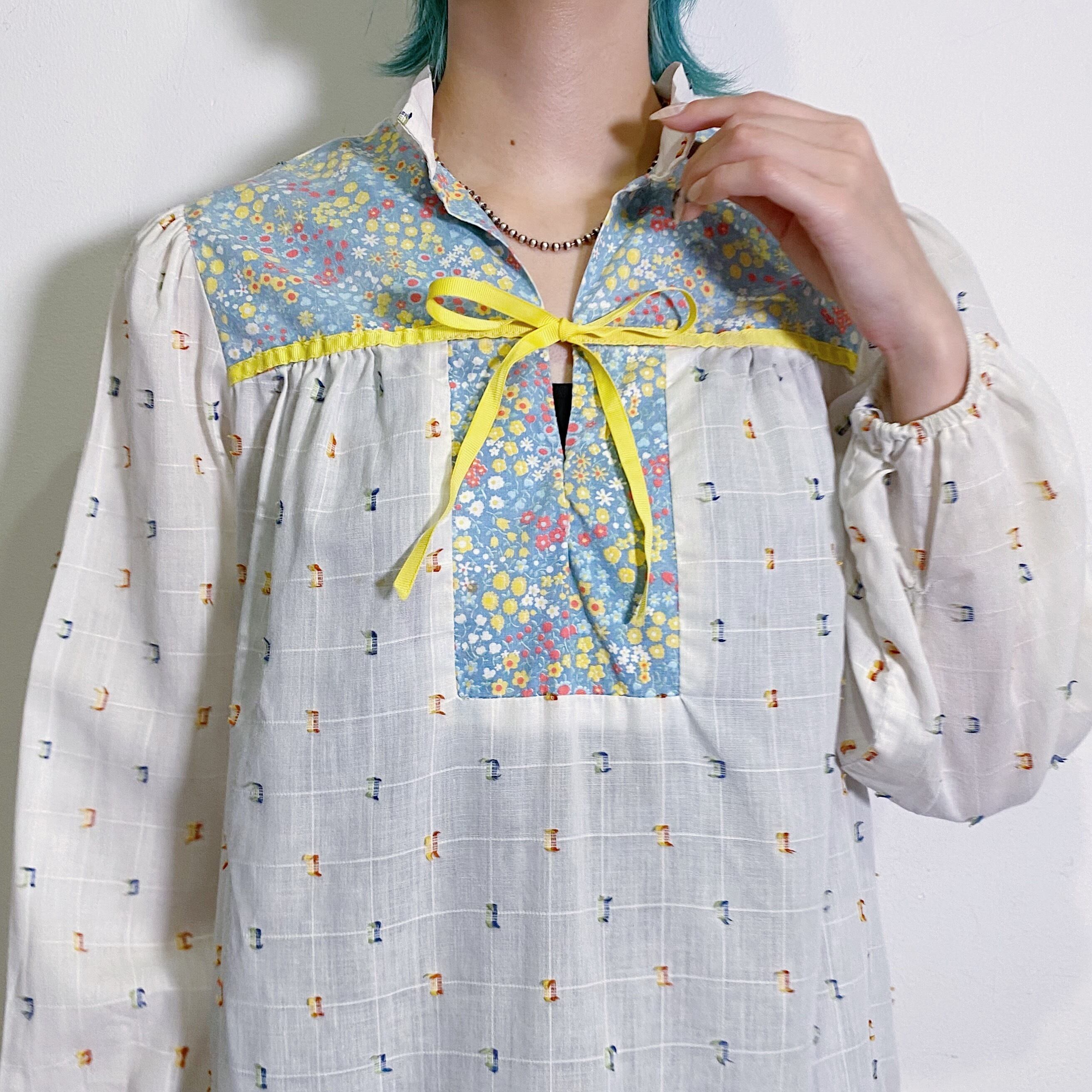 ハッピーな花柄とフロントのリボンテープが可愛い、70年代のトップスです。
