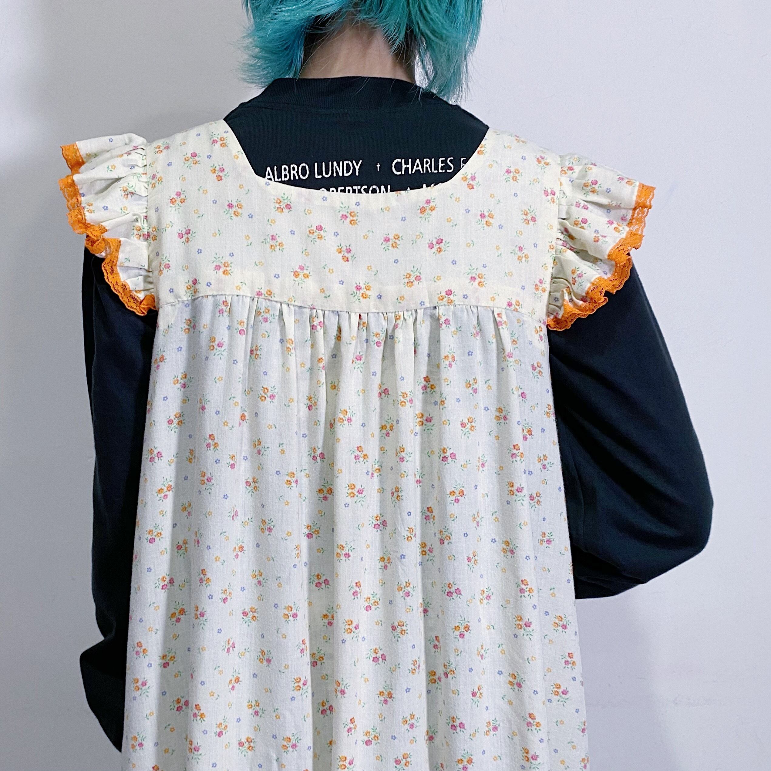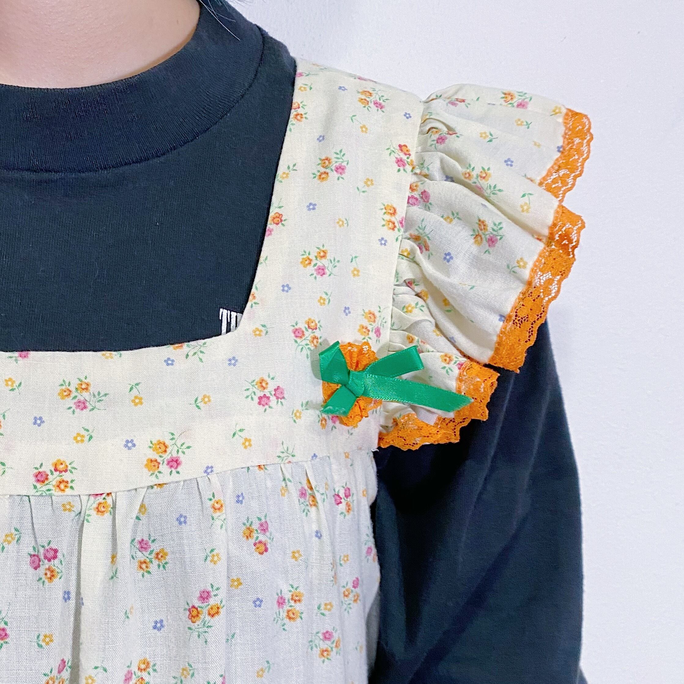 肩のオレンジのレースとフリルデザインが可愛い、70年代のロングワンピースです。