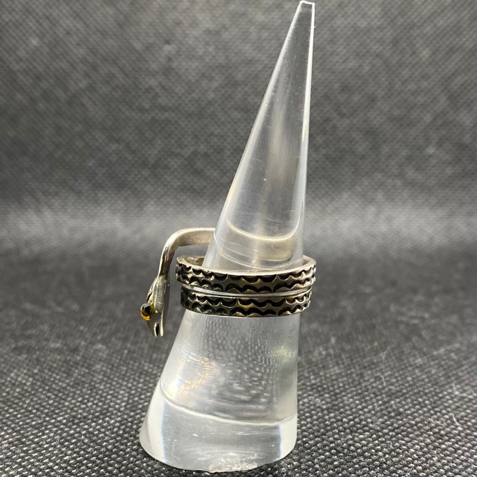 指にヘビがくるっと巻き付いたようなデザインがユニークで可愛い、925シルバーのリングです。