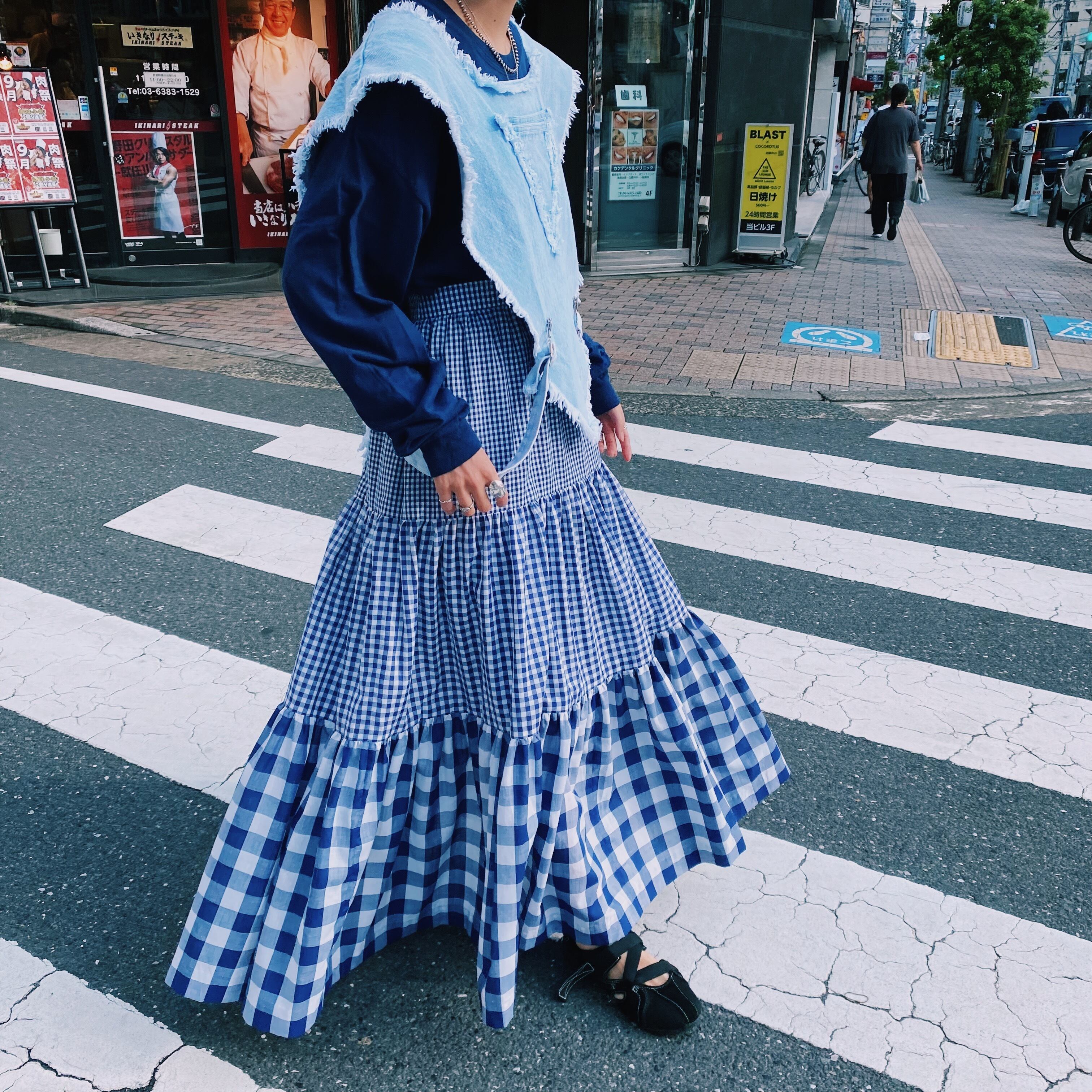 上から下にかけて段々とチェックの大きさが大きくなって、ティアードデザインになっているのが魅力の一枚。
