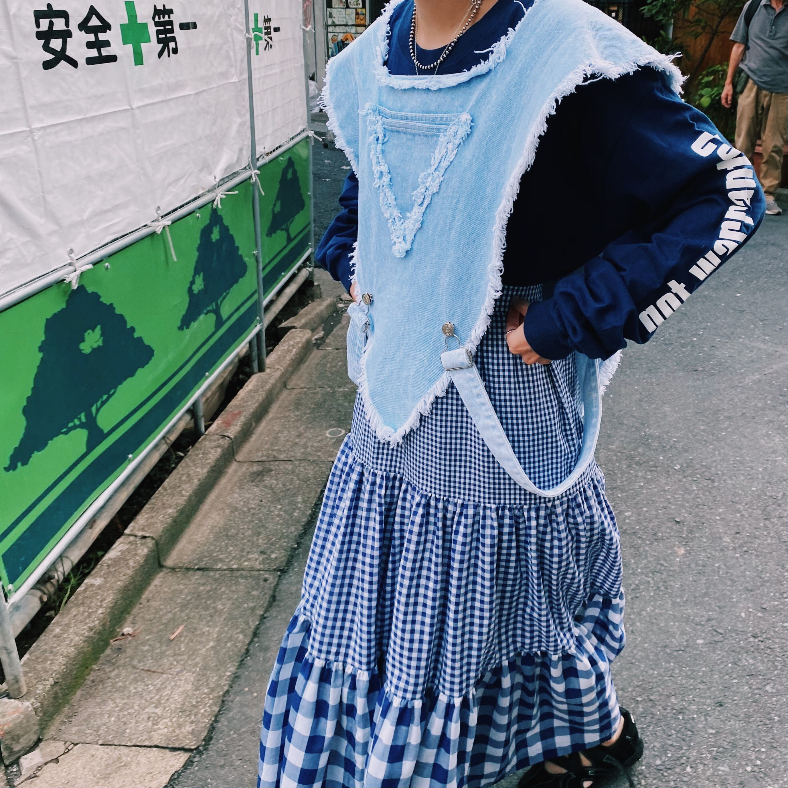 逆三角形のようなフォルムにポンチョのようなデザインがユニークな、デニムベストです。
