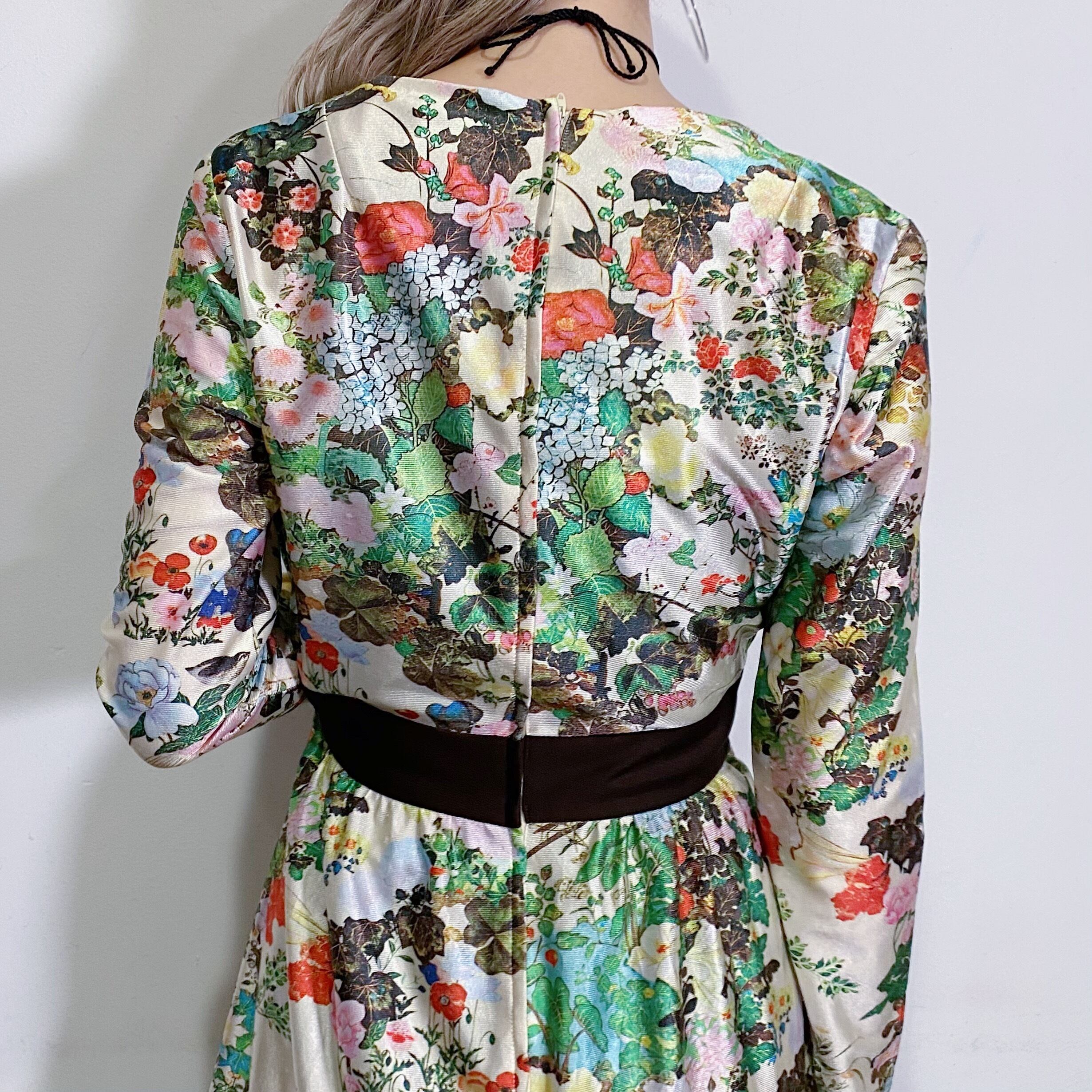 カラフルな配色の転写プリントのような花々がとっても素敵な、70年代のロングワンピースです。