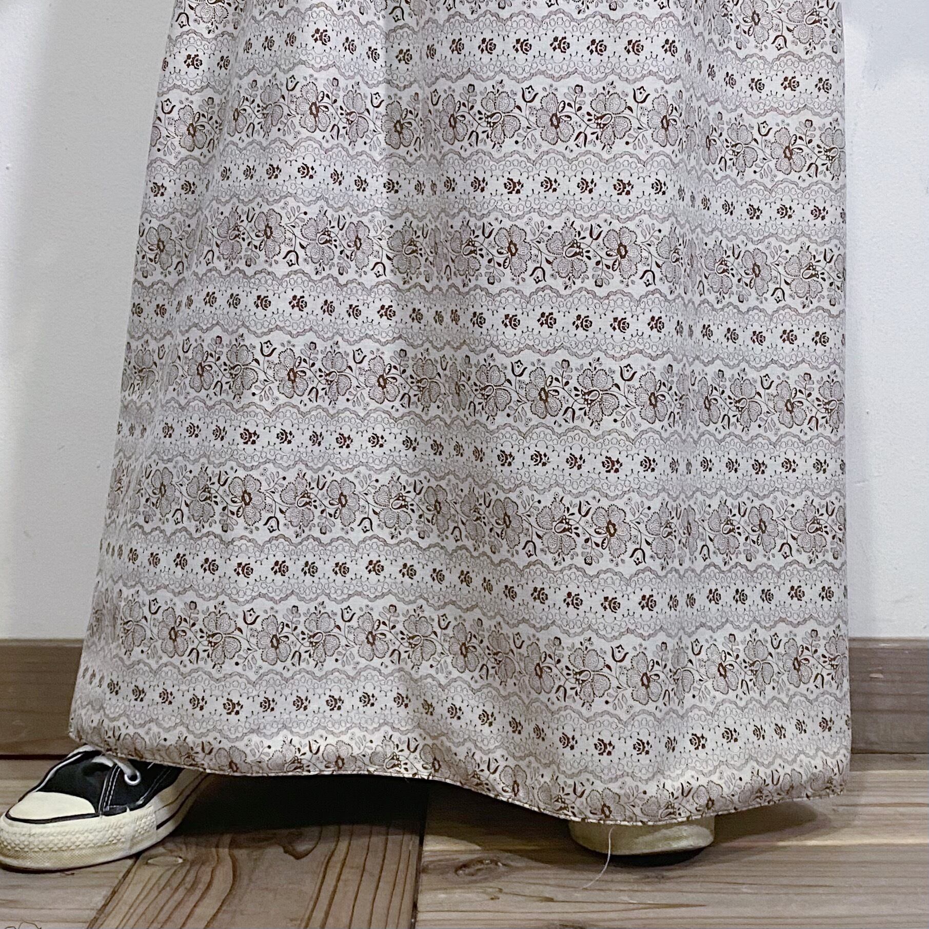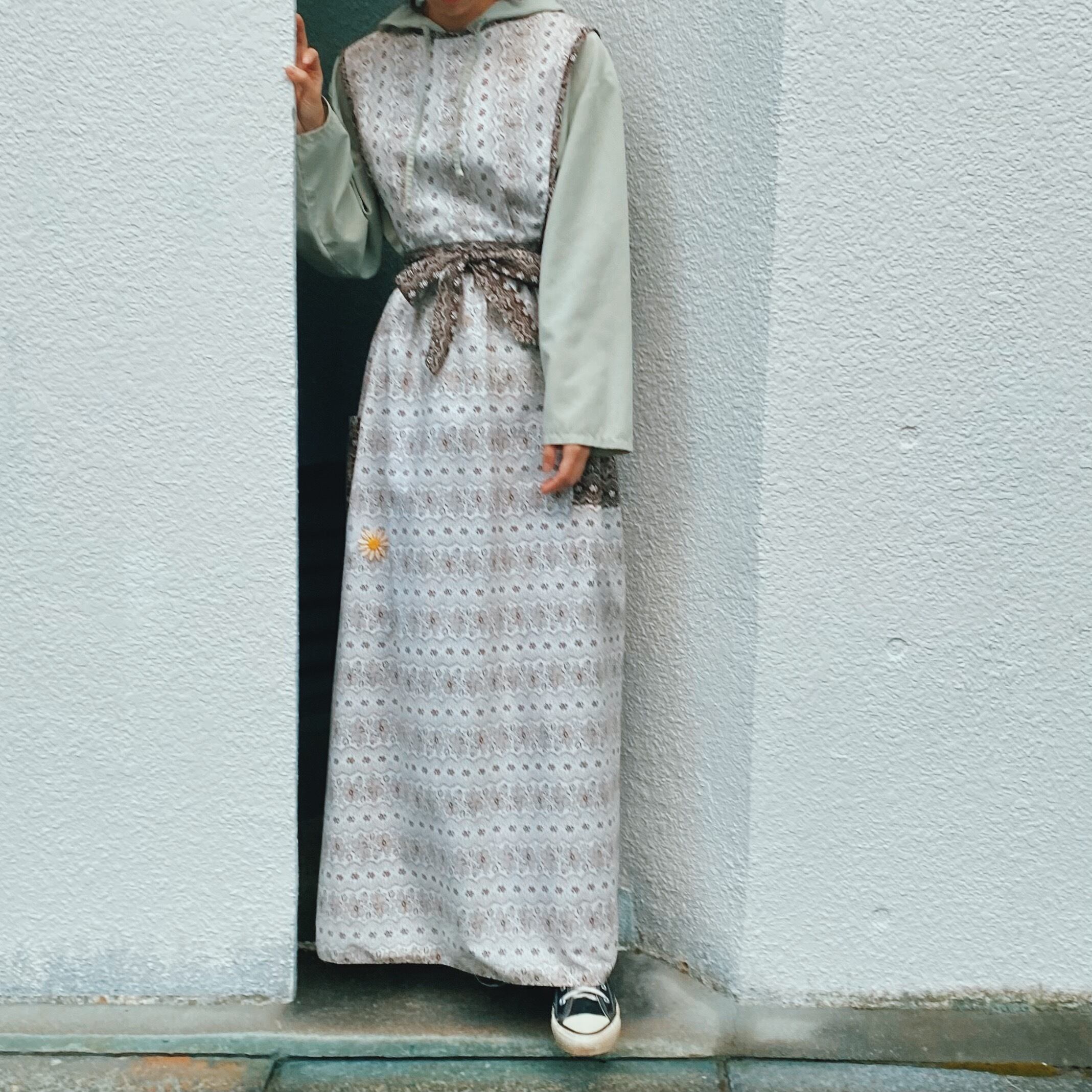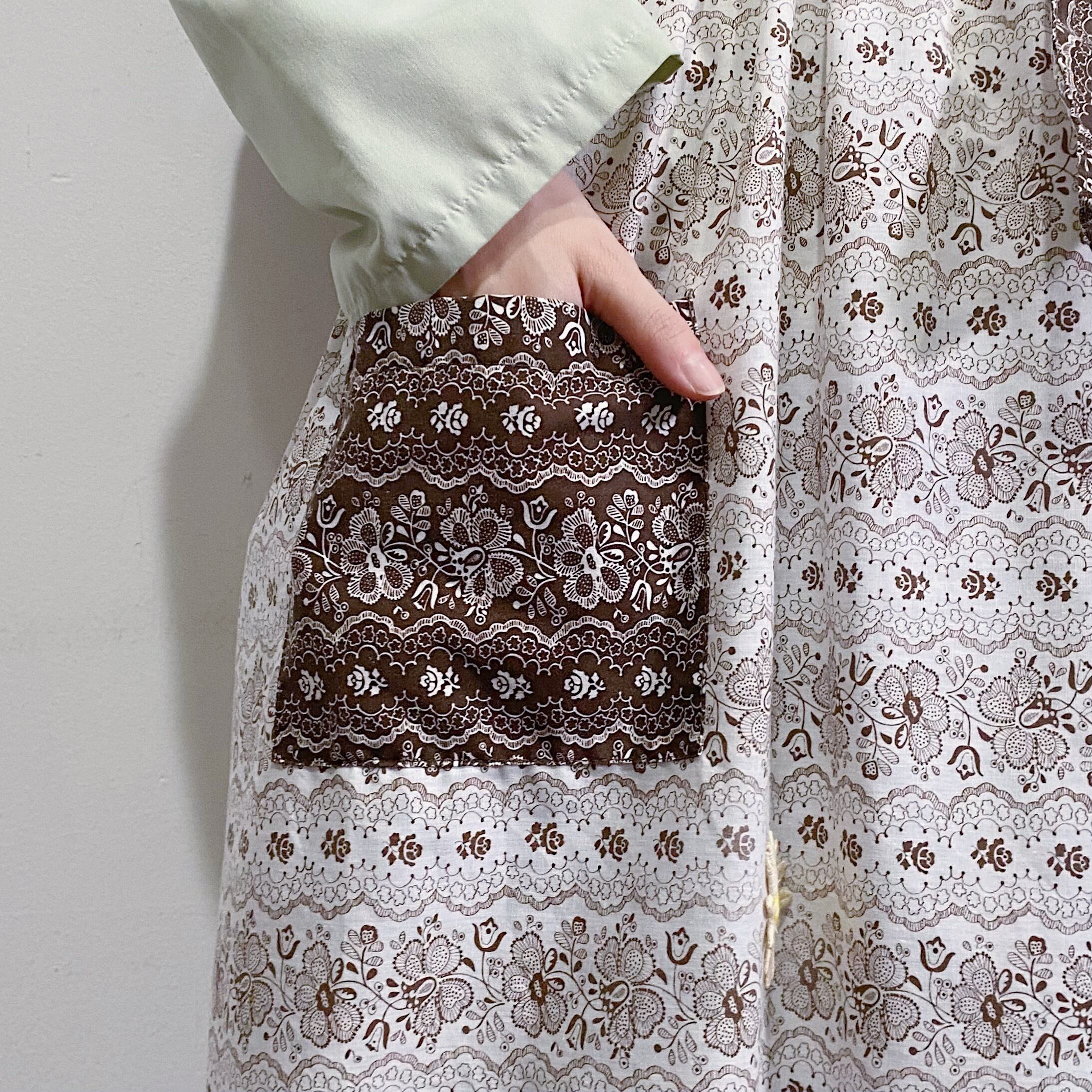 ホワイト×ブラウンの組み合わせが可愛い、70年代のエプロンワンピースです。