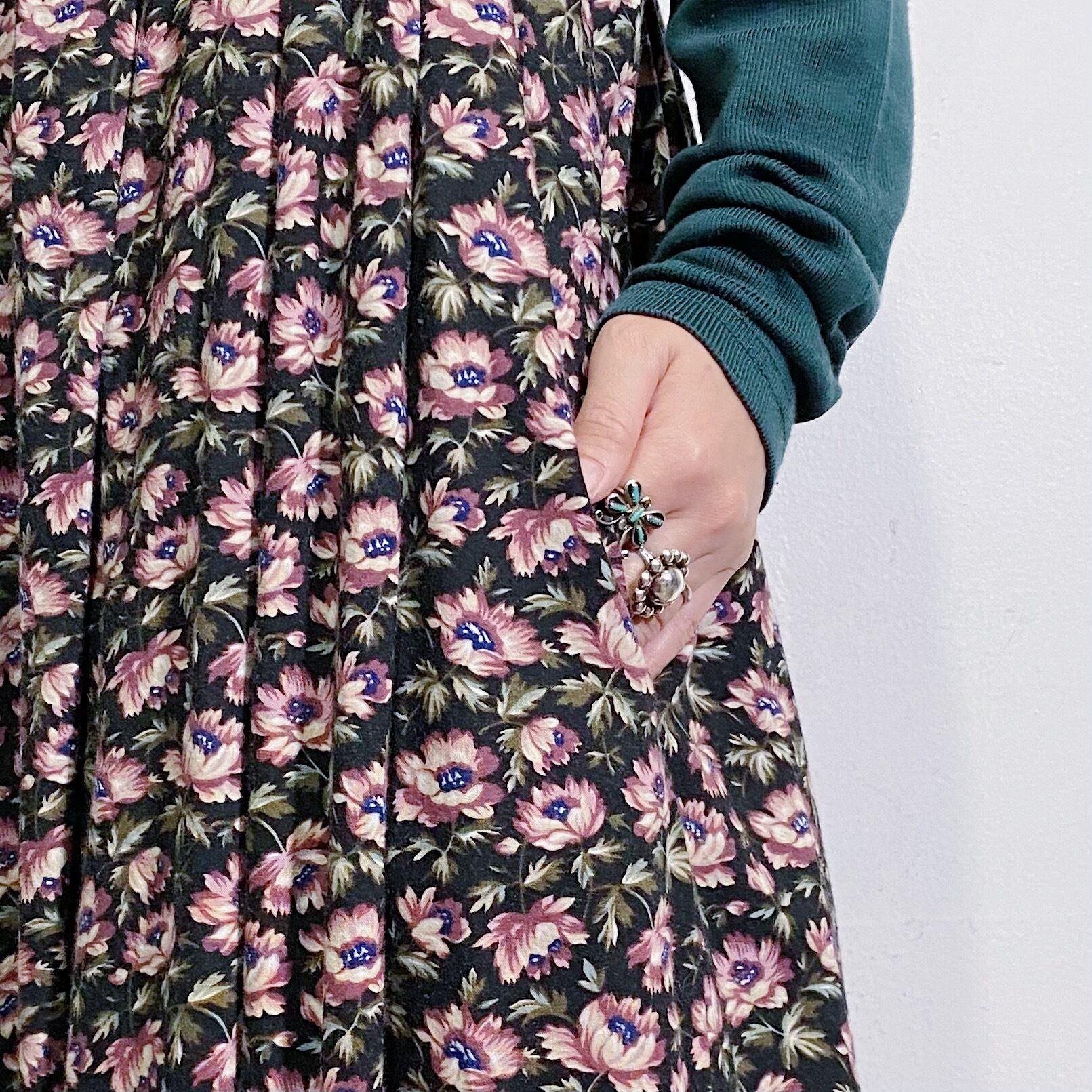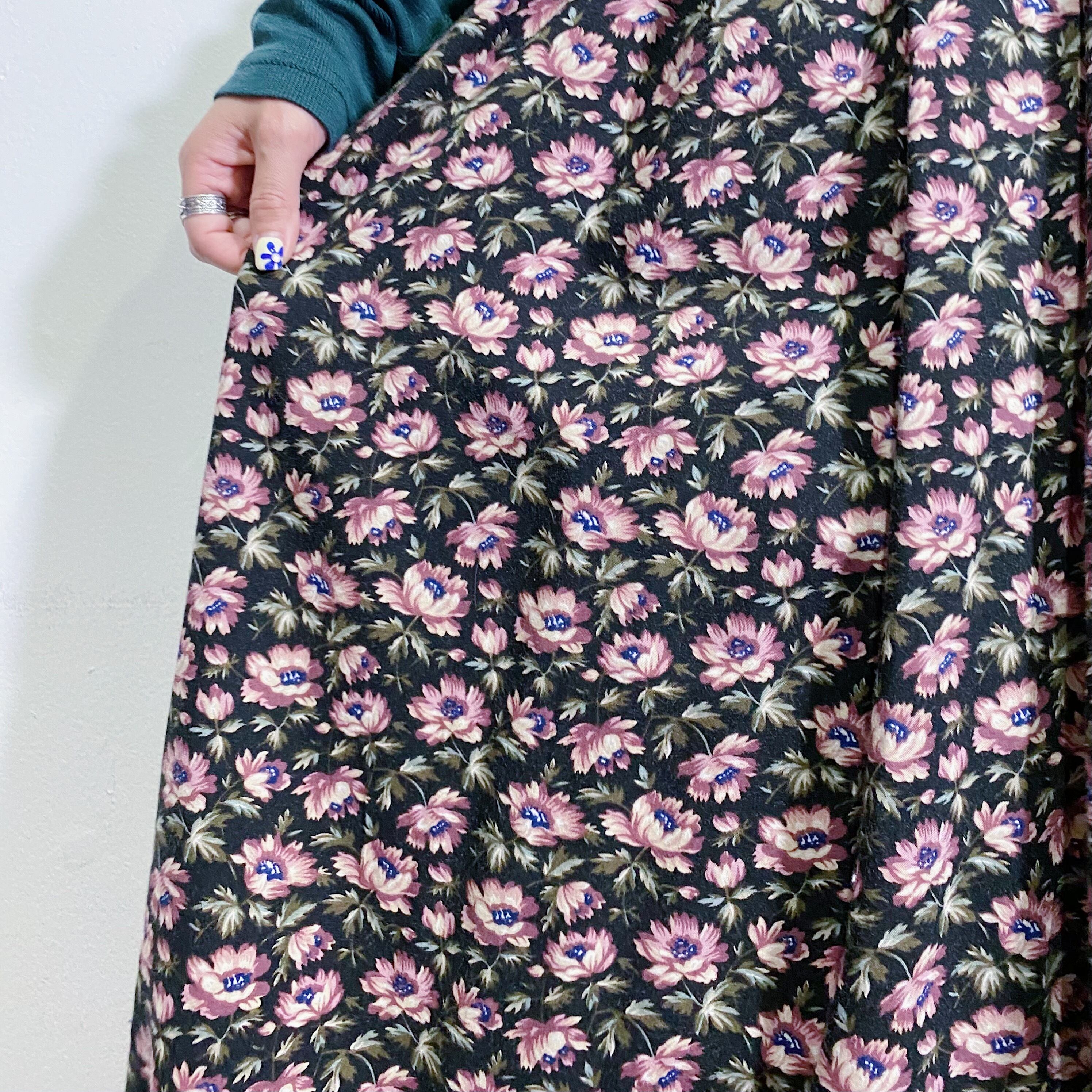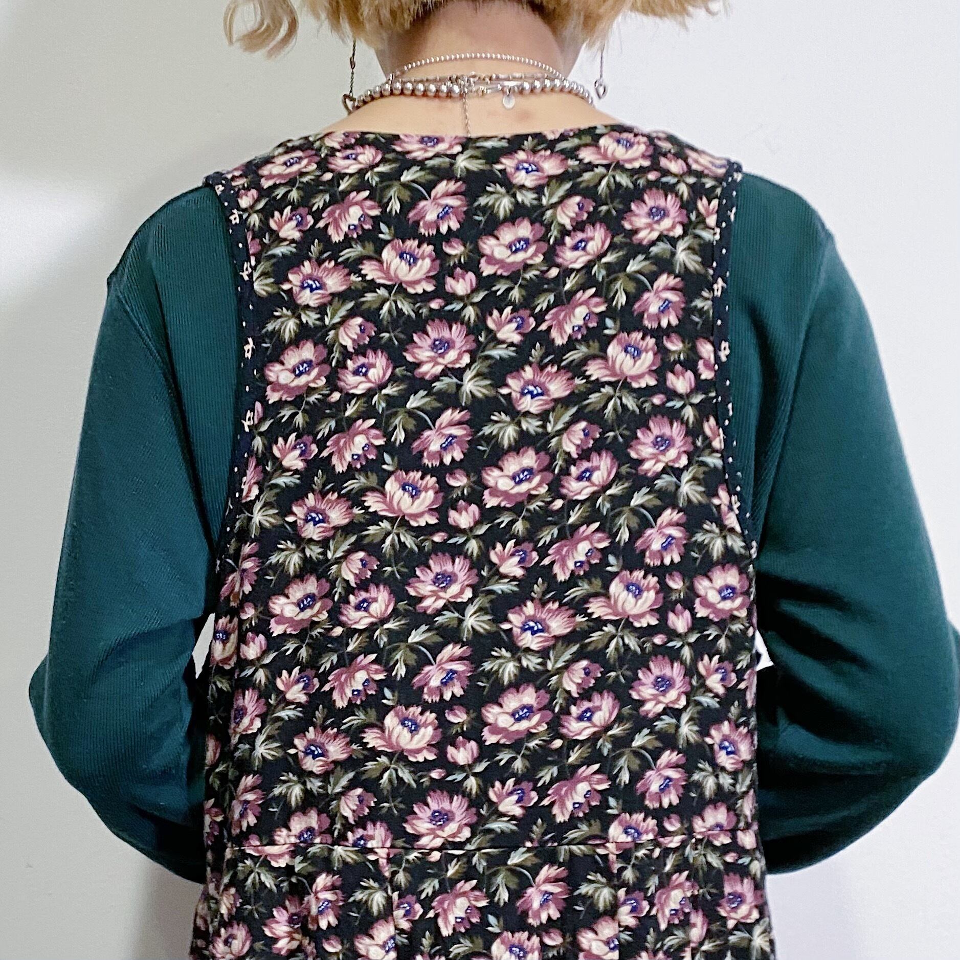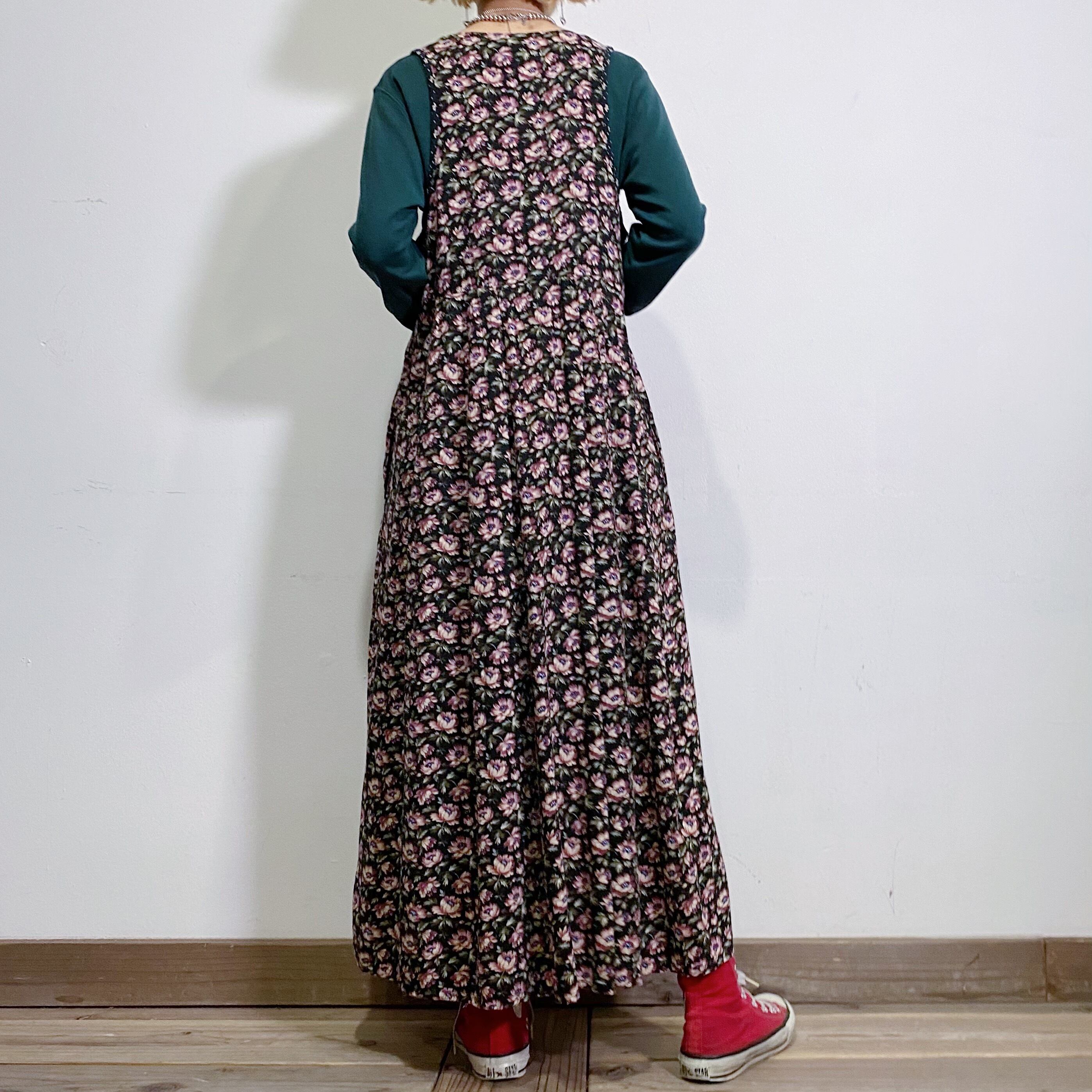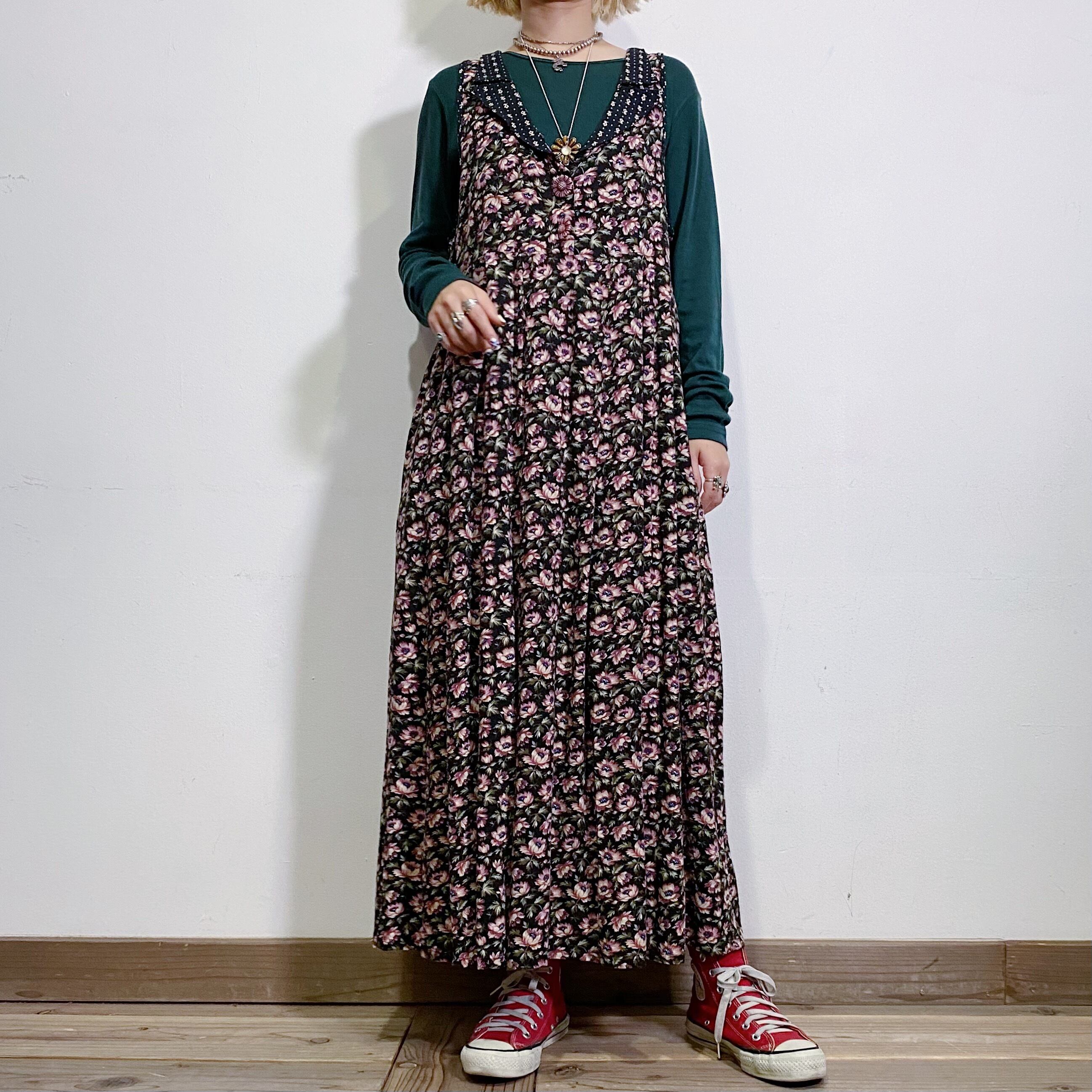 ブラックベースに花柄が映える、レーヨン混のジャンパーワンピースです。