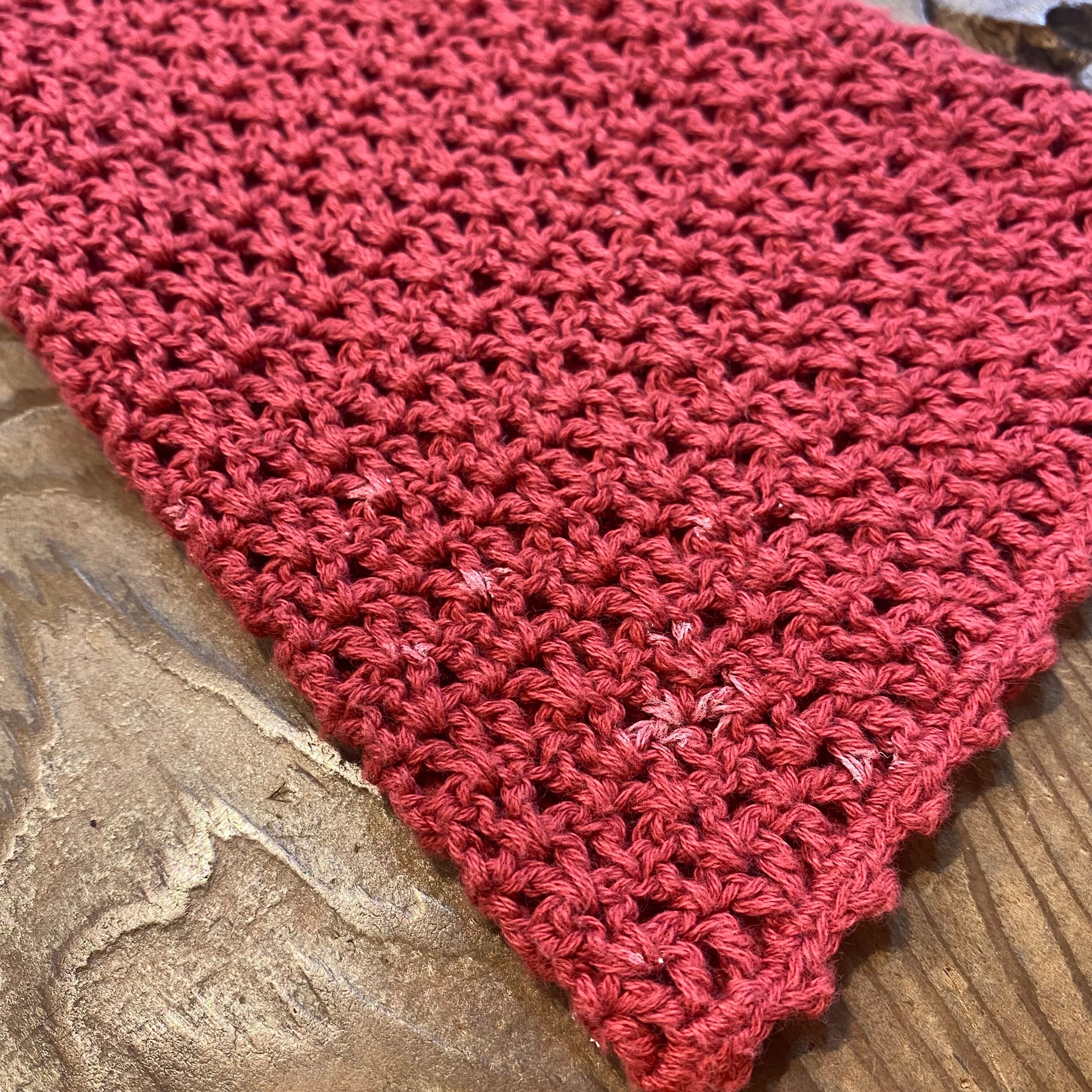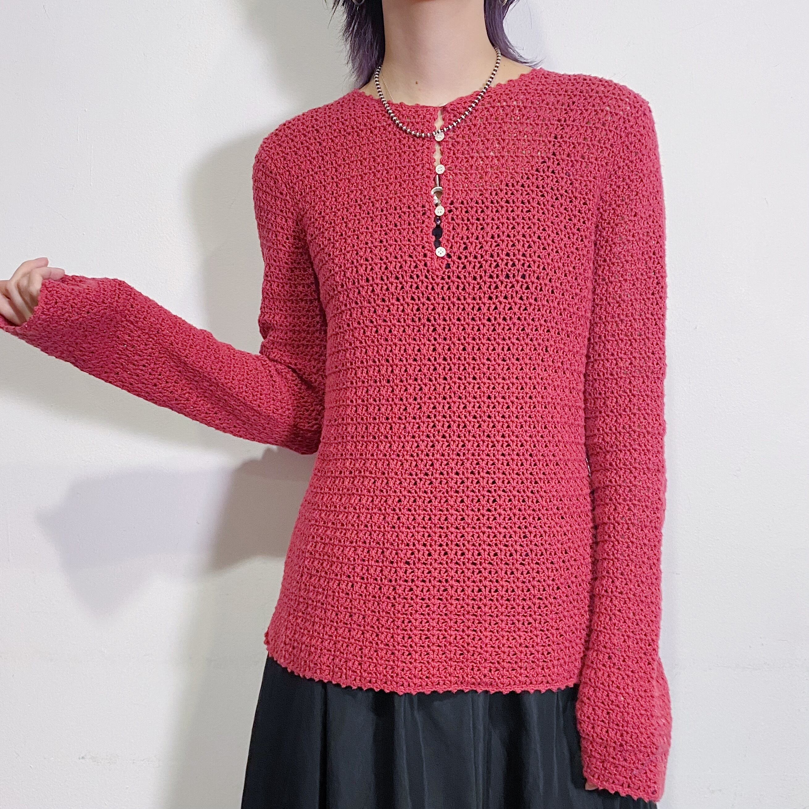 レッドとピンクの中間のような絶妙な色味が可愛い、クロシェトップスです。
