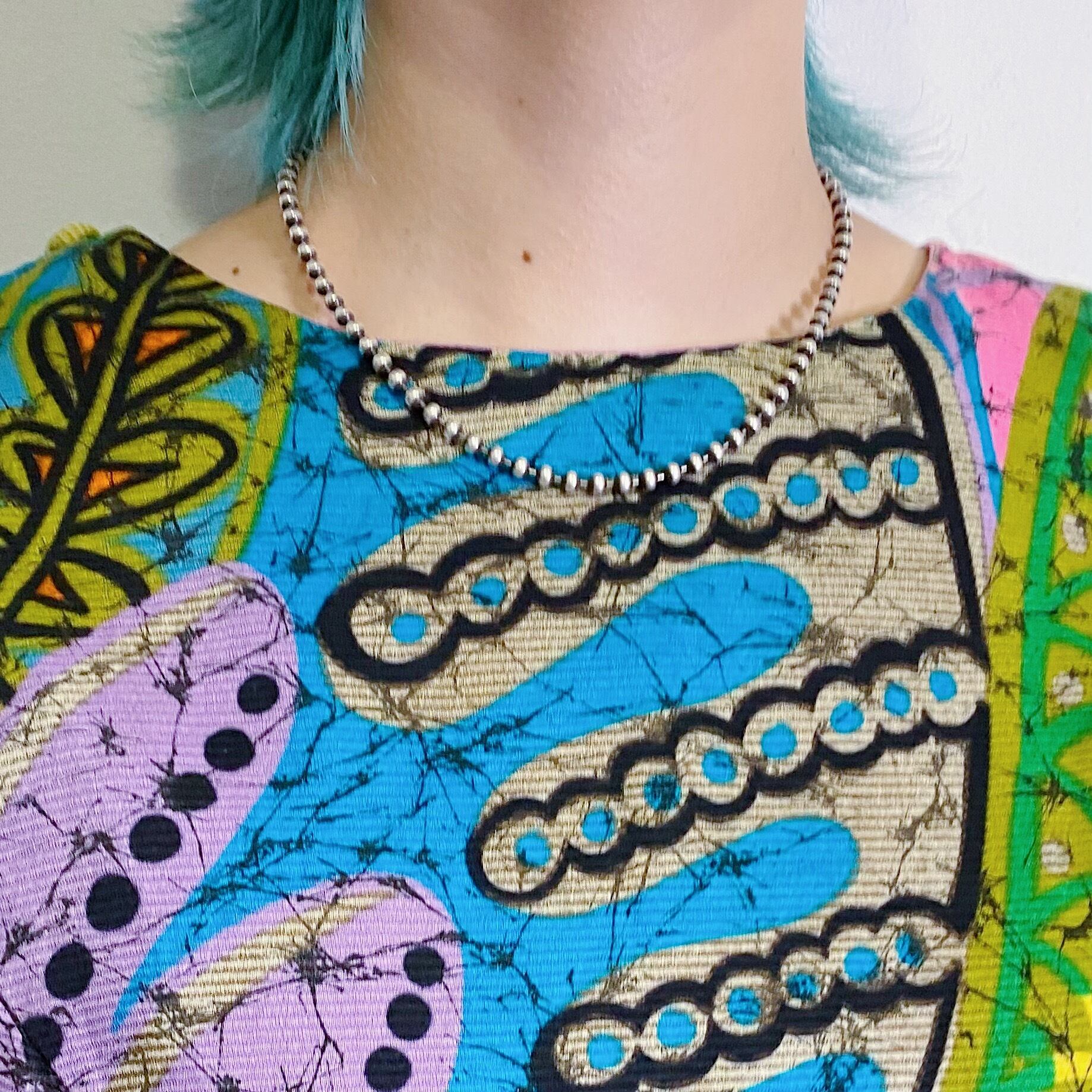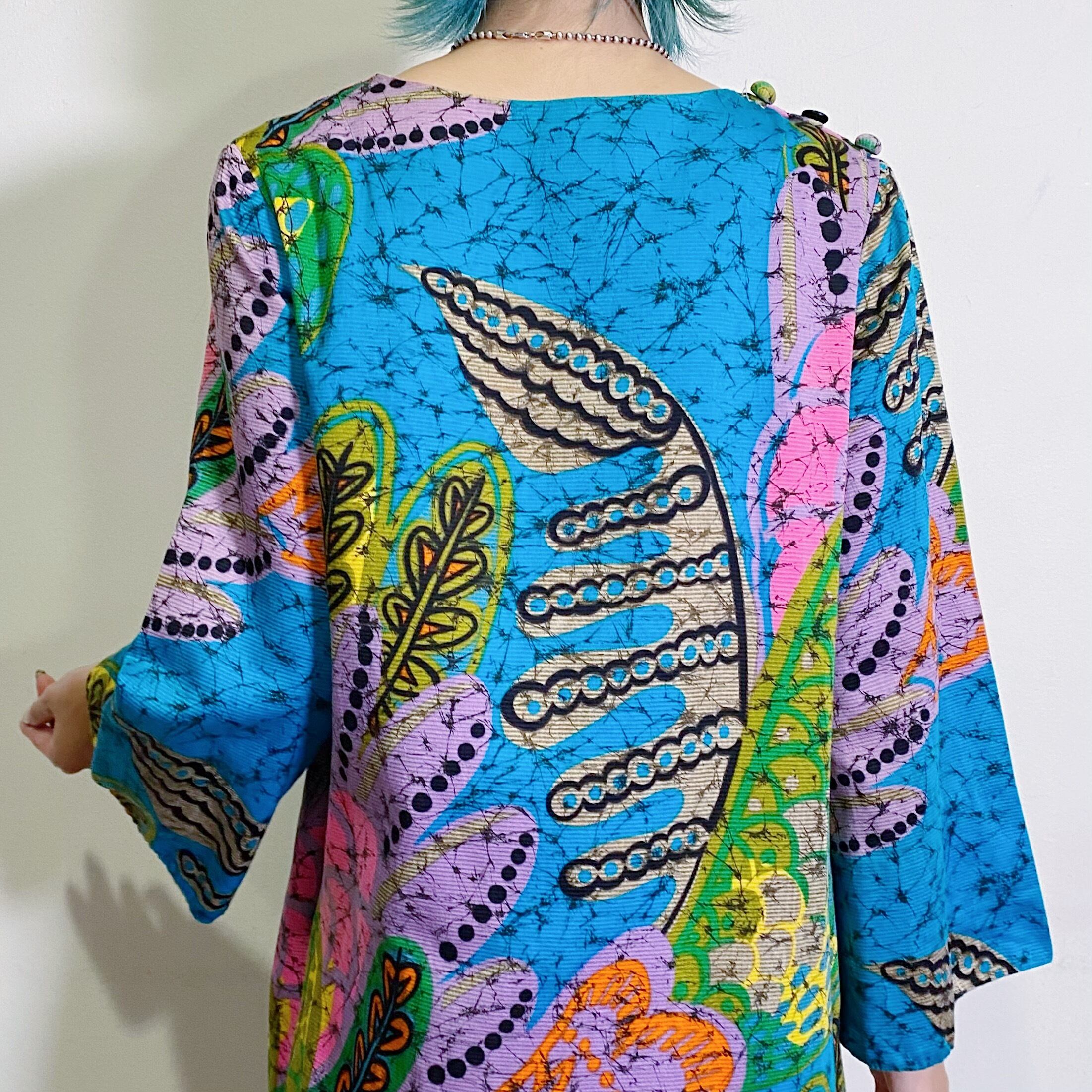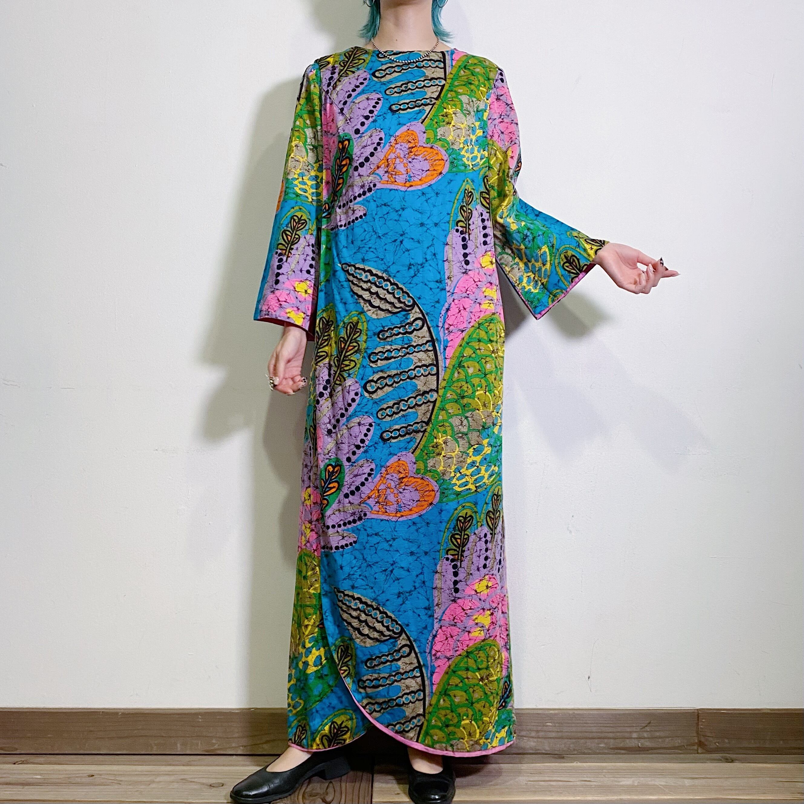 サックスブルーベースにカラフルな葉っぱのようなテキスタイルが可愛い、60年代のワンピースです。