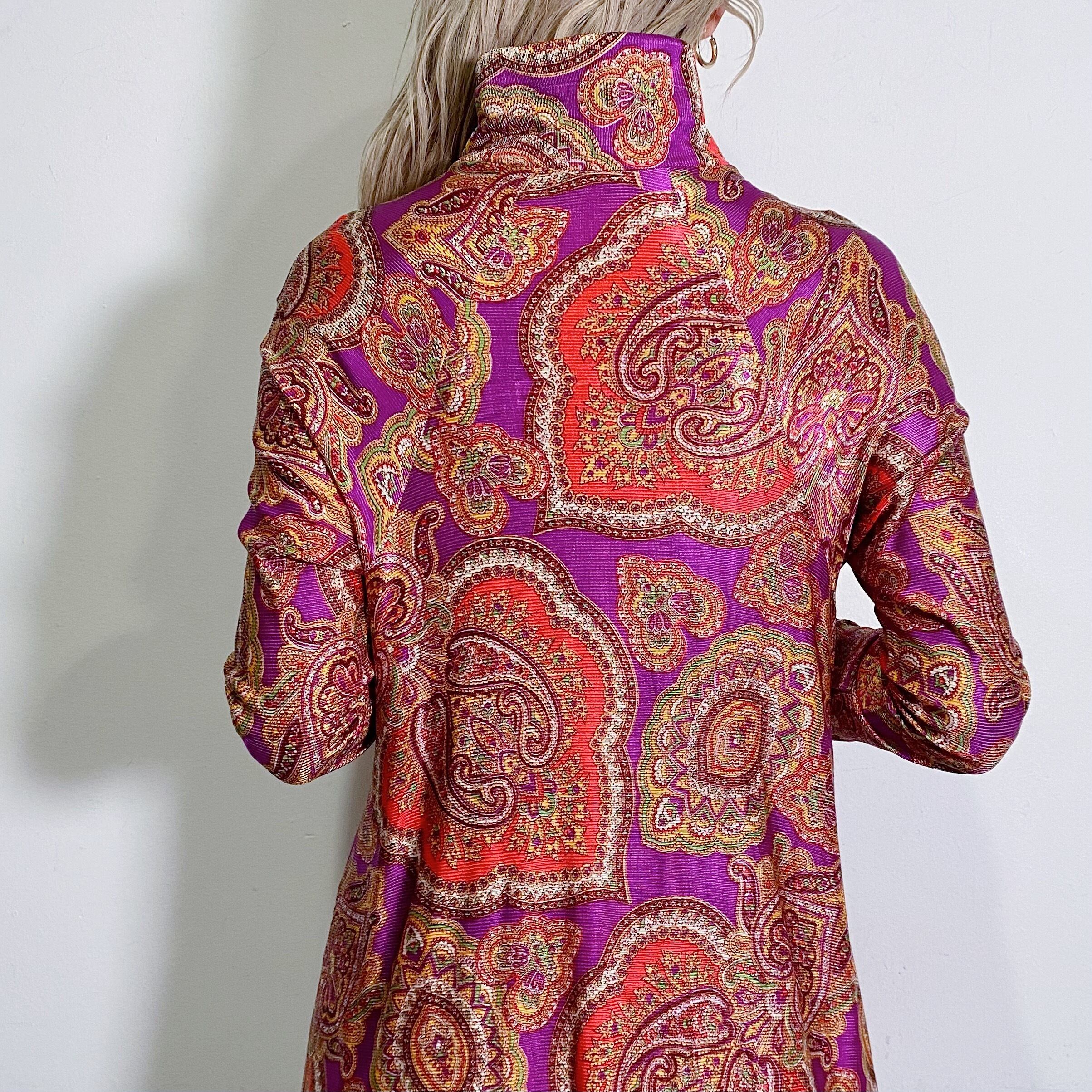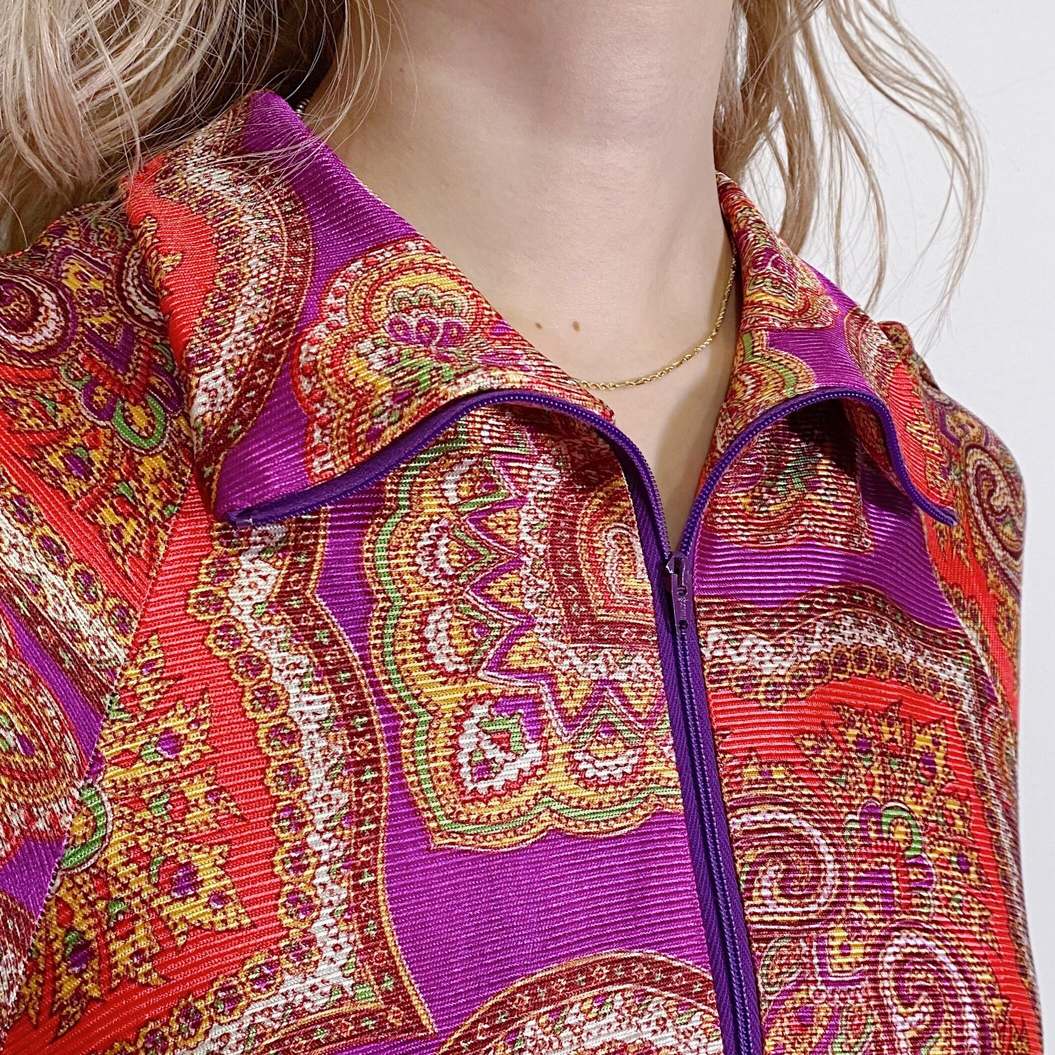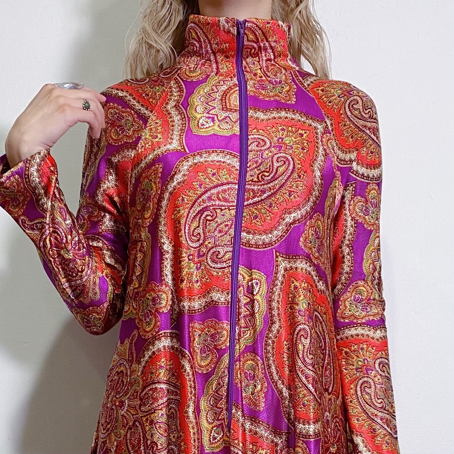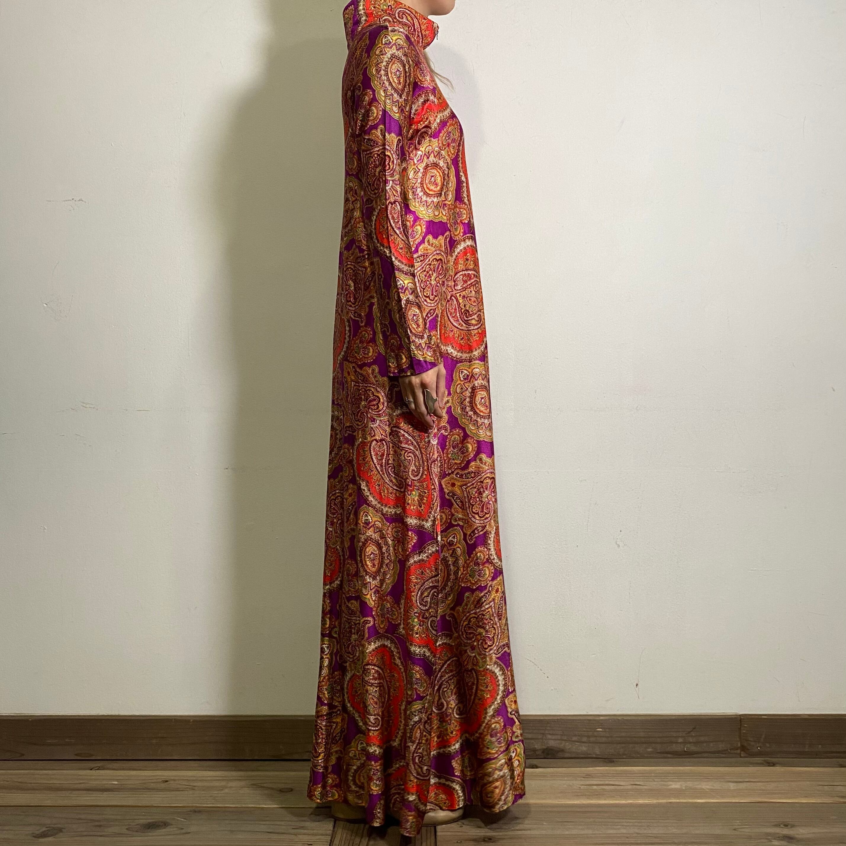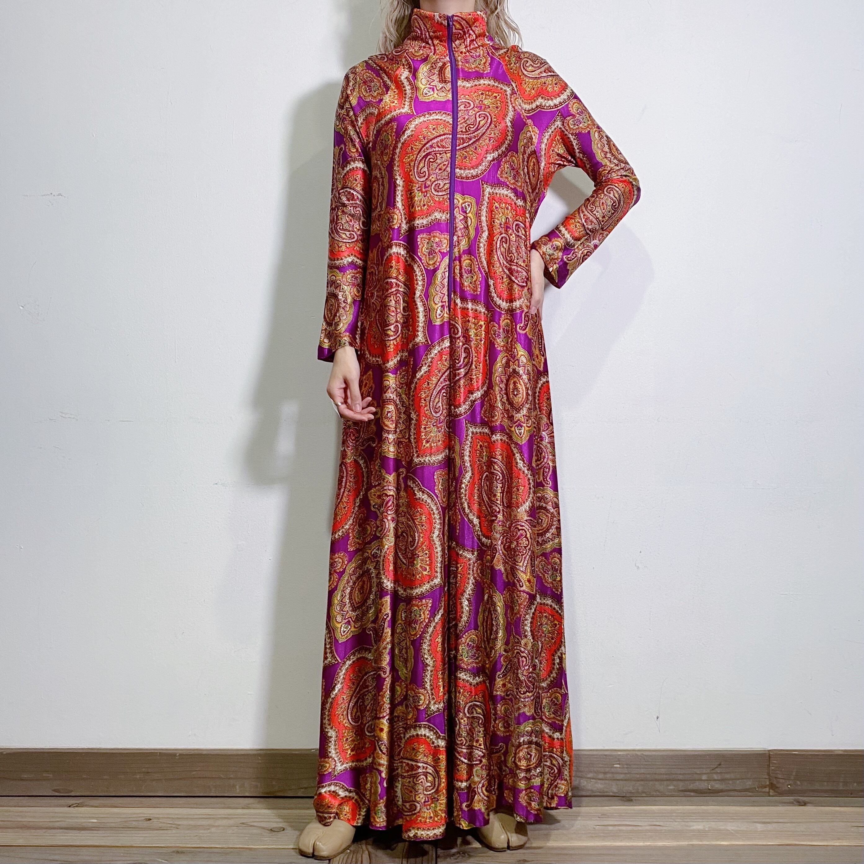 パープルとオレンジの色合いが可愛いサイケデリックなペイズリー柄の、70年代のロングワンピースです。