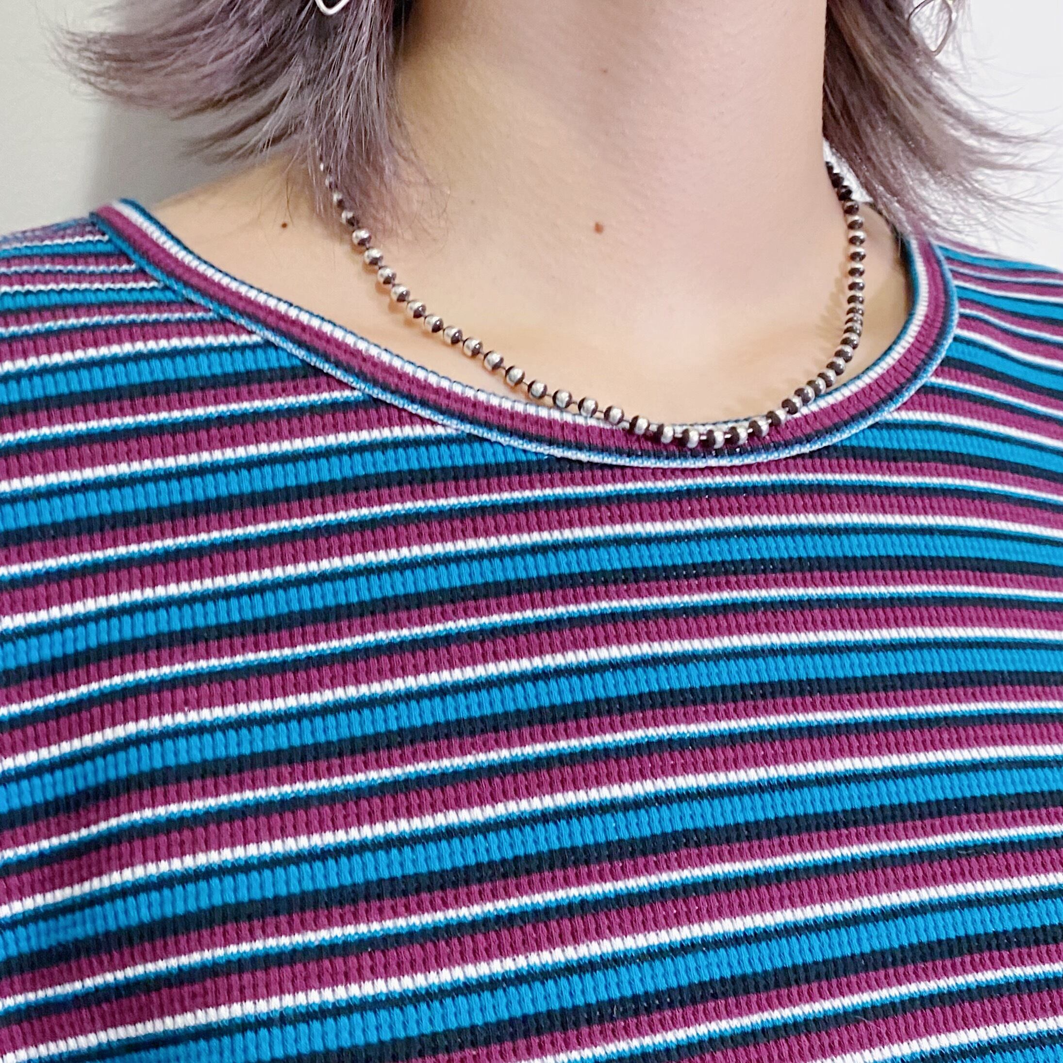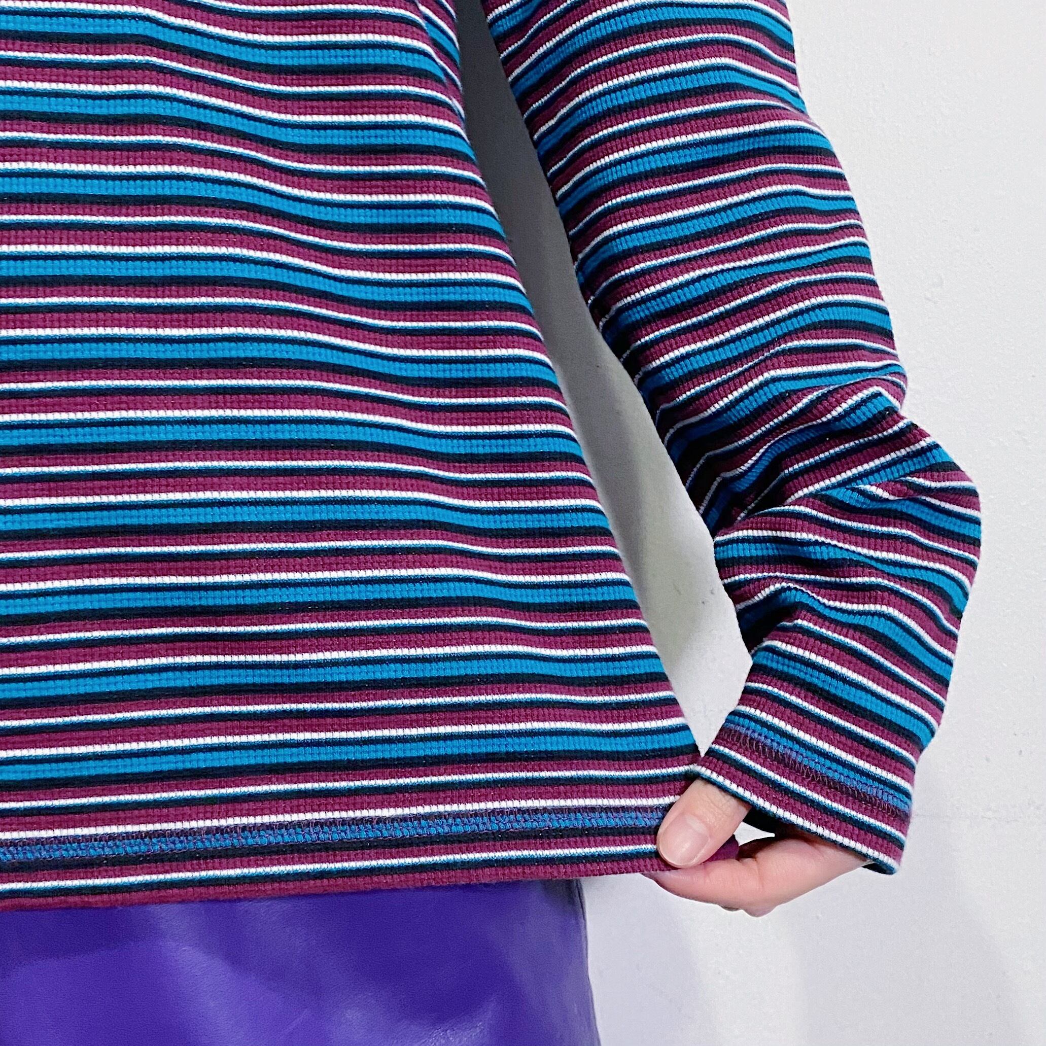 パープルとブルーの色合いが可愛い、マルチボーダーのトップスです。